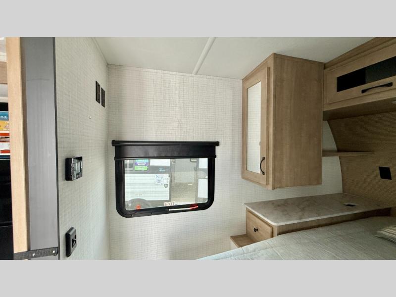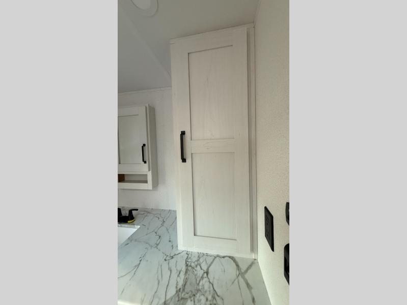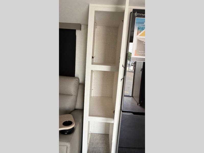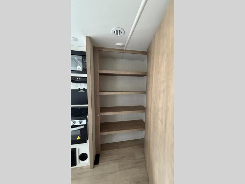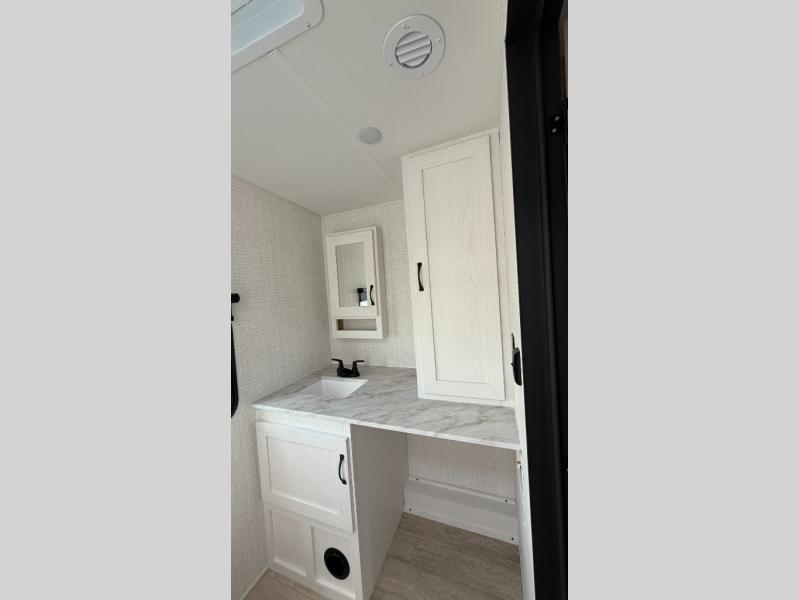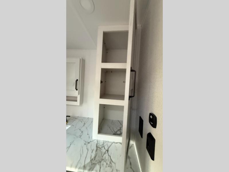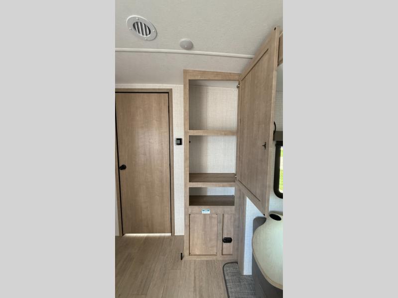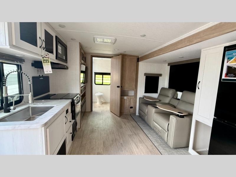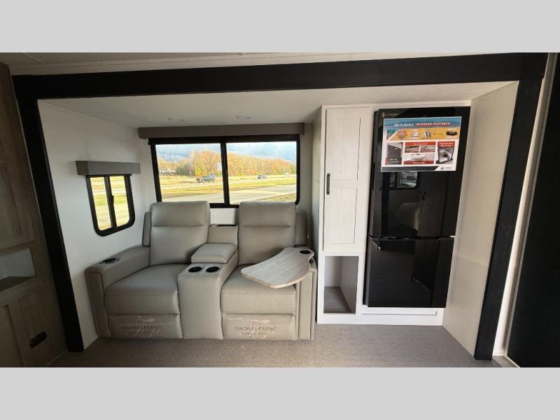 This couple's trailer is perfect for weekend trips to the campground. You can relax inside on the theater seats that are within a large slide out, and there is a hidden pantry behind the entertainment center to keep snacks stocked. The full rear bathroom gives you the space you need as well as a shower with a seat plus washer and dryer prep. And the front bedroom provides a queen bed, dual wardrobes and privacy.