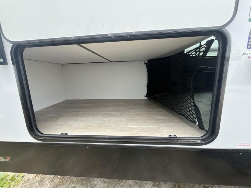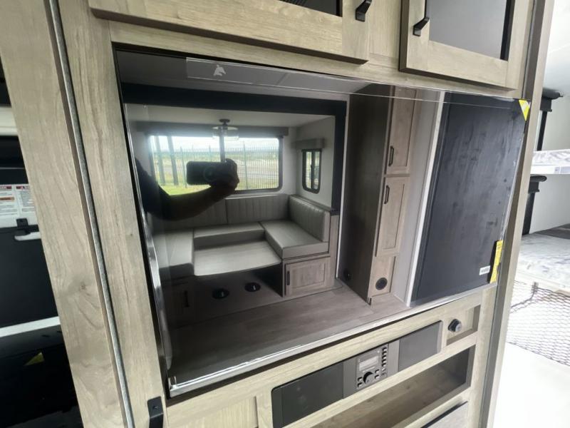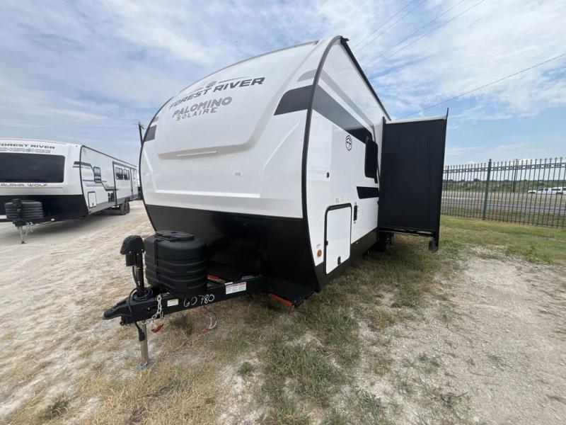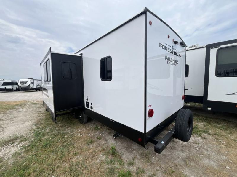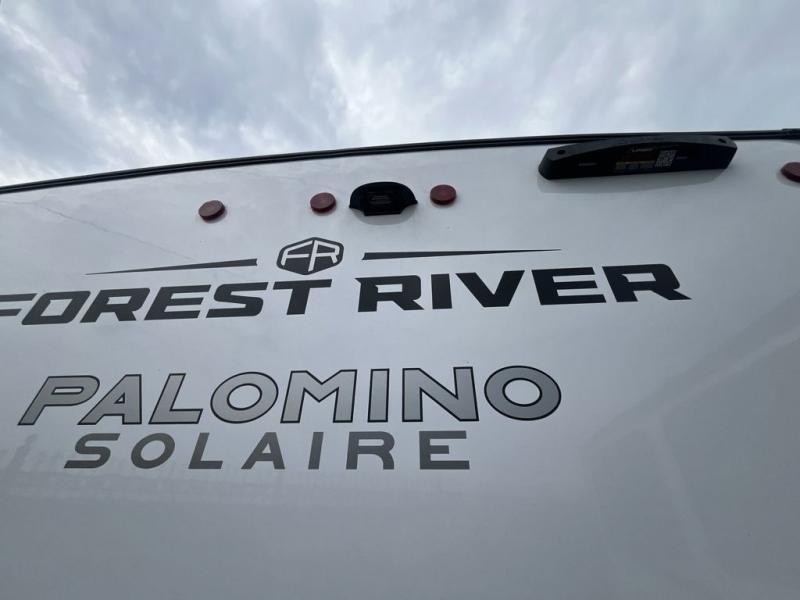Each SolAire travel trailer by Palomino features a white gel coat exterior and an aluminum superstructure frame for lightweight towing. You will love having a power tongue jack for easy set up, plus slam latch baggage doors with magnets to make unloading easier than ever. There is also a power awning with LED lights and aluminum wheels included on the exterior. Each SolAire is constructed to last with Azdel composite, a fully laminated rear wall and roof, plus a fully enclosed and heated underbelly. The interior includes roller shades and kitchen backsplash, USB ports to keep your electronics charged, a Bluetooth stereo with speakers, and many more stand-out features!