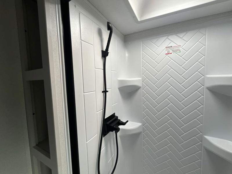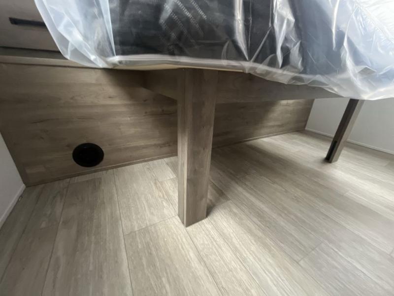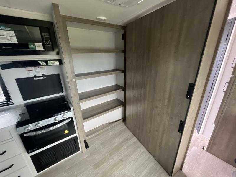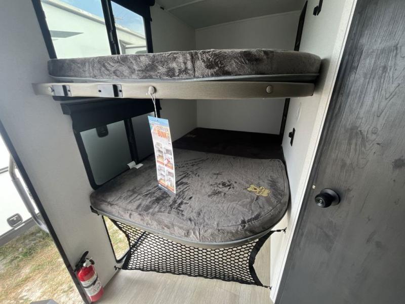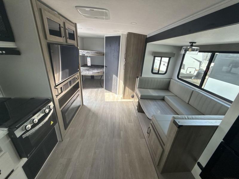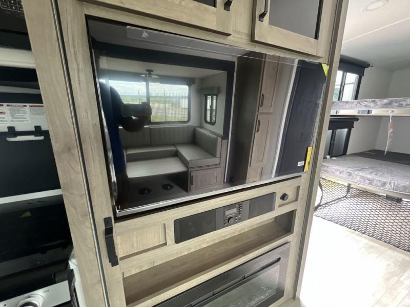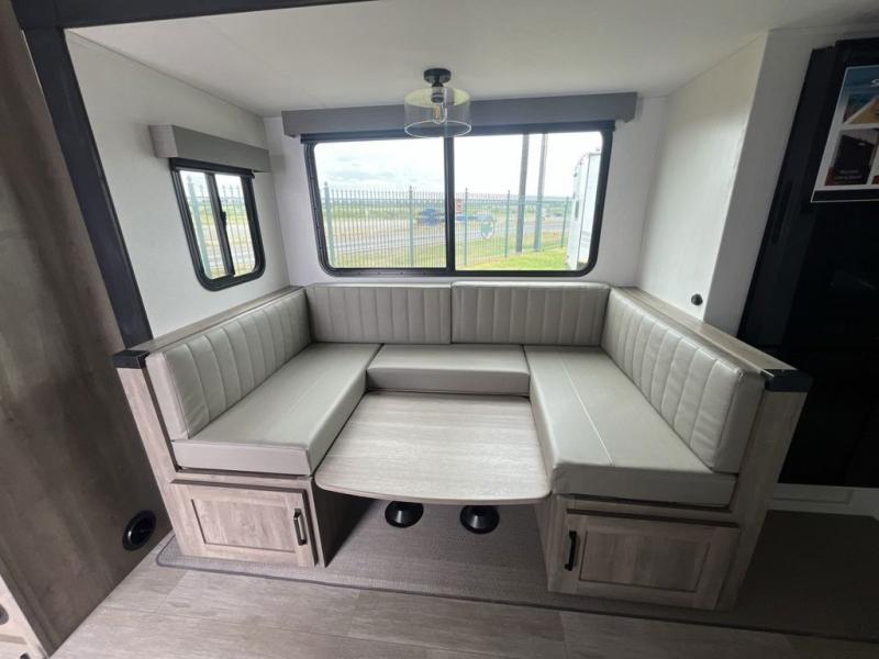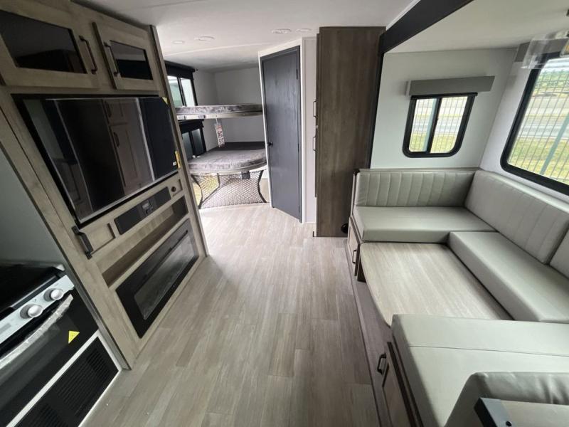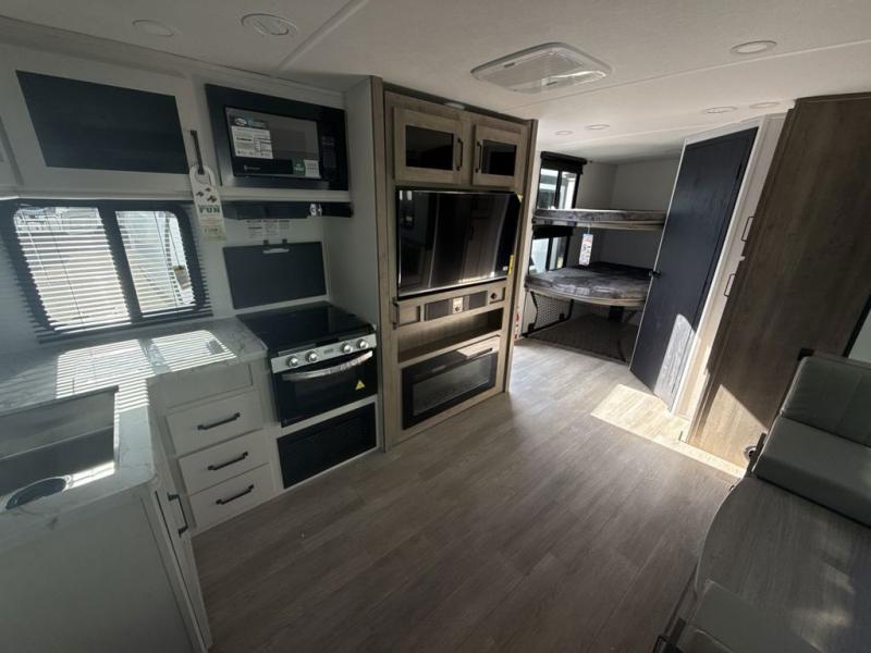 Your friends and family will love camping with you in this trailer that offers sleeping space for eight with the queen bed, the double-size bunks and the U-shaped dinette once it is easily set up for sleeping space. The cook will love the full kitchen with its cooktop, microwave, electric refrigerator plus hidden pantry behind the entertainment center. A full bath with a 30" x 36" shower will let you freshen up each day, and you'll love having your own space in the front private bedroom!