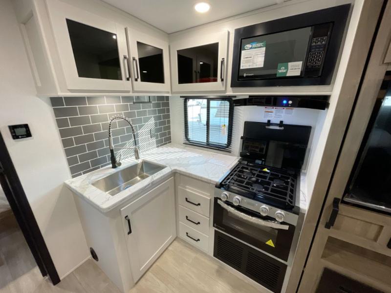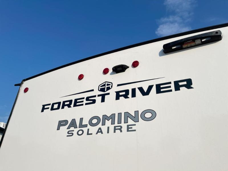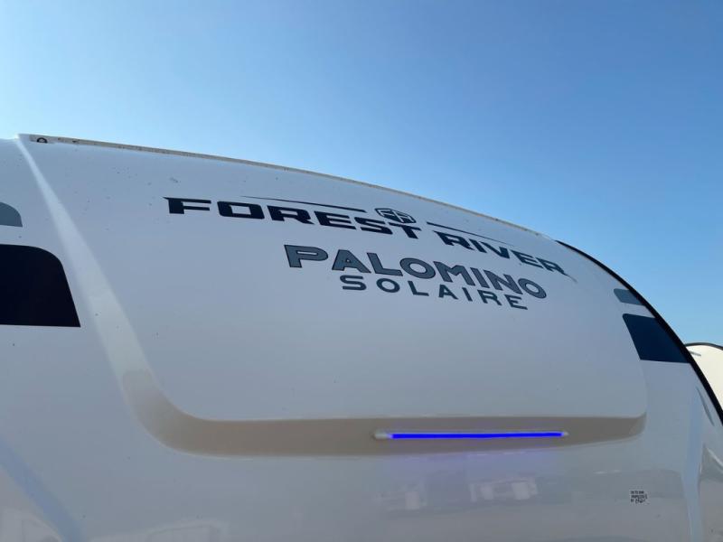 Each SolAire travel trailer by Palomino features a white gel coat exterior and an aluminum superstructure frame for lightweight towing. You will love having a power tongue jack for easy set up, plus slam latch baggage doors with magnets to make unloading easier than ever. There is also a power awning with LED lights and aluminum wheels included on the exterior. Each SolAire is constructed to last with Azdel composite, a fully laminated rear wall and roof, plus a fully enclosed and heated underbelly. The interior includes roller shades and kitchen backsplash, USB ports to keep your electronics charged, a Bluetooth stereo with speakers, and many more stand-out features!