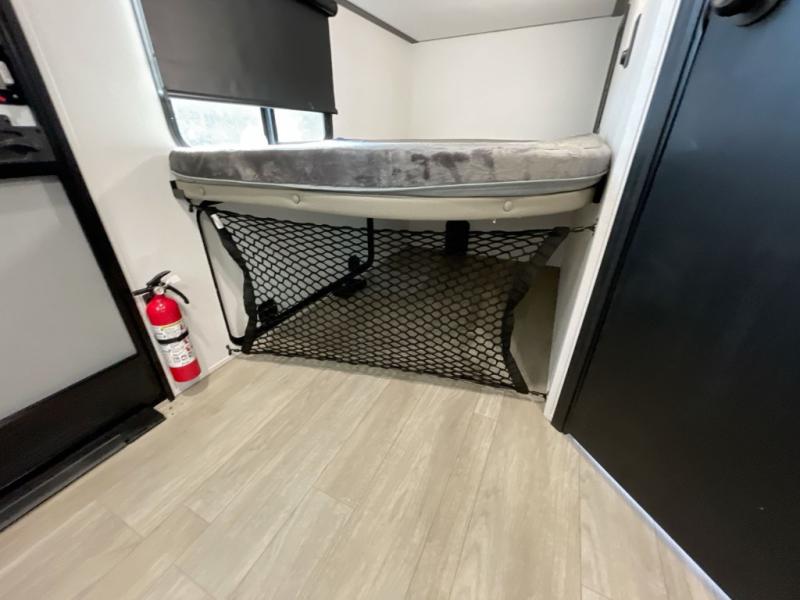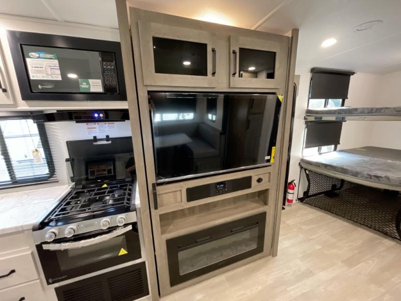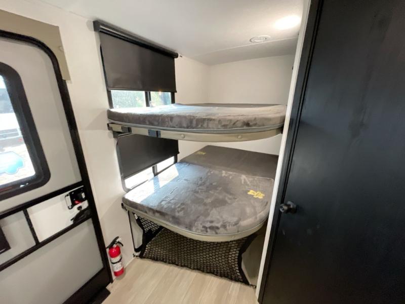 Your friends and family will love camping with you in this trailer that offers sleeping space for eight with the queen bed, the double-size bunks and the U-shaped dinette once it is easily set up for sleeping space. The cook will love the full kitchen with its cooktop, microwave, electric refrigerator plus hidden pantry behind the entertainment center. A full bath with a 30" x 36" shower will let you freshen up each day, and you'll love having your own space in the front private bedroom!