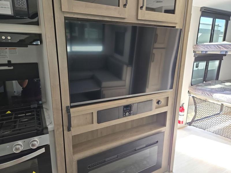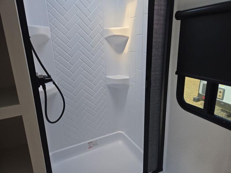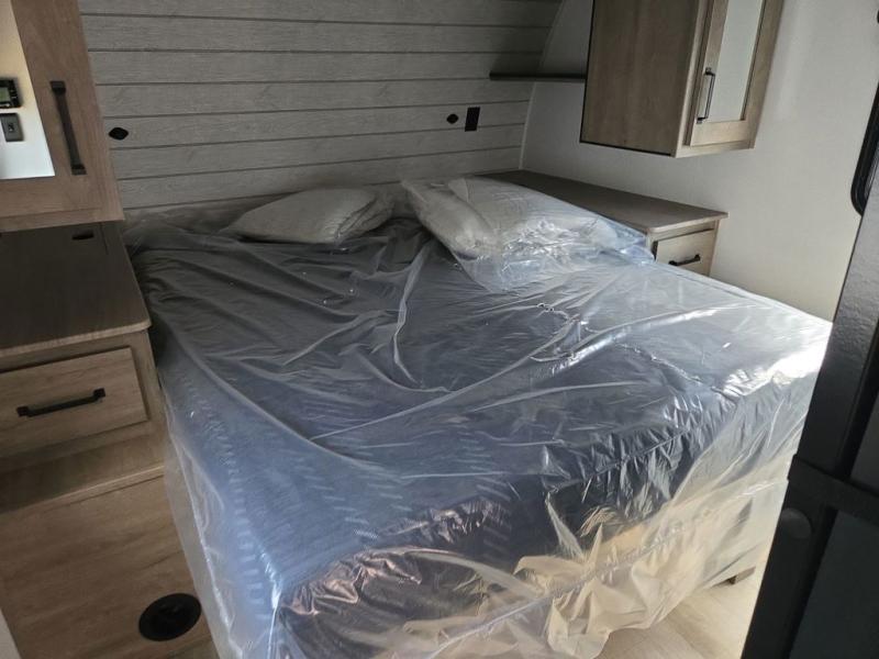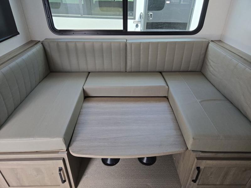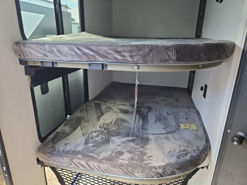 Your friends and family will love camping with you in this trailer that offers sleeping space for eight with the queen bed, the double-size bunks and the U-shaped dinette once it is easily set up for sleeping space. The cook will love the full kitchen with its cooktop, microwave, electric refrigerator plus hidden pantry behind the entertainment center. A full bath with a 30" x 36" shower will let you freshen up each day, and you'll love having your own space in the front private bedroom!