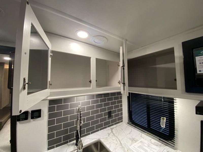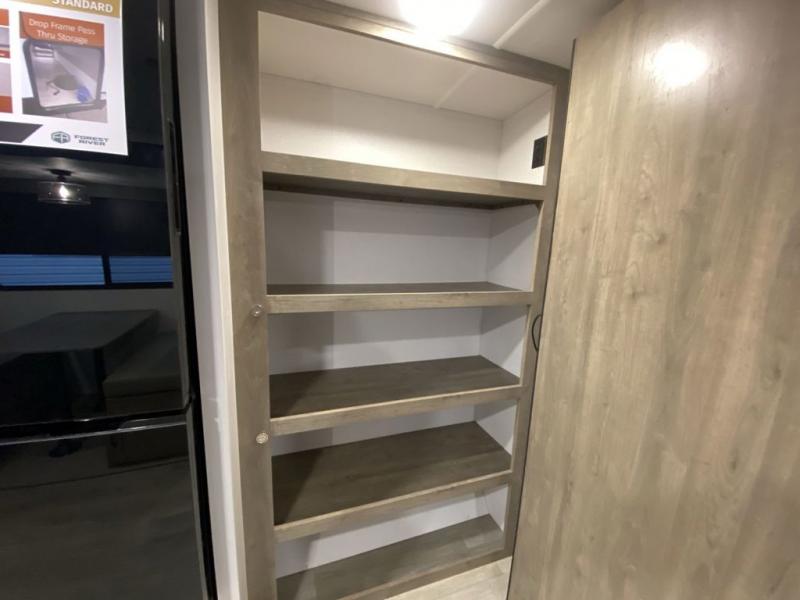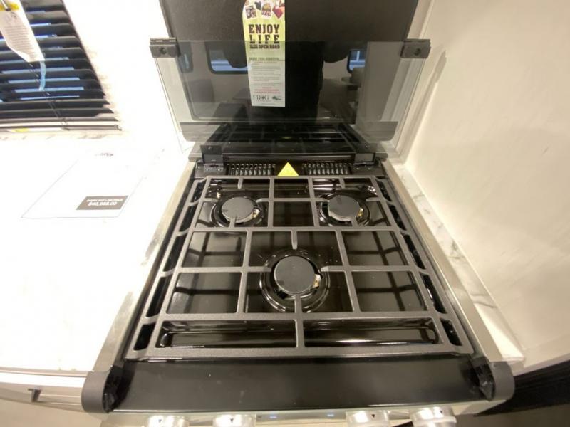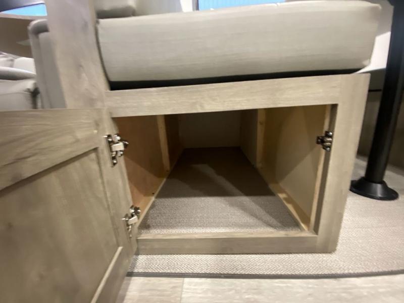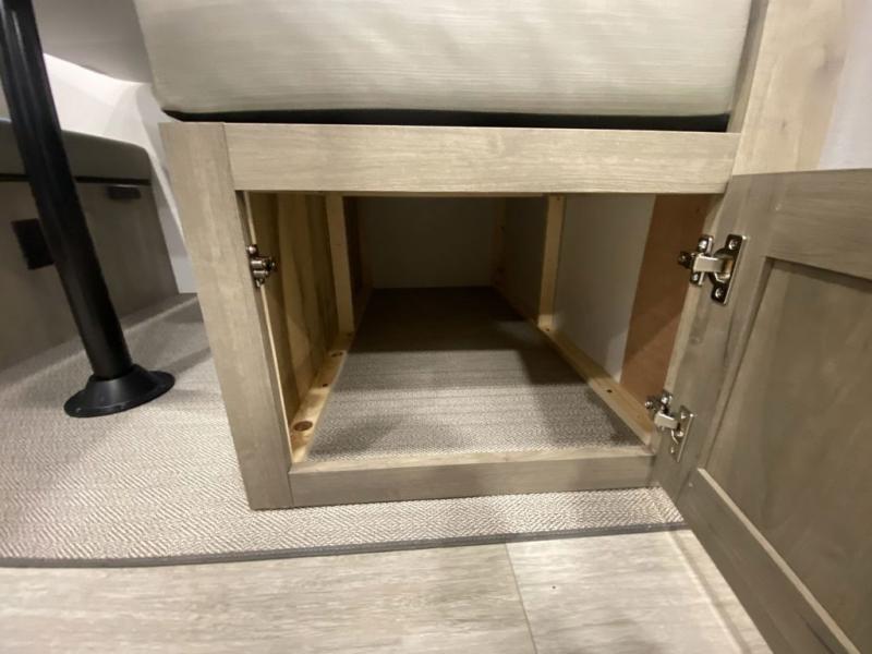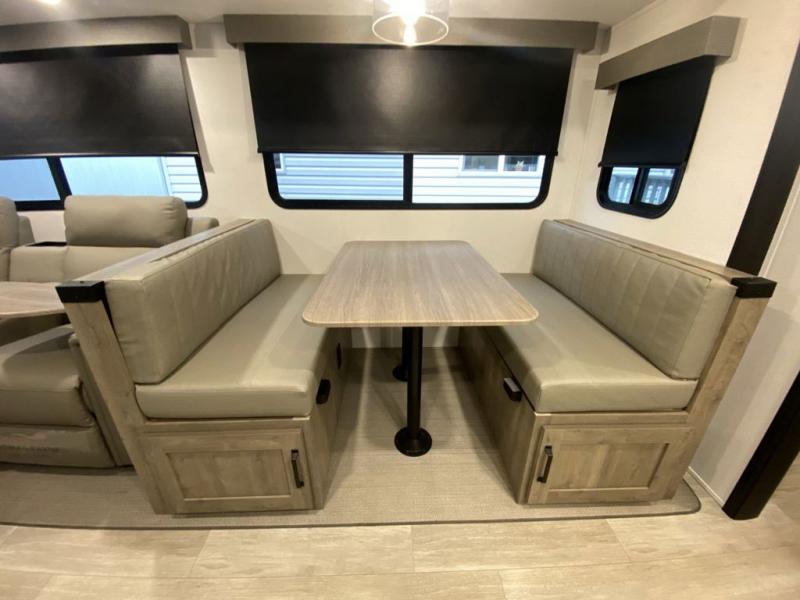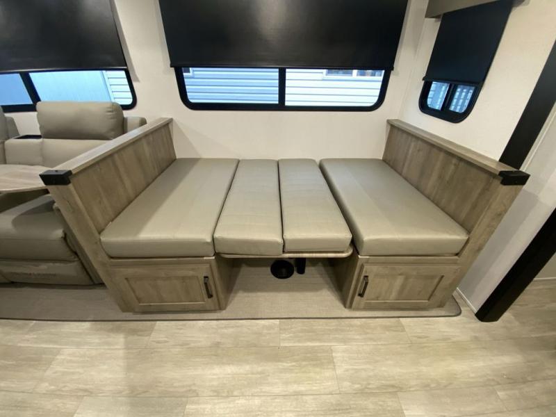 The large slide out in this trailer offers seating and sleeping space on a sofa sleeper and a booth dinette plus adds more floor space to the main living and kitchen area. The rear full bathroom has a 30" x 48" shower with a seat and a linen closet for towels and such, and the front bedroom includes a queen bed and clothing storage plus windows for views of your campsite. The cook will have the choice of making meals inside with full amenities including an 11 cu. ft. refrigerator and an L-shaped counter or outdoors on the outside kitchen. The 21' power awning provides an outdoor living area protected from the elements, and the exterior offers a drop frame pass-thru for ample storage space!