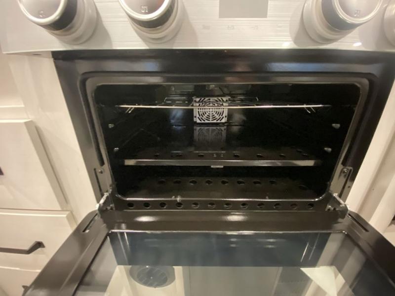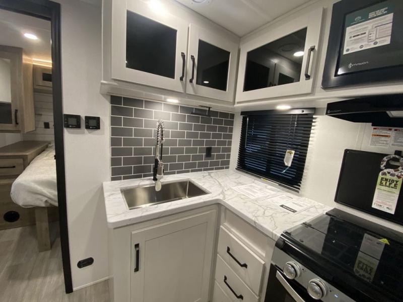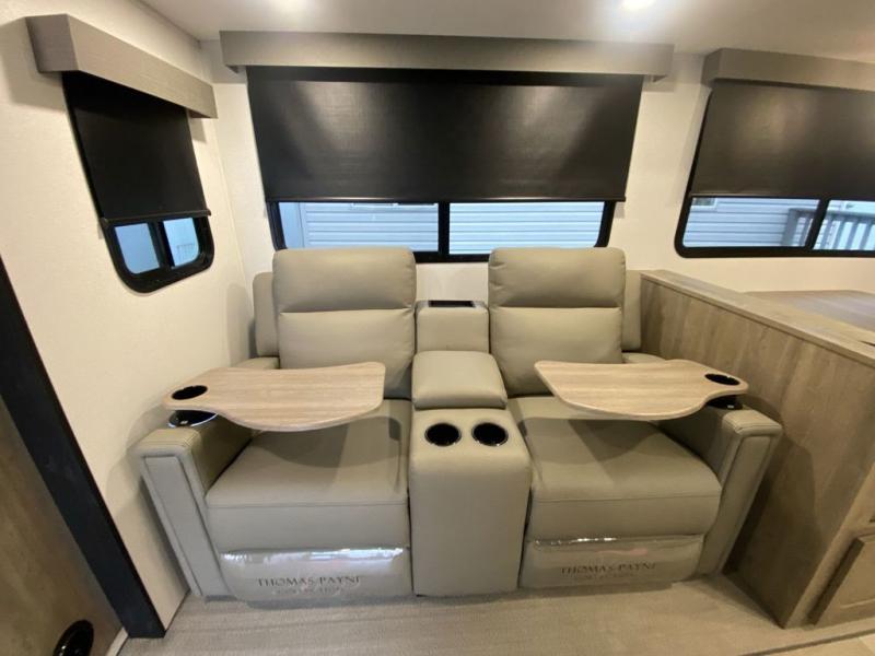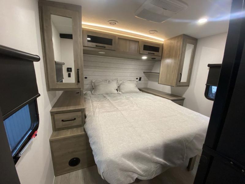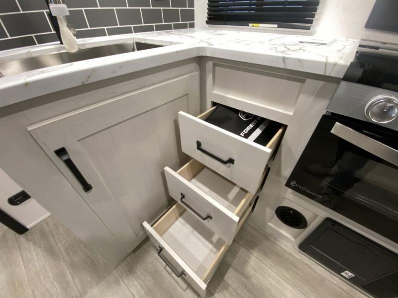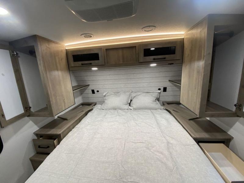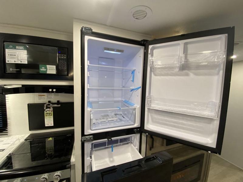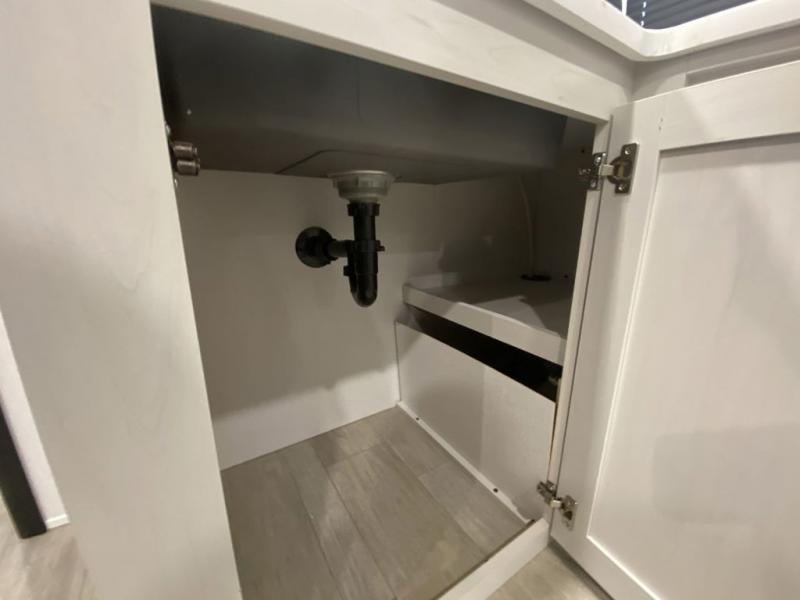 The large slide out in this trailer offers seating and sleeping space on a sofa sleeper and a booth dinette plus adds more floor space to the main living and kitchen area. The rear full bathroom has a 30" x 48" shower with a seat and a linen closet for towels and such, and the front bedroom includes a queen bed and clothing storage plus windows for views of your campsite. The cook will have the choice of making meals inside with full amenities including an 11 cu. ft. refrigerator and an L-shaped counter or outdoors on the outside kitchen. The 21' power awning provides an outdoor living area protected from the elements, and the exterior offers a drop frame pass-thru for ample storage space!