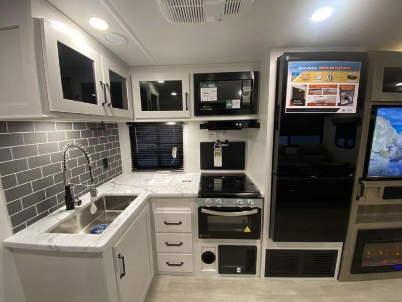Each SolAire travel trailer by Palomino features a white gel coat exterior and an aluminum superstructure frame for lightweight towing. You will love having a power tongue jack for easy set up, plus slam latch baggage doors with magnets to make unloading easier than ever. There is also a power awning with LED lights and aluminum wheels included on the exterior. Each SolAire is constructed to last with Azdel composite, a fully laminated rear wall and roof, plus a fully enclosed and heated underbelly. The interior includes roller shades and kitchen backsplash, USB ports to keep your electronics charged, a Bluetooth stereo with speakers, and many more stand-out features!