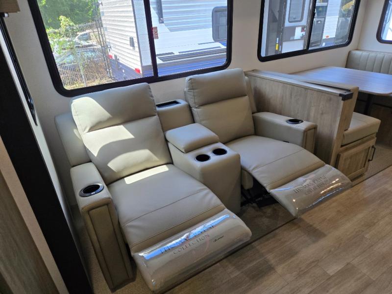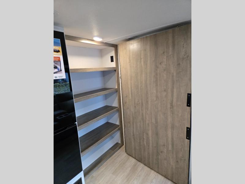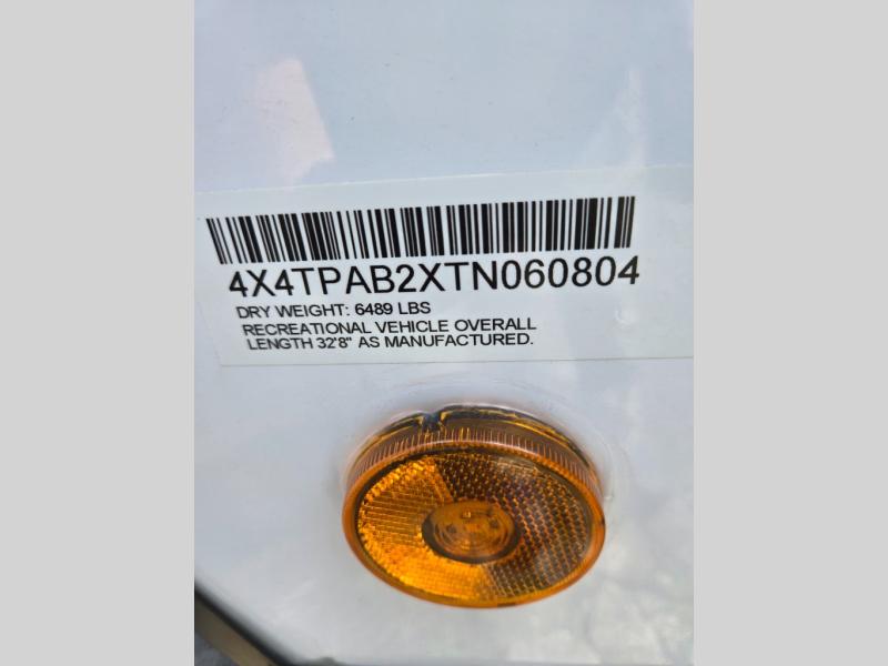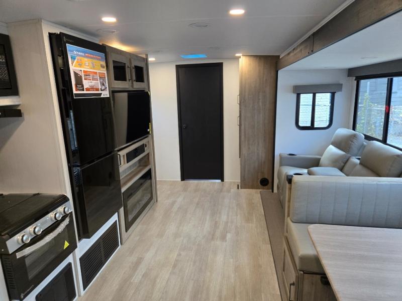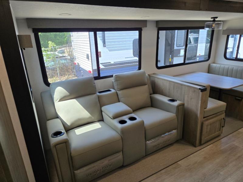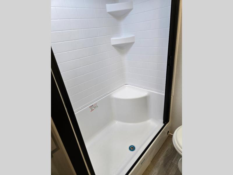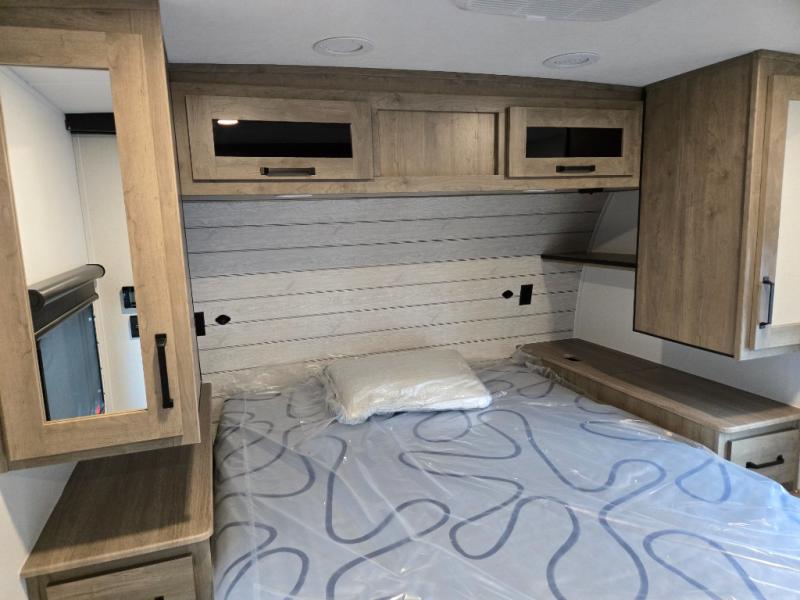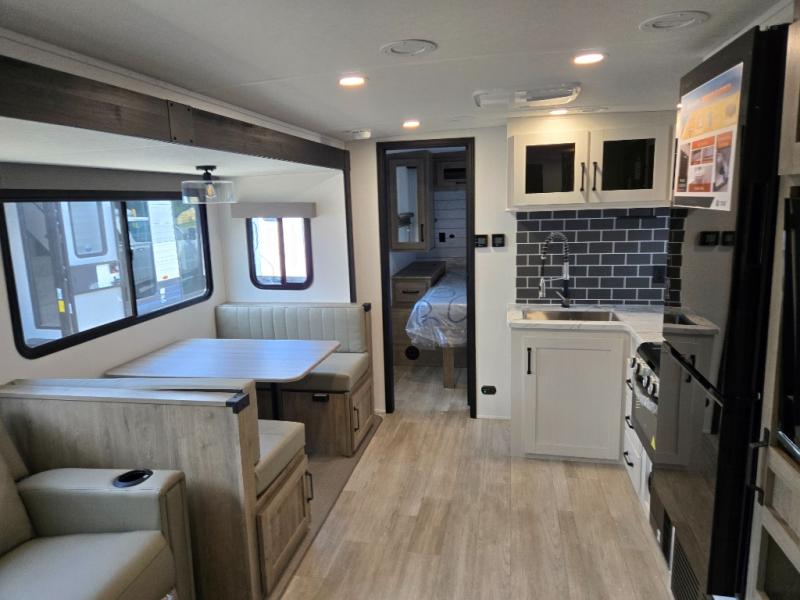 The large slide out in this trailer offers seating and sleeping space on a sofa sleeper and a booth dinette plus adds more floor space to the main living and kitchen area. The rear full bathroom has a 30" x 48" shower with a seat and a linen closet for towels and such, and the front bedroom includes a queen bed and clothing storage plus windows for views of your campsite. The cook will have the choice of making meals inside with full amenities including an 11 cu. ft. refrigerator and an L-shaped counter or outdoors on the outside kitchen. The 21' power awning provides an outdoor living area protected from the elements, and the exterior offers a drop frame pass-thru for ample storage space!