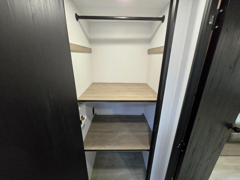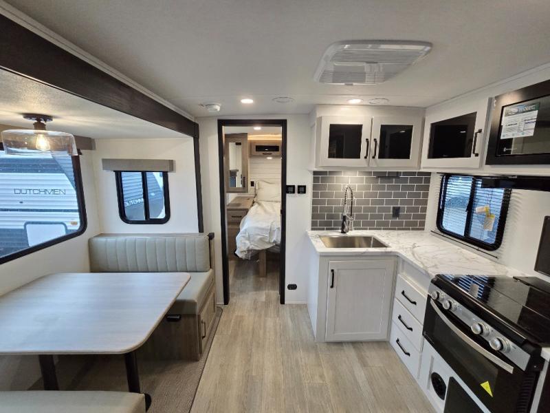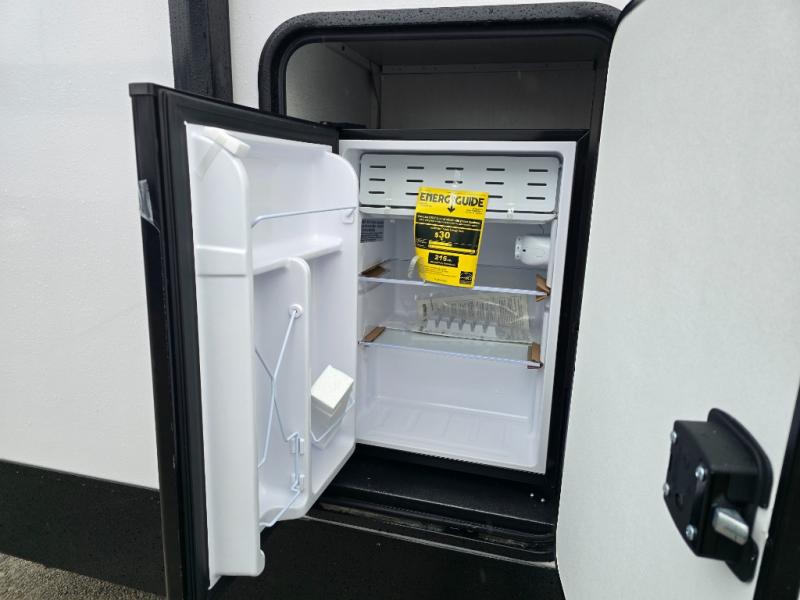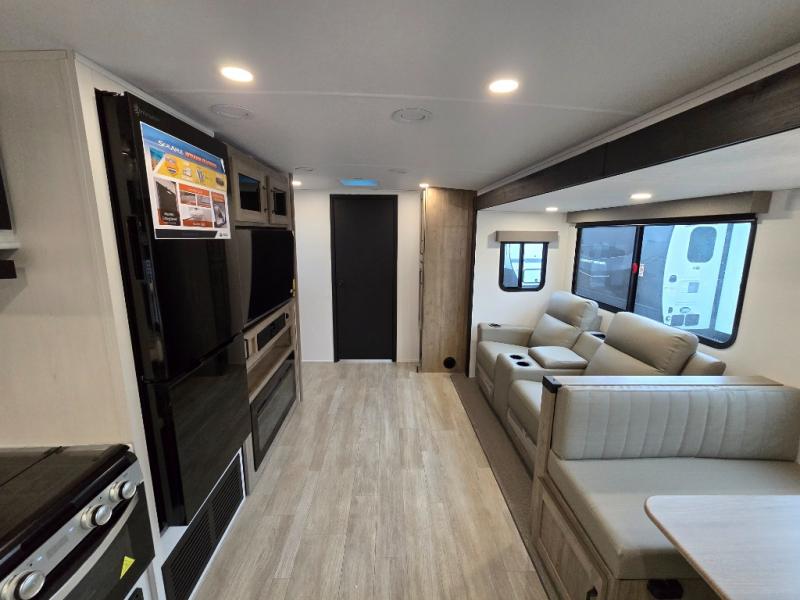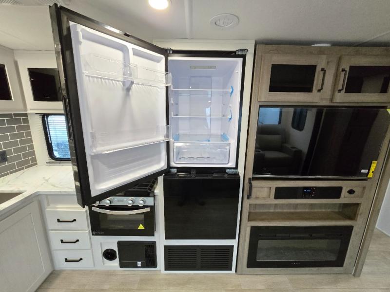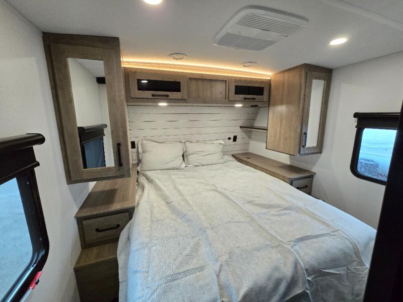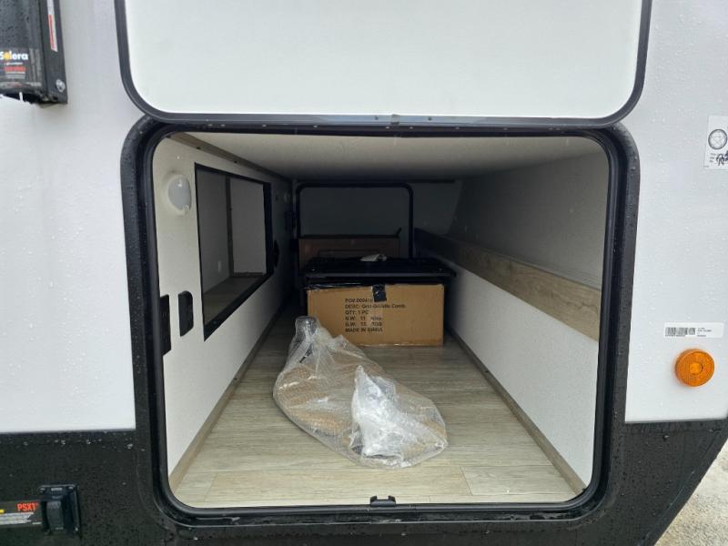 The large slide out in this trailer offers seating and sleeping space on a sofa sleeper and a booth dinette plus adds more floor space to the main living and kitchen area. The rear full bathroom has a 30" x 48" shower with a seat and a linen closet for towels and such, and the front bedroom includes a queen bed and clothing storage plus windows for views of your campsite. The cook will have the choice of making meals inside with full amenities including an 11 cu. ft. refrigerator and an L-shaped counter or outdoors on the outside kitchen. The 21' power awning provides an outdoor living area protected from the elements, and the exterior offers a drop frame pass-thru for ample storage space!