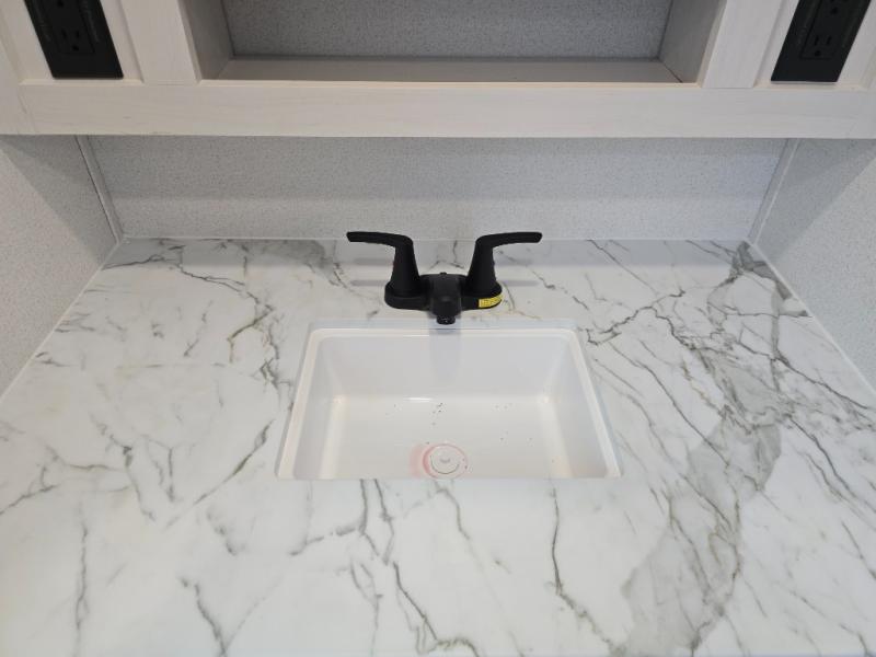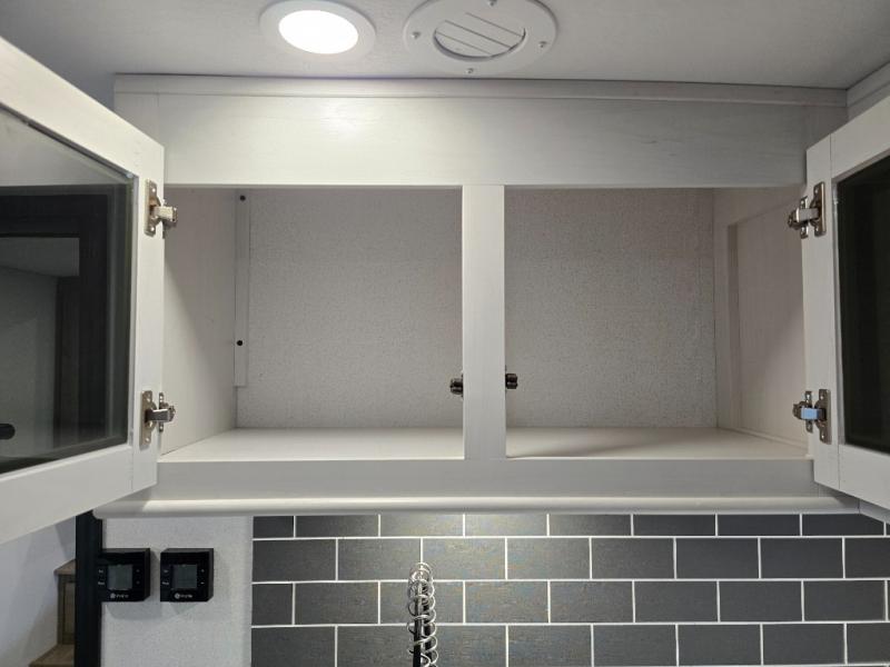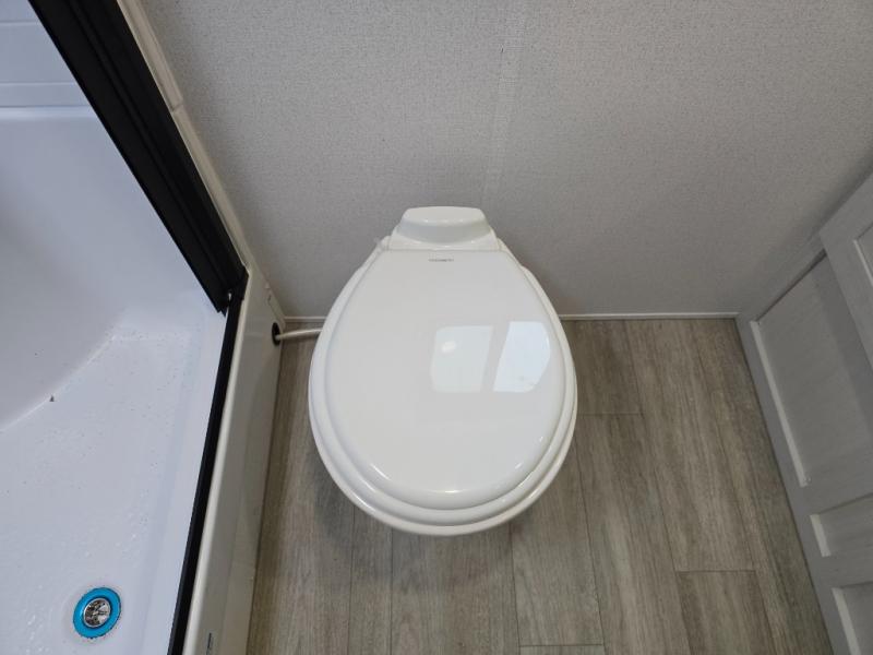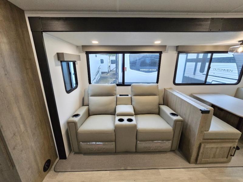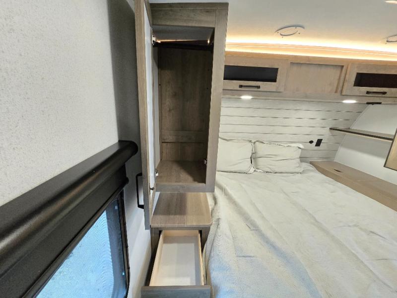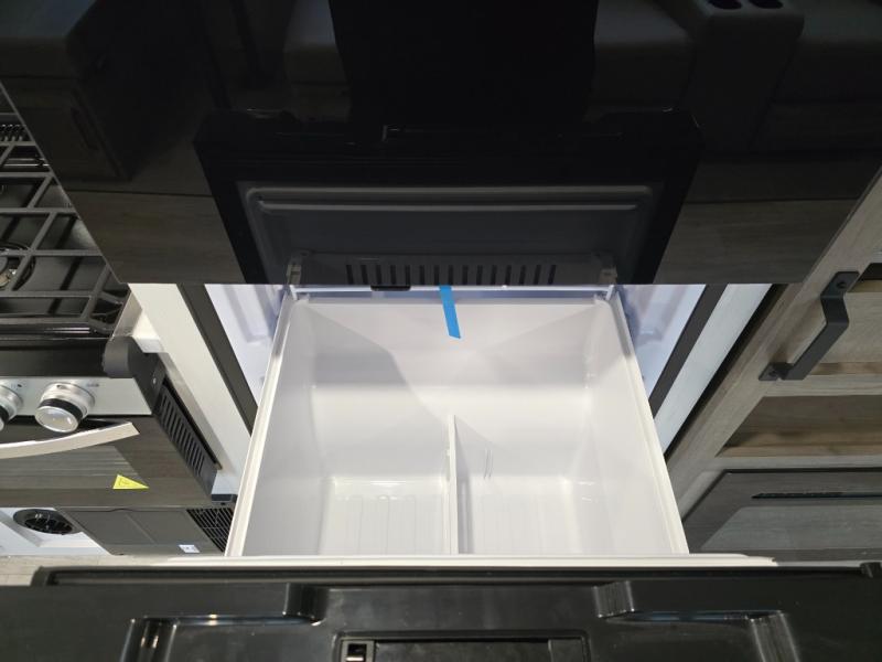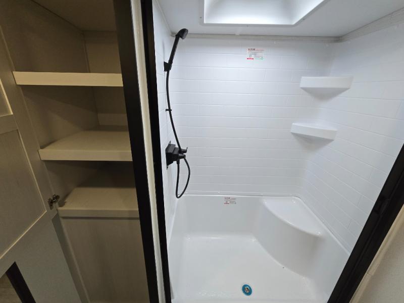 The large slide out in this trailer offers seating and sleeping space on a sofa sleeper and a booth dinette plus adds more floor space to the main living and kitchen area. The rear full bathroom has a 30" x 48" shower with a seat and a linen closet for towels and such, and the front bedroom includes a queen bed and clothing storage plus windows for views of your campsite. The cook will have the choice of making meals inside with full amenities including an 11 cu. ft. refrigerator and an L-shaped counter or outdoors on the outside kitchen. The 21' power awning provides an outdoor living area protected from the elements, and the exterior offers a drop frame pass-thru for ample storage space!