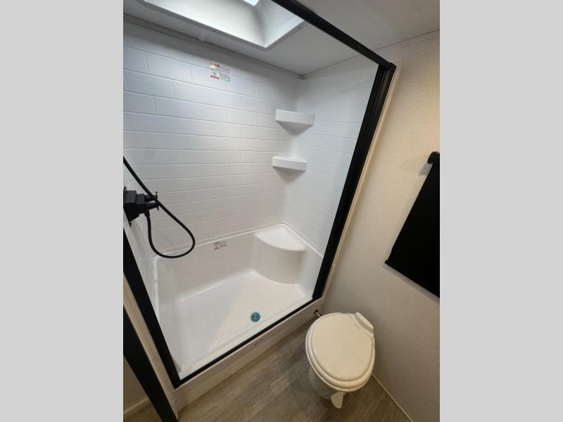 The large slide out in this trailer offers seating and sleeping space on a sofa sleeper and a booth dinette plus adds more floor space to the main living and kitchen area. The rear full bathroom has a 30" x 48" shower with a seat and a linen closet for towels and such, and the front bedroom includes a queen bed and clothing storage plus windows for views of your campsite. The cook will have the choice of making meals inside with full amenities including an 11 cu. ft. refrigerator and an L-shaped counter or outdoors on the outside kitchen. The 21' power awning provides an outdoor living area protected from the elements, and the exterior offers a drop frame pass-thru for ample storage space!