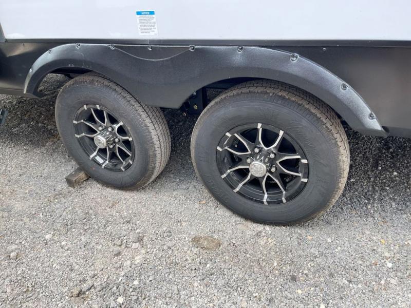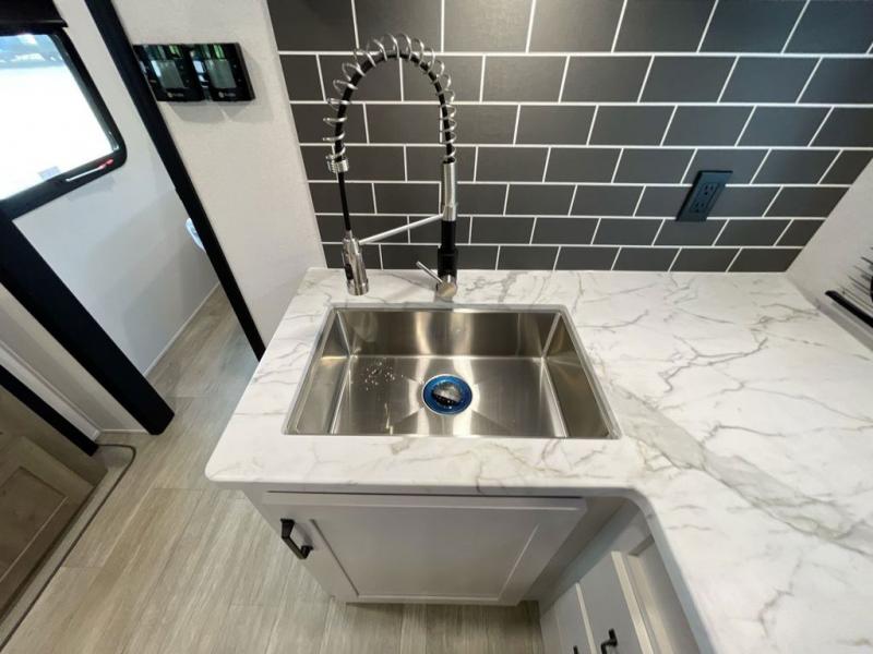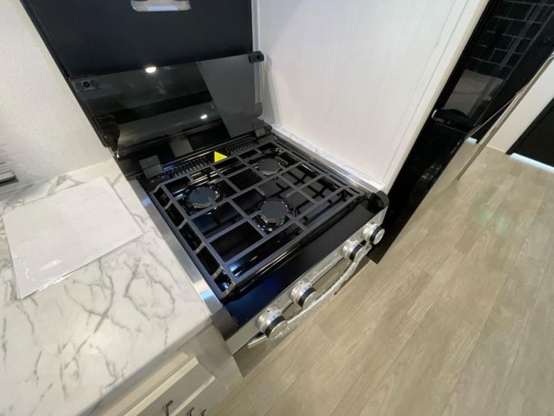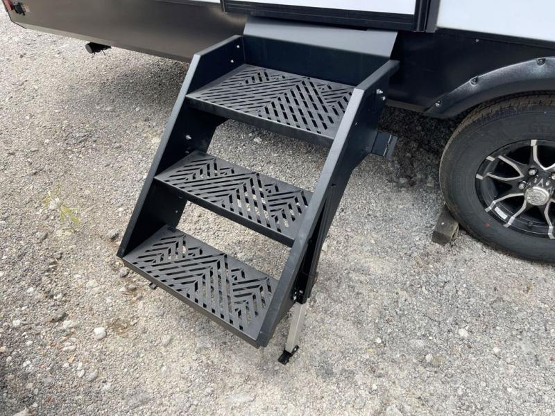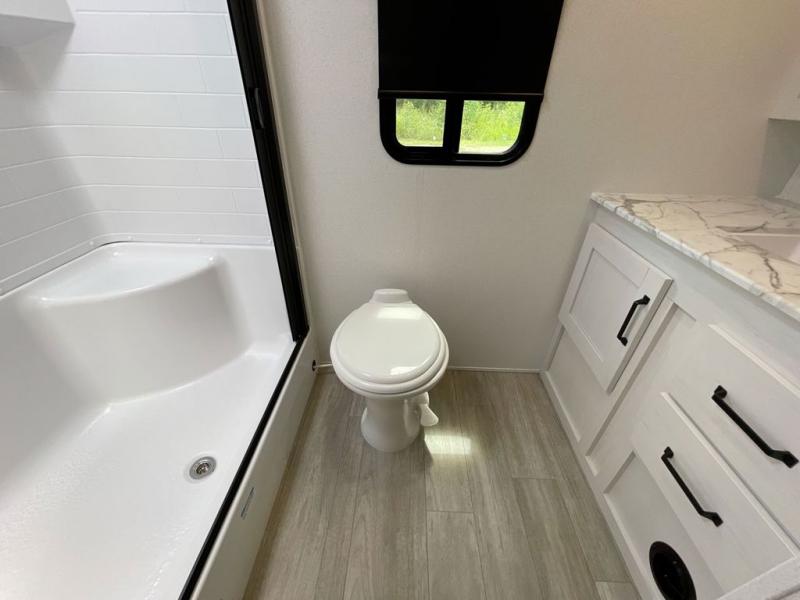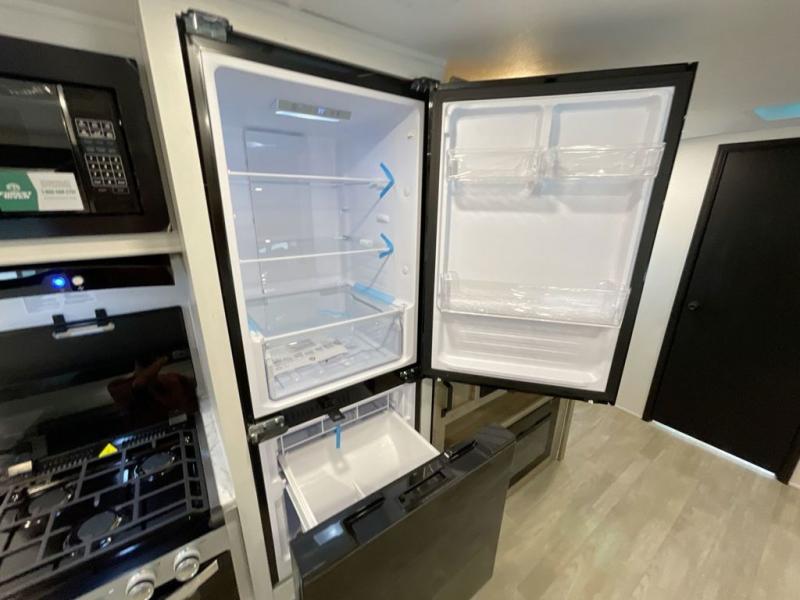 The large slide out in this trailer offers seating and sleeping space on a sofa sleeper and a booth dinette plus adds more floor space to the main living and kitchen area. The rear full bathroom has a 30" x 48" shower with a seat and a linen closet for towels and such, and the front bedroom includes a queen bed and clothing storage plus windows for views of your campsite. The cook will have the choice of making meals inside with full amenities including an 11 cu. ft. refrigerator and an L-shaped counter or outdoors on the outside kitchen. The 21' power awning provides an outdoor living area protected from the elements, and the exterior offers a drop frame pass-thru for ample storage space!