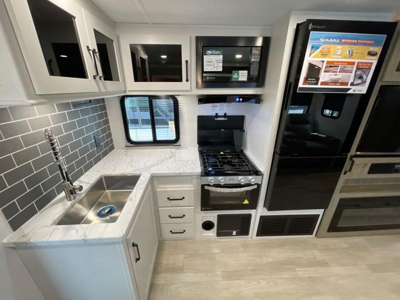 Each SolAire travel trailer by Palomino features a white gel coat exterior and an aluminum superstructure frame for lightweight towing. You will love having a power tongue jack for easy set up, plus slam latch baggage doors with magnets to make unloading easier than ever. There is also a power awning with LED lights and aluminum wheels included on the exterior. Each SolAire is constructed to last with Azdel composite, a fully laminated rear wall and roof, plus a fully enclosed and heated underbelly. The interior includes roller shades and kitchen backsplash, USB ports to keep your electronics charged, a Bluetooth stereo with speakers, and many more stand-out features!