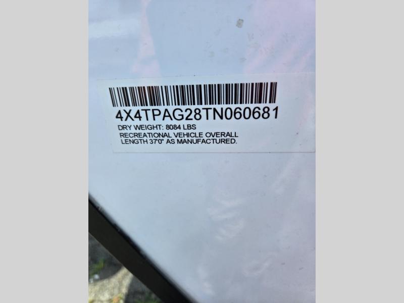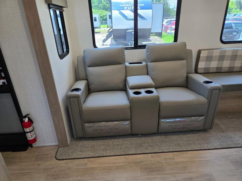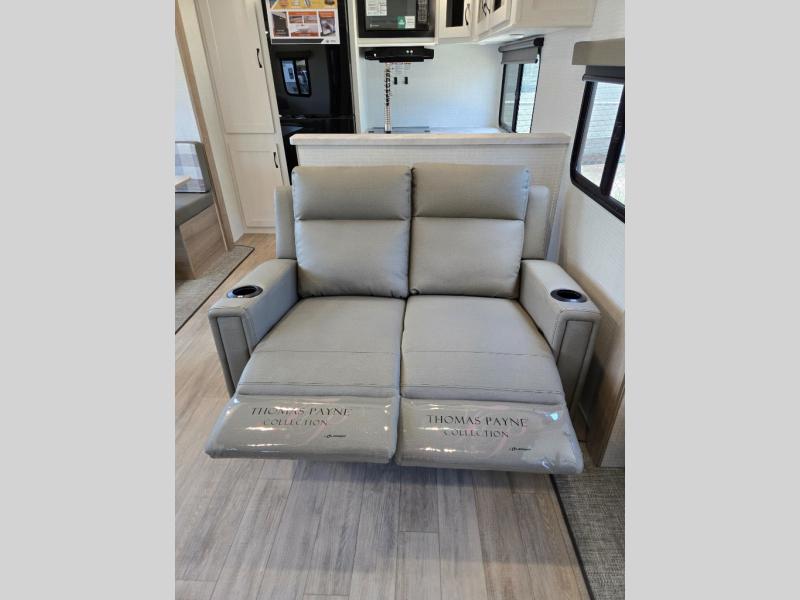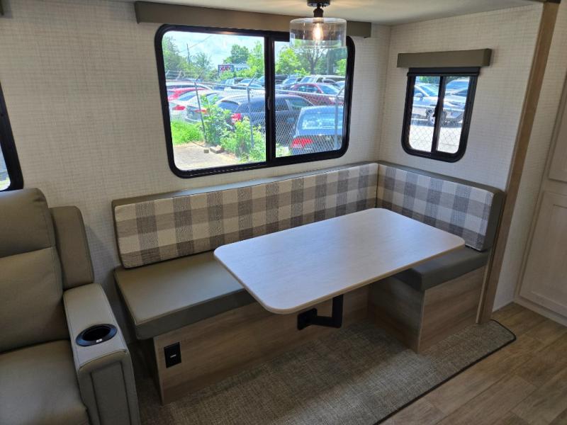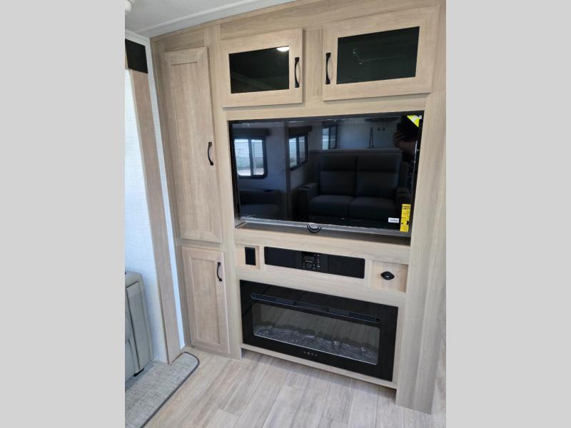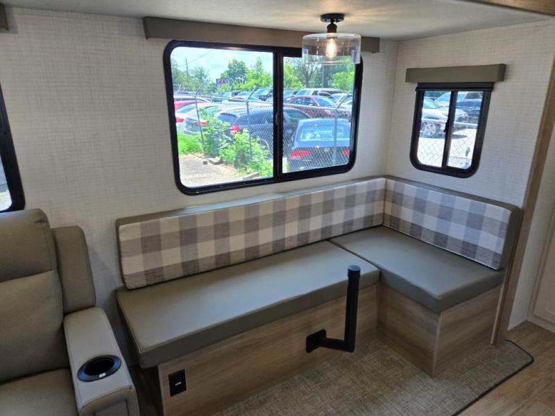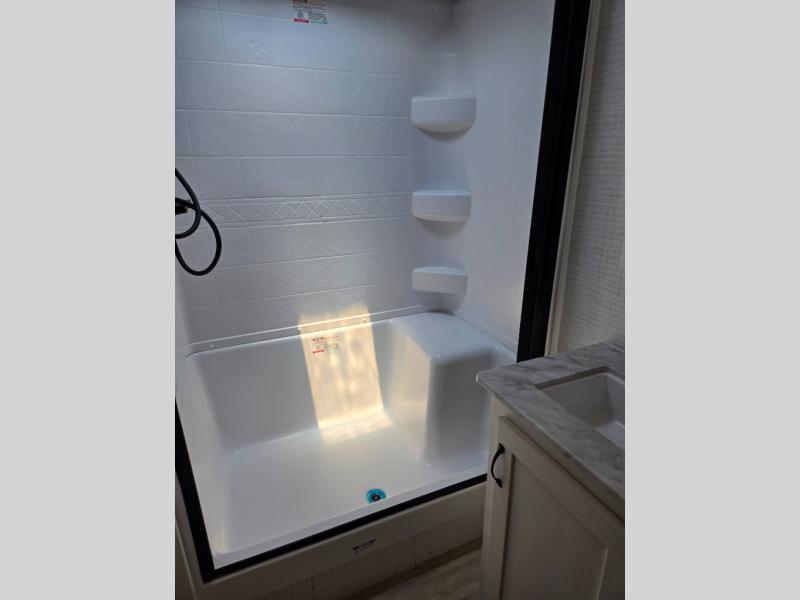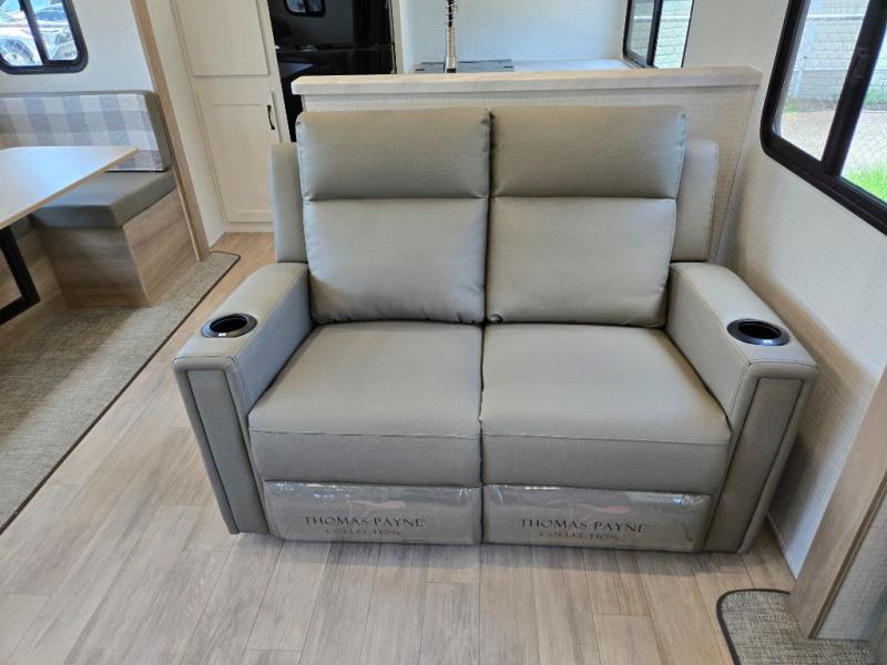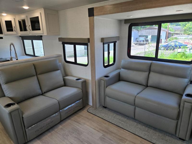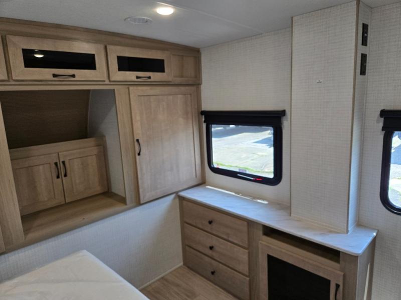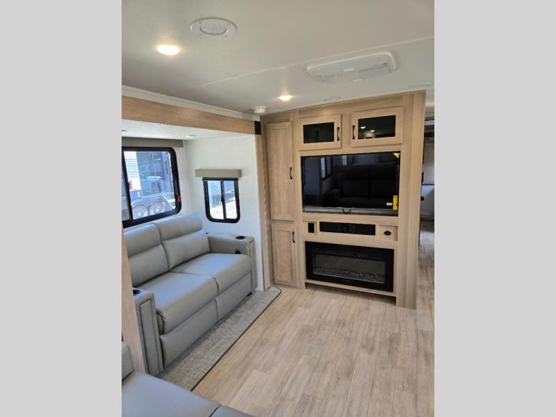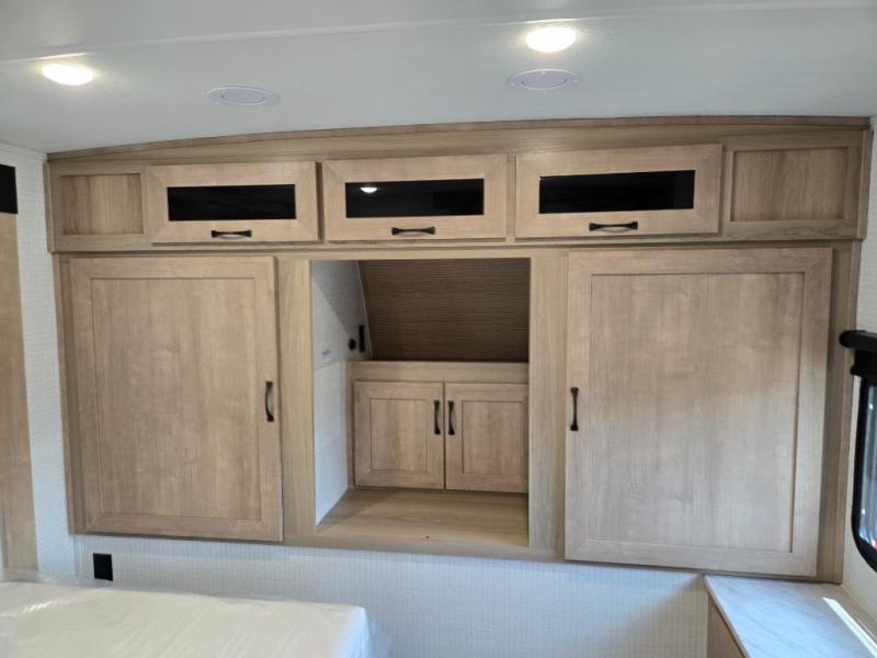 One look at this spacious travel trailer and you'll be sold! The rear kitchen features a U-shaped counter, an 11 cu. ft. refrigerator, plus a pantry for dry goods and snacks. There is a 1/2 dinette with bench seating, plus a tri-fold sofa and two theater seats. Everyone can take turns cleaning up in the full bath that includes a shower with a seat, then head outdoors to relax under the patio awnings with LED lights. When it's time for bed, you will enjoy the king bed slide out in the front bedroom. You'll also find a dresser and a closet here, plus a wardrobe with washer and dryer prep if you choose to add those appliances!