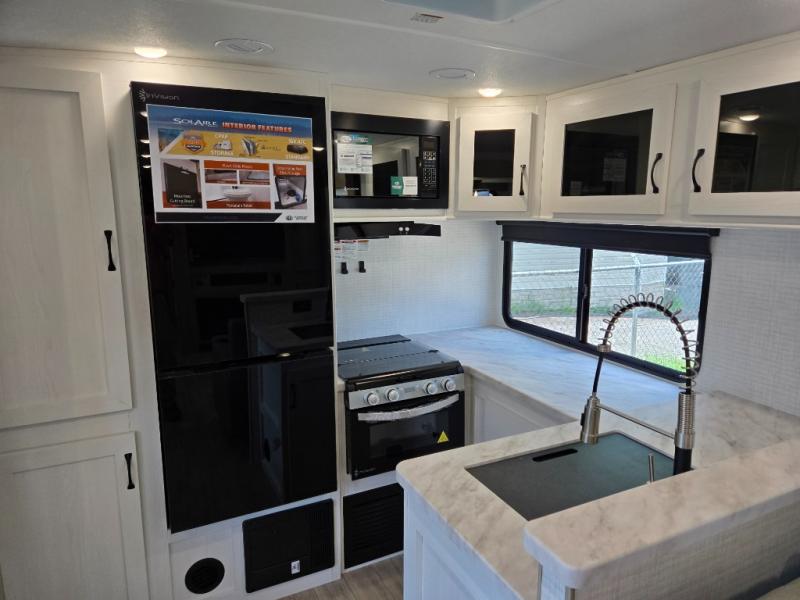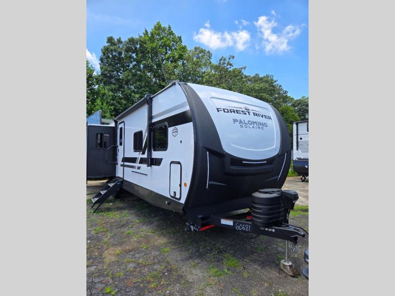 Each SolAire travel trailer by Palomino features a white gel coat exterior and an aluminum superstructure frame for lightweight towing. You will love having a power tongue jack for easy set up, plus slam latch baggage doors with magnets to make unloading easier than ever. There is also a power awning with LED lights and aluminum wheels included on the exterior. Each SolAire is constructed to last with Azdel composite, a fully laminated rear wall and roof, plus a fully enclosed and heated underbelly. The interior includes roller shades and kitchen backsplash, USB ports to keep your electronics charged, a Bluetooth stereo with speakers, and many more stand-out features!