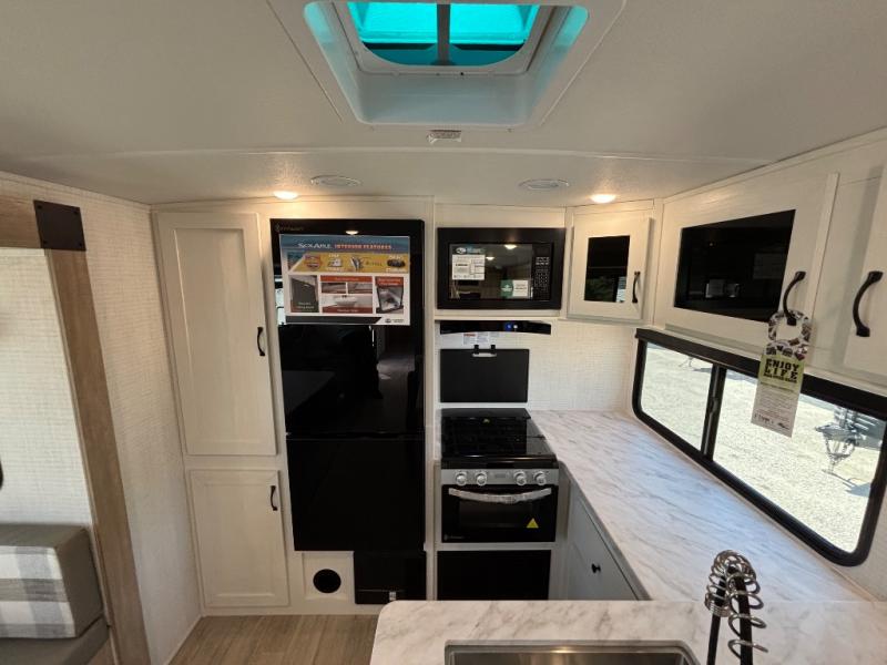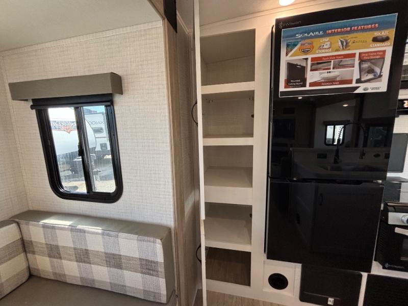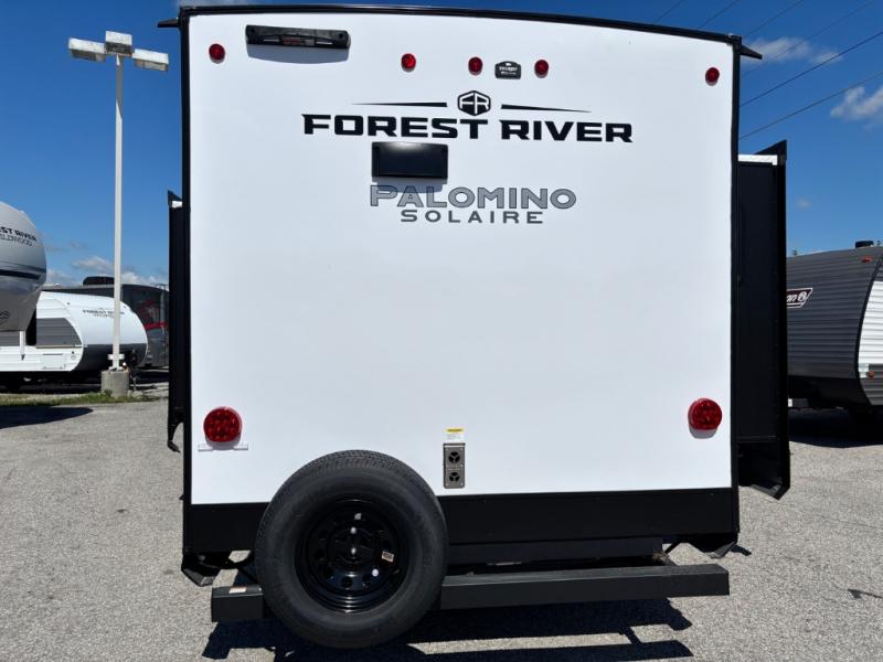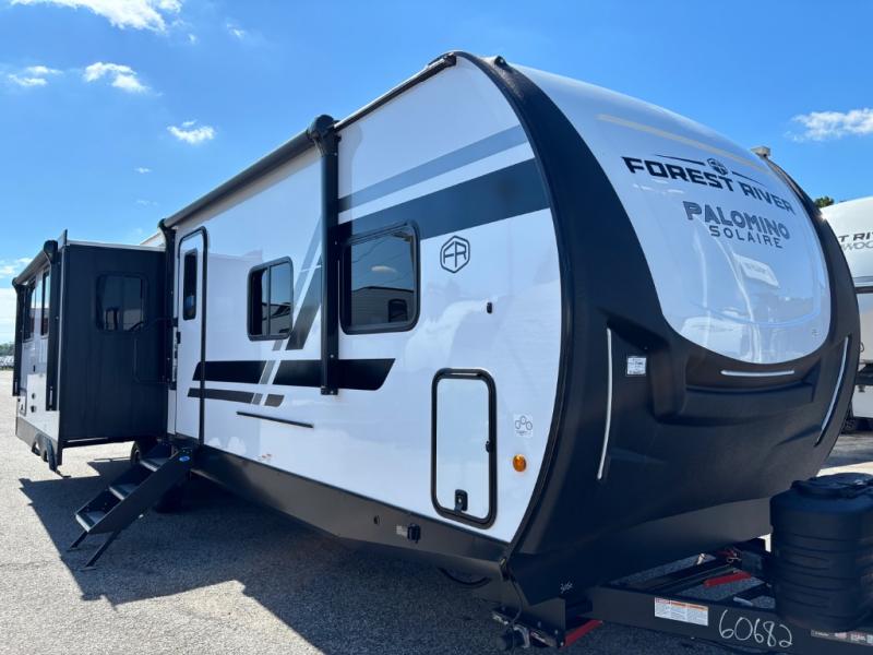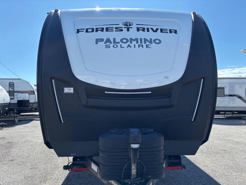 Each SolAire travel trailer by Palomino features a white gel coat exterior and an aluminum superstructure frame for lightweight towing. You will love having a power tongue jack for easy set up, plus slam latch baggage doors with magnets to make unloading easier than ever. There is also a power awning with LED lights and aluminum wheels included on the exterior. Each SolAire is constructed to last with Azdel composite, a fully laminated rear wall and roof, plus a fully enclosed and heated underbelly. The interior includes roller shades and kitchen backsplash, USB ports to keep your electronics charged, a Bluetooth stereo with speakers, and many more stand-out features!