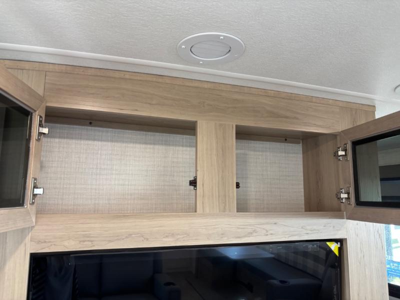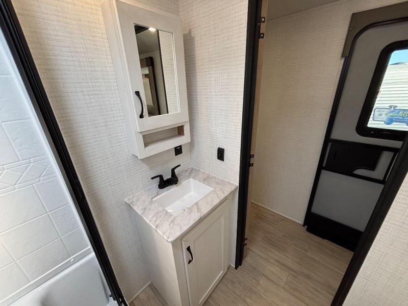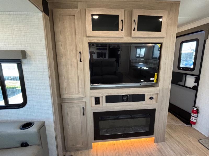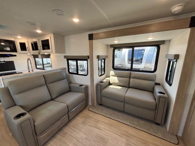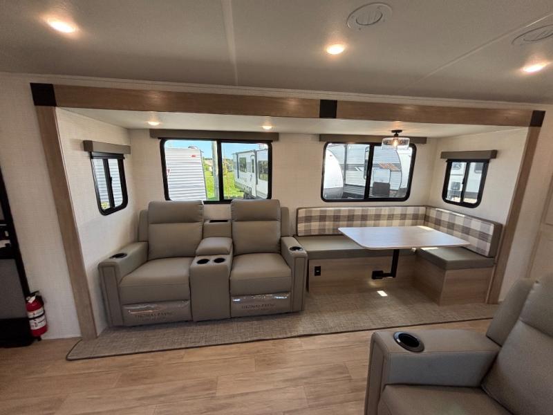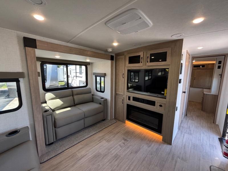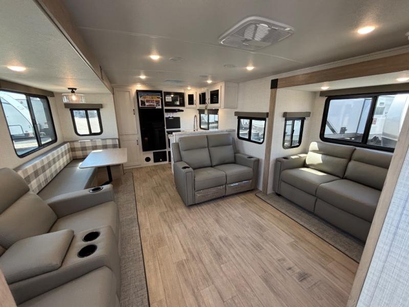 One look at this spacious travel trailer and you'll be sold! The rear kitchen features a U-shaped counter, an 11 cu. ft. refrigerator, plus a pantry for dry goods and snacks. There is a 1/2 dinette with bench seating, plus a tri-fold sofa and two theater seats. Everyone can take turns cleaning up in the full bath that includes a shower with a seat, then head outdoors to relax under the patio awnings with LED lights. When it's time for bed, you will enjoy the king bed slide out in the front bedroom. You'll also find a dresser and a closet here, plus a wardrobe with washer and dryer prep if you choose to add those appliances!