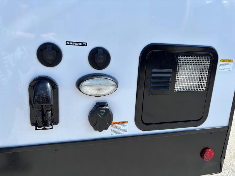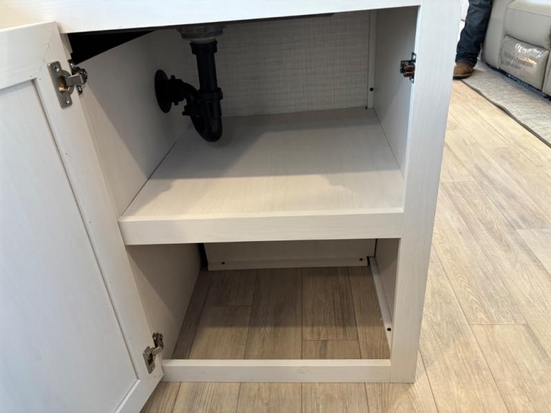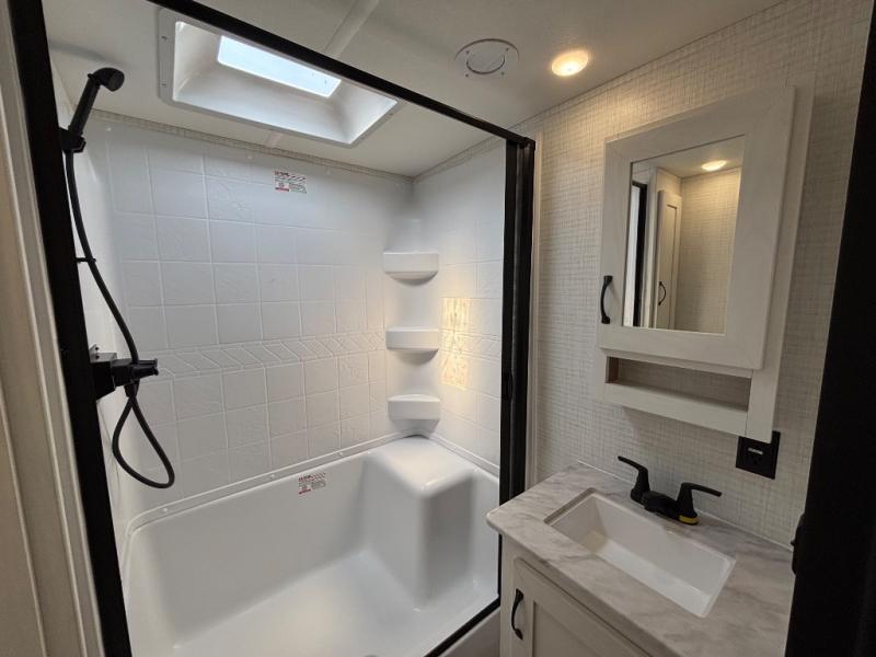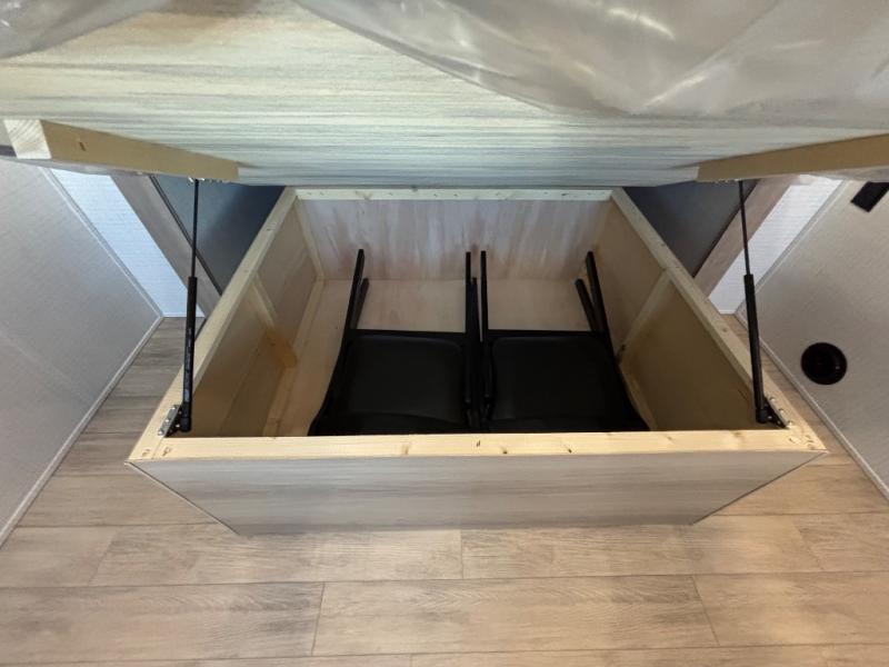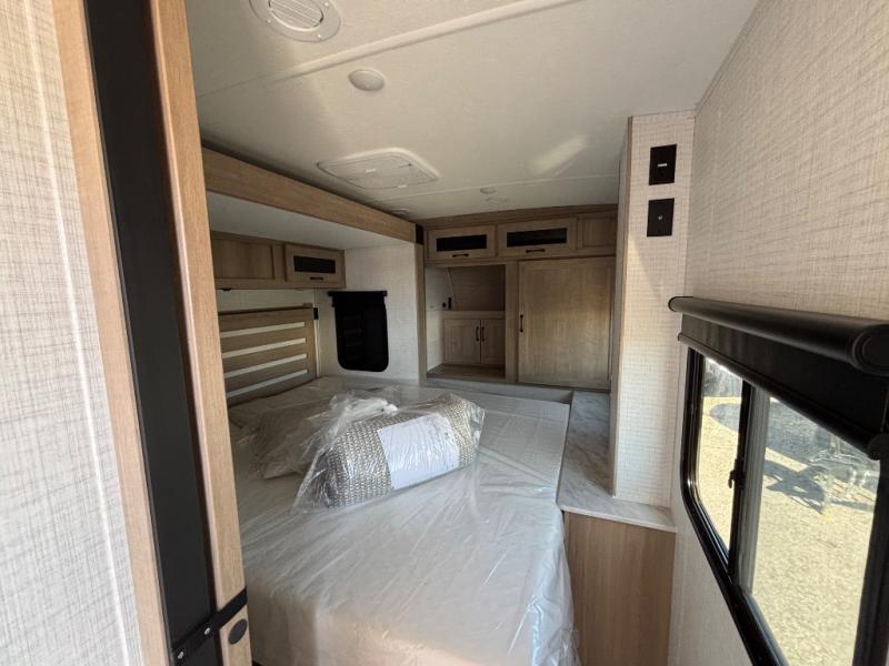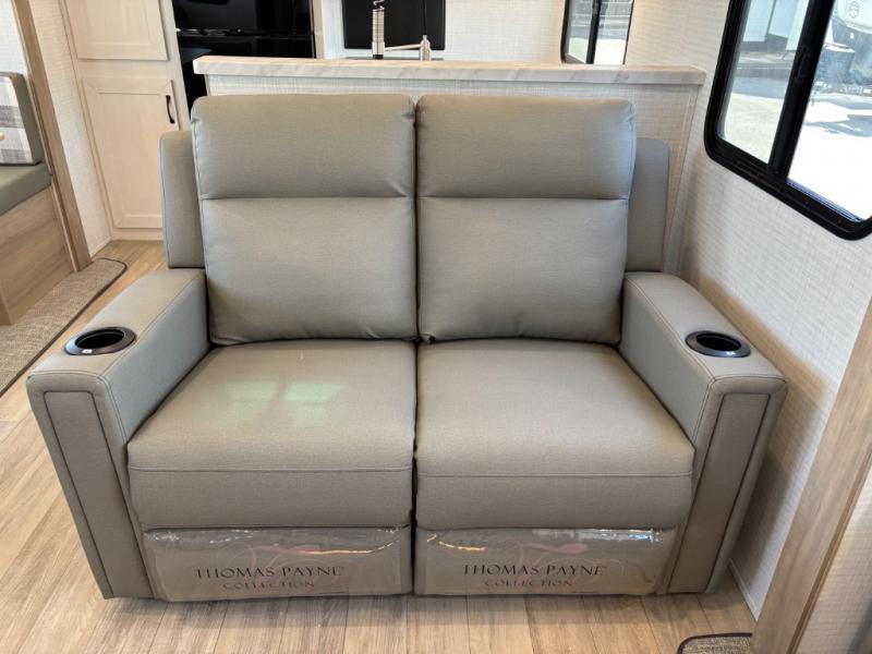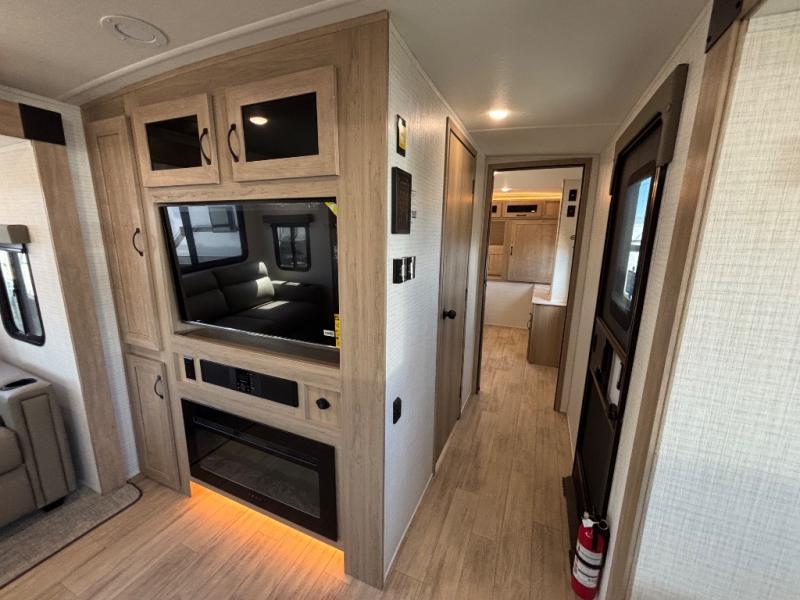 One look at this spacious travel trailer and you'll be sold! The rear kitchen features a U-shaped counter, an 11 cu. ft. refrigerator, plus a pantry for dry goods and snacks. There is a 1/2 dinette with bench seating, plus a tri-fold sofa and two theater seats. Everyone can take turns cleaning up in the full bath that includes a shower with a seat, then head outdoors to relax under the patio awnings with LED lights. When it's time for bed, you will enjoy the king bed slide out in the front bedroom. You'll also find a dresser and a closet here, plus a wardrobe with washer and dryer prep if you choose to add those appliances!