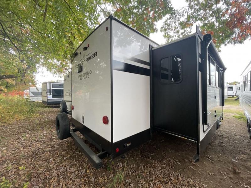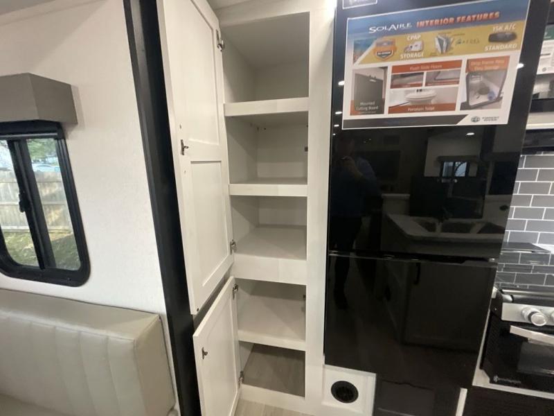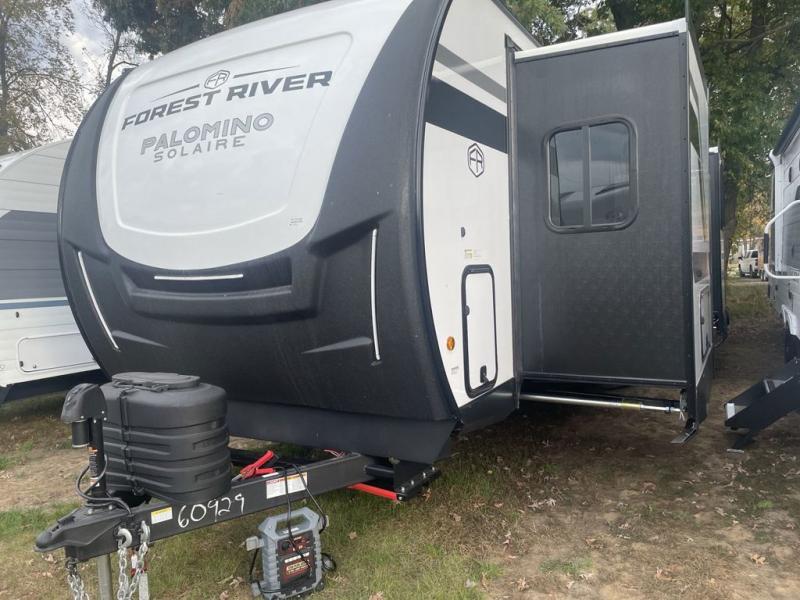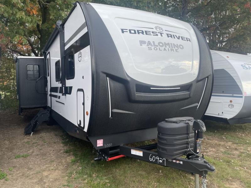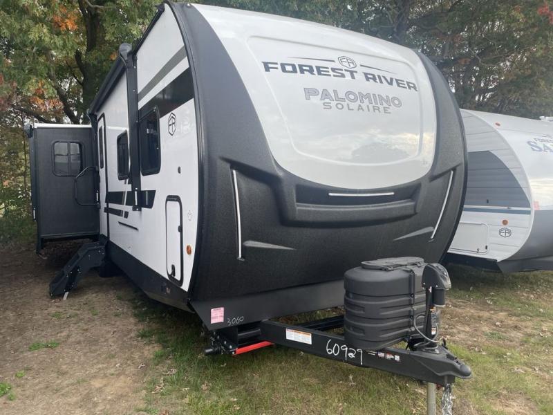 Each SolAire travel trailer by Palomino features a white gel coat exterior and an aluminum superstructure frame for lightweight towing. You will love having a power tongue jack for easy set up, plus slam latch baggage doors with magnets to make unloading easier than ever. There is also a power awning with LED lights and aluminum wheels included on the exterior. Each SolAire is constructed to last with Azdel composite, a fully laminated rear wall and roof, plus a fully enclosed and heated underbelly. The interior includes roller shades and kitchen backsplash, USB ports to keep your electronics charged, a Bluetooth stereo with speakers, and many more stand-out features!