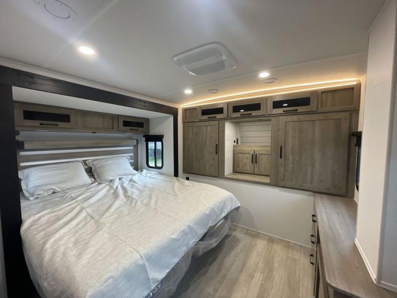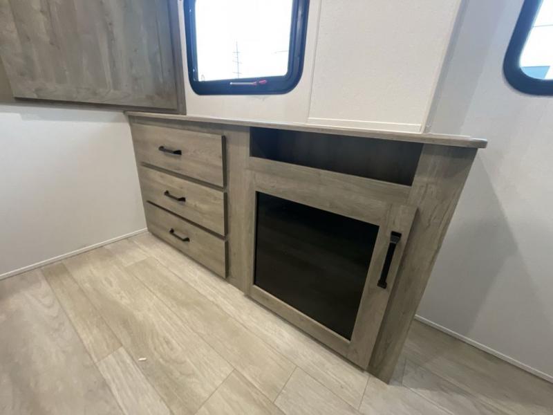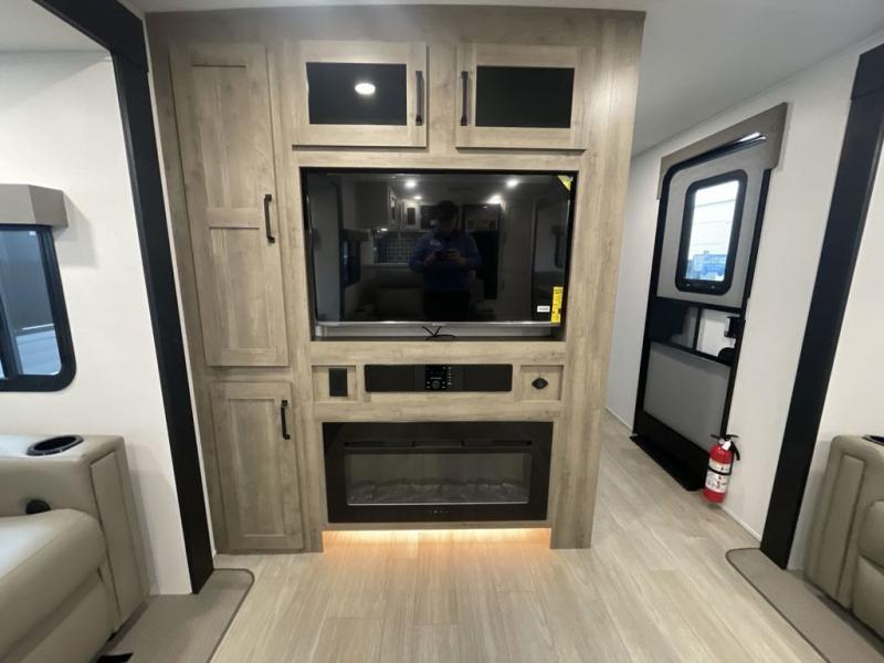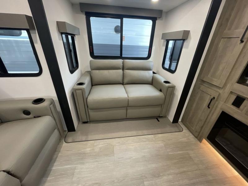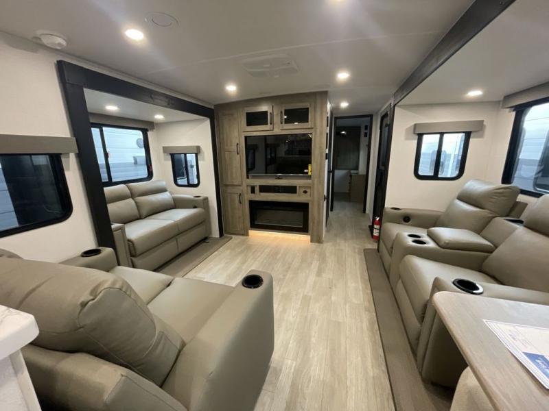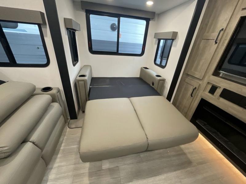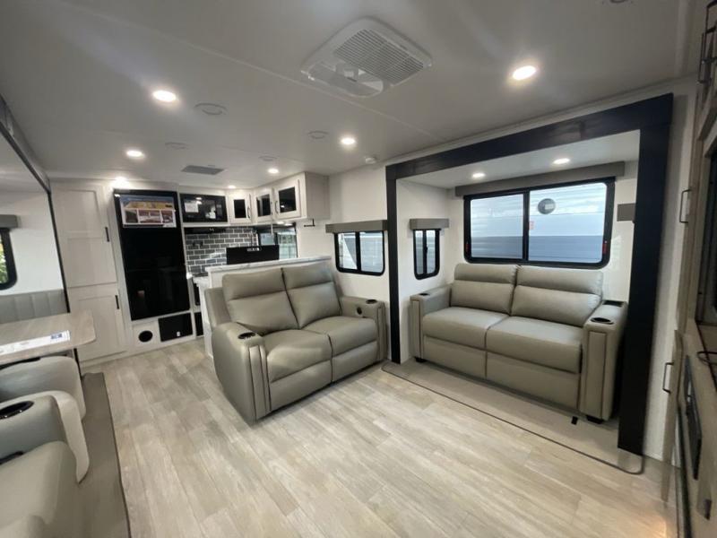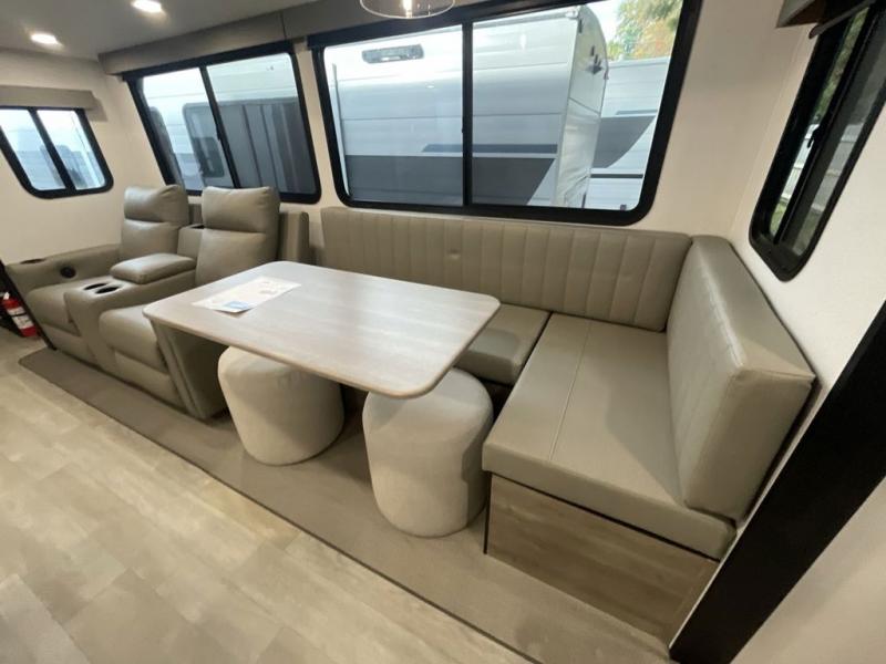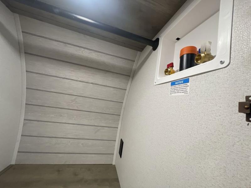 One look at this spacious travel trailer and you'll be sold! The rear kitchen features a U-shaped counter, an 11 cu. ft. refrigerator, plus a pantry for dry goods and snacks. There is a 1/2 dinette with bench seating, plus a tri-fold sofa and two theater seats. Everyone can take turns cleaning up in the full bath that includes a shower with a seat, then head outdoors to relax under the patio awnings with LED lights. When it's time for bed, you will enjoy the king bed slide out in the front bedroom. You'll also find a dresser and a closet here, plus a wardrobe with washer and dryer prep if you choose to add those appliances!