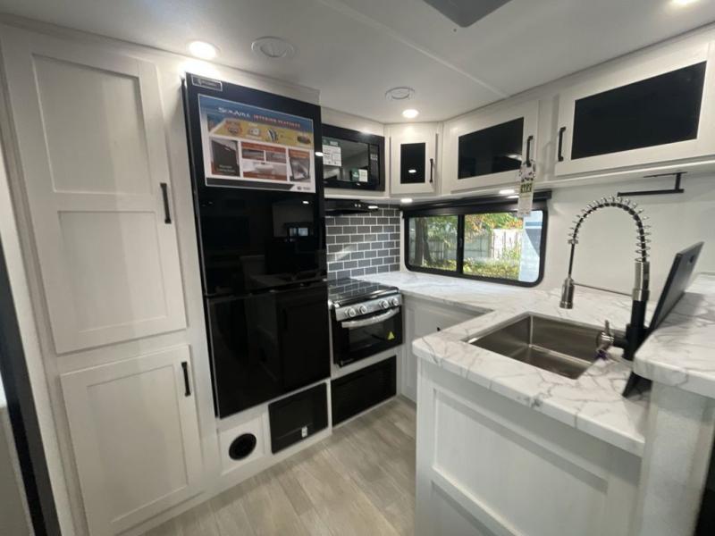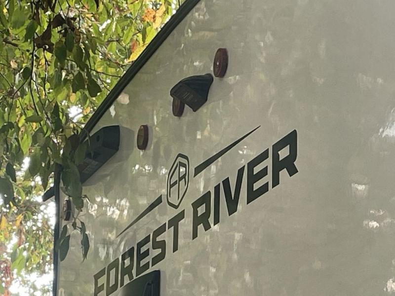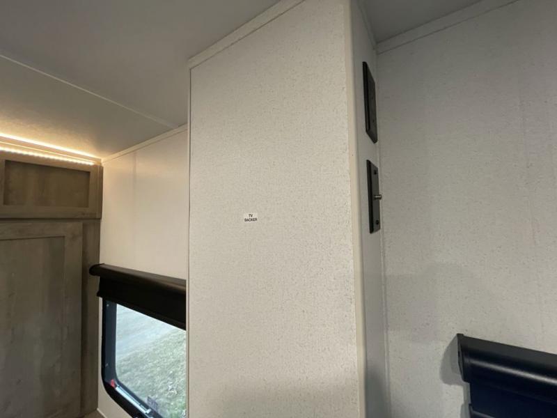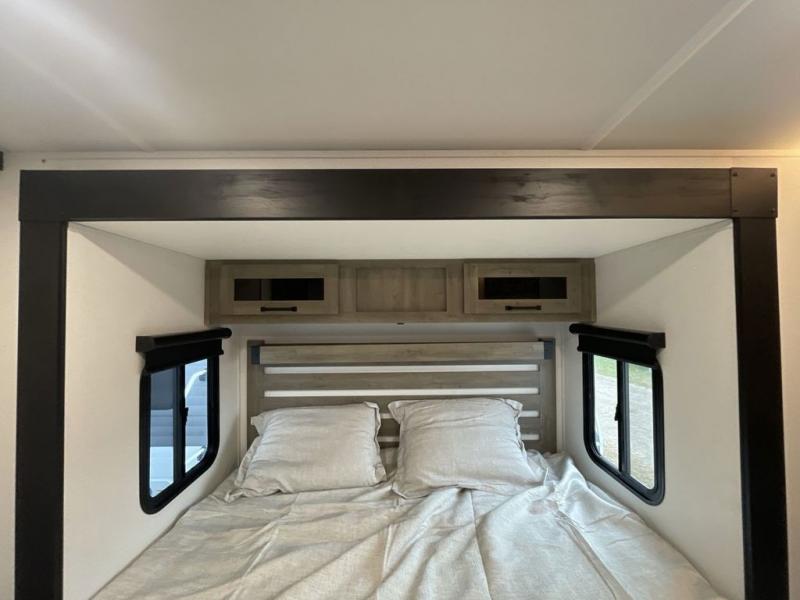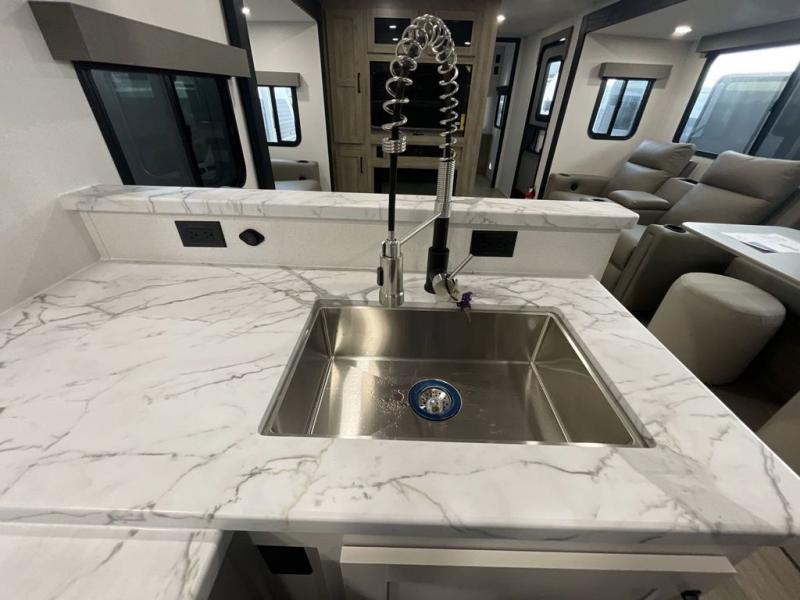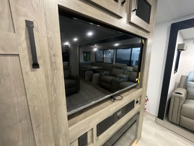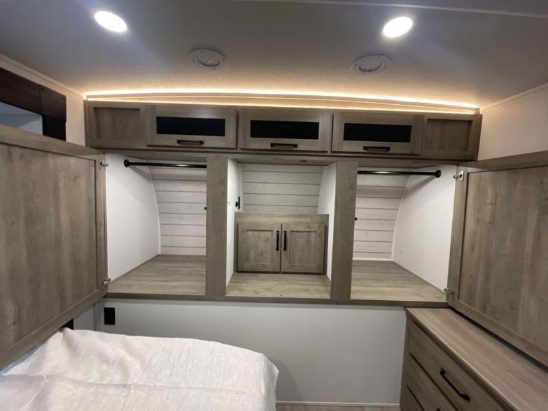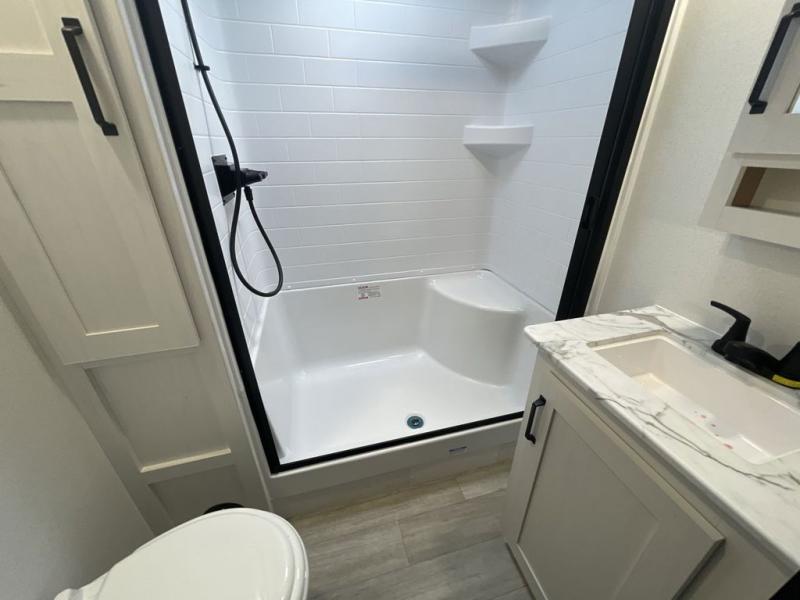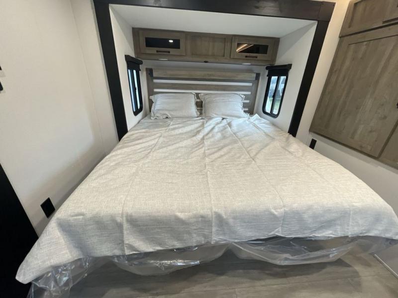One look at this spacious travel trailer and you'll be sold! The rear kitchen features a U-shaped counter, an 11 cu. ft. refrigerator, plus a pantry for dry goods and snacks. There is a 1/2 dinette with bench seating, plus a tri-fold sofa and two theater seats. Everyone can take turns cleaning up in the full bath that includes a shower with a seat, then head outdoors to relax under the patio awnings with LED lights. When it's time for bed, you will enjoy the king bed slide out in the front bedroom. You'll also find a dresser and a closet here, plus a wardrobe with washer and dryer prep if you choose to add those appliances!