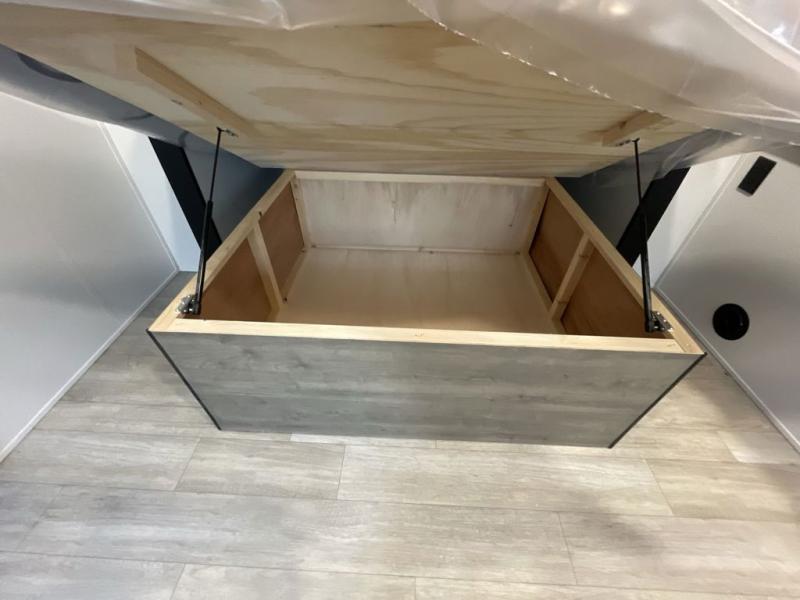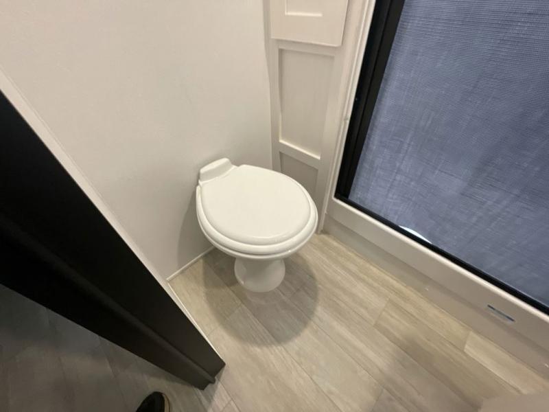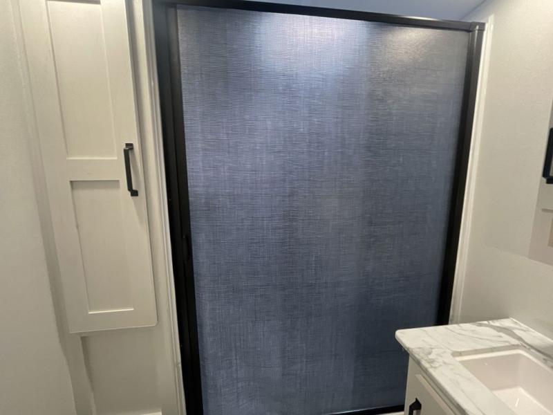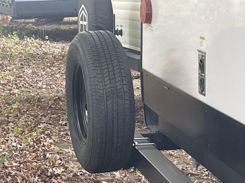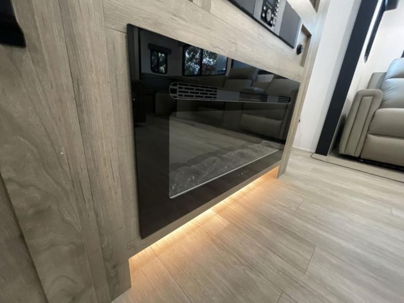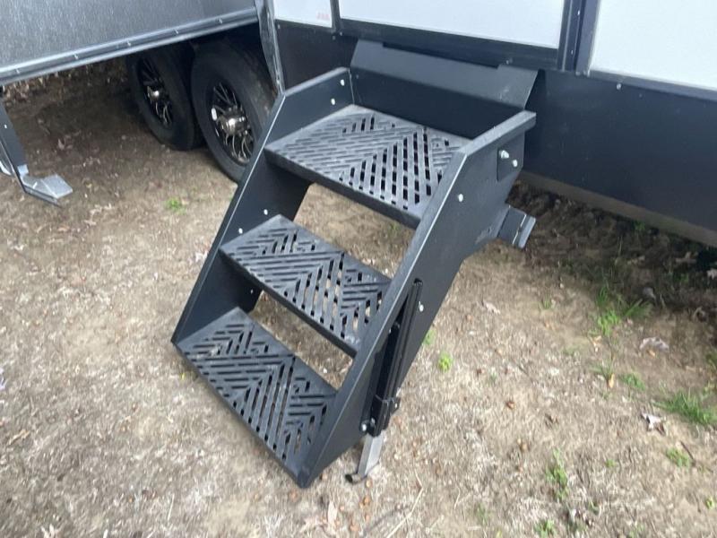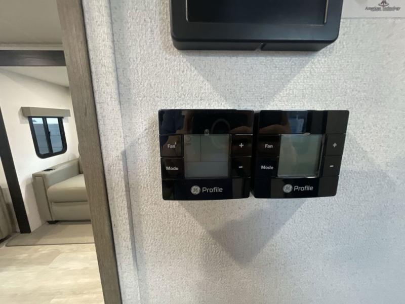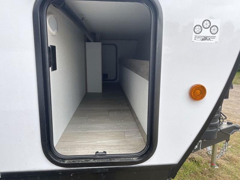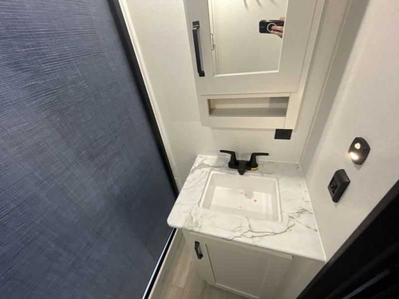 One look at this spacious travel trailer and you'll be sold! The rear kitchen features a U-shaped counter, an 11 cu. ft. refrigerator, plus a pantry for dry goods and snacks. There is a 1/2 dinette with bench seating, plus a tri-fold sofa and two theater seats. Everyone can take turns cleaning up in the full bath that includes a shower with a seat, then head outdoors to relax under the patio awnings with LED lights. When it's time for bed, you will enjoy the king bed slide out in the front bedroom. You'll also find a dresser and a closet here, plus a wardrobe with washer and dryer prep if you choose to add those appliances!