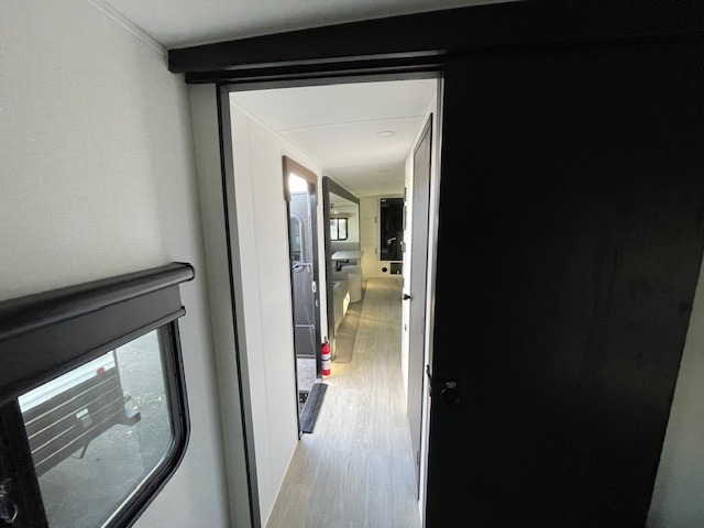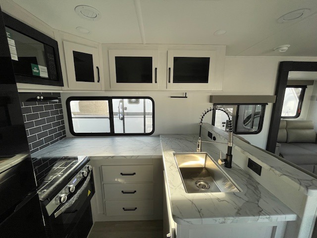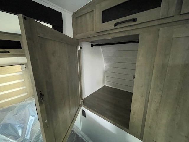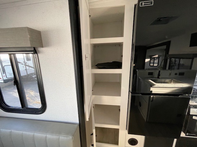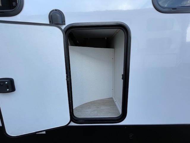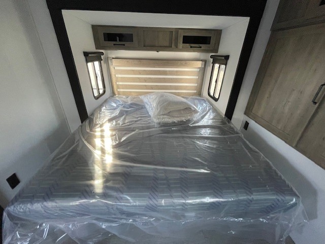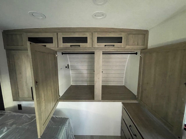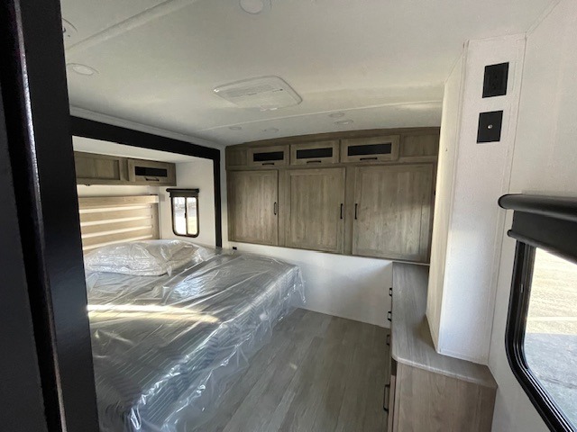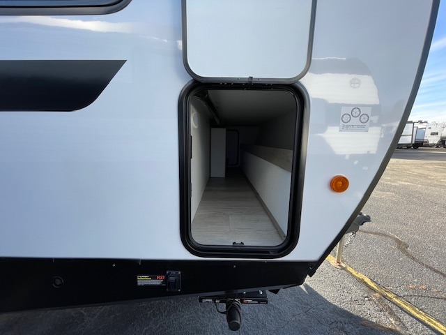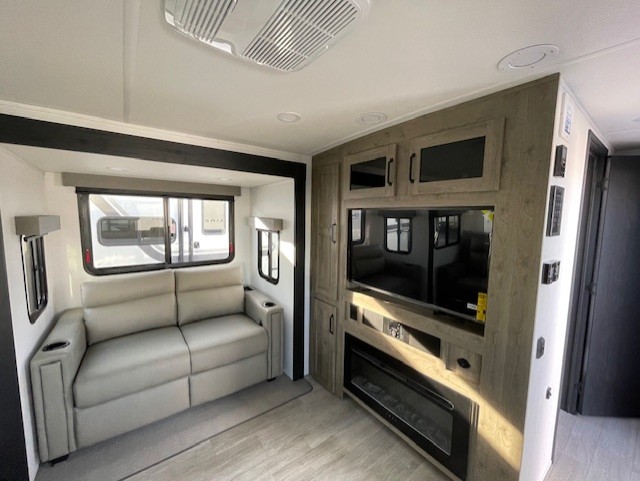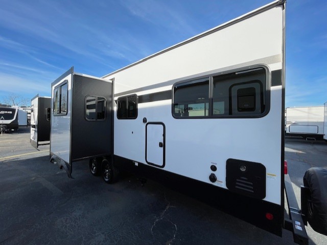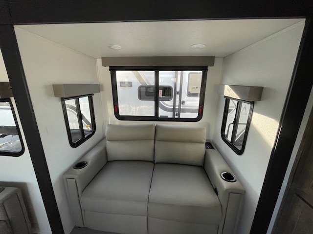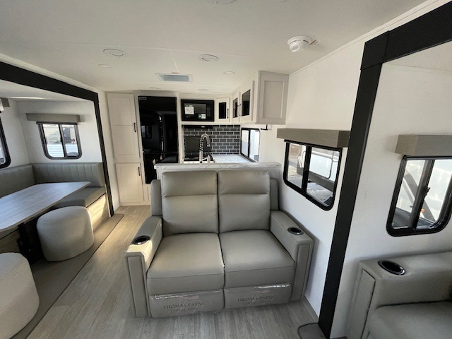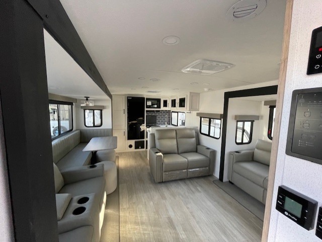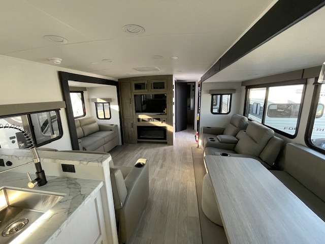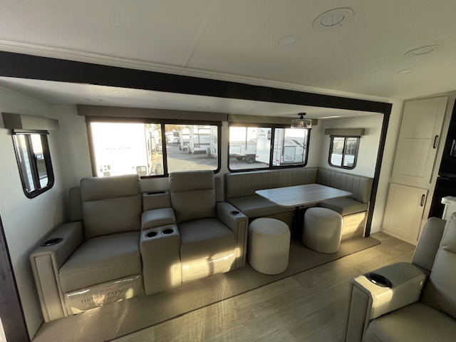 One look at this spacious travel trailer and you'll be sold! The rear kitchen features a U-shaped counter, an 11 cu. ft. refrigerator, plus a pantry for dry goods and snacks. There is a 1/2 dinette with bench seating, plus a tri-fold sofa and two theater seats. Everyone can take turns cleaning up in the full bath that includes a shower with a seat, then head outdoors to relax under the patio awnings with LED lights. When it's time for bed, you will enjoy the king bed slide out in the front bedroom. You'll also find a dresser and a closet here, plus a wardrobe with washer and dryer prep if you choose to add those appliances!