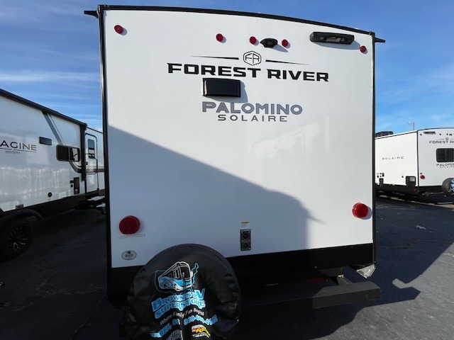 Each Solaire travel trailer by Forest River is constructed with a fully enclosed/heated underbelly for added protection against the elements, plus a fully laminated roof and rear wall for durability. The slam latch baggage doors with magnets will make it easier than ever to pack up your camp gear, and the power awning with LED lights will provide shade during the day and inviting ambiance at night. Head inside to enjoy the roller shades, smoked glass kitchen cabinet doors, stainless-steel sink, and LED lights to keep your space well lit. Some of the available options include a bedroom A/C, a Wi-Fi booster, heated holding tanks, and more!