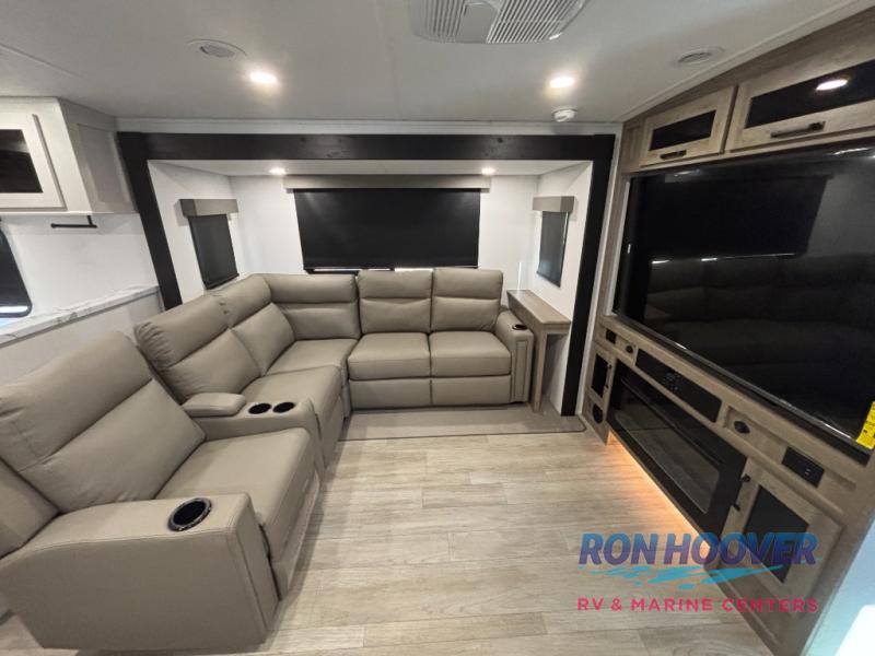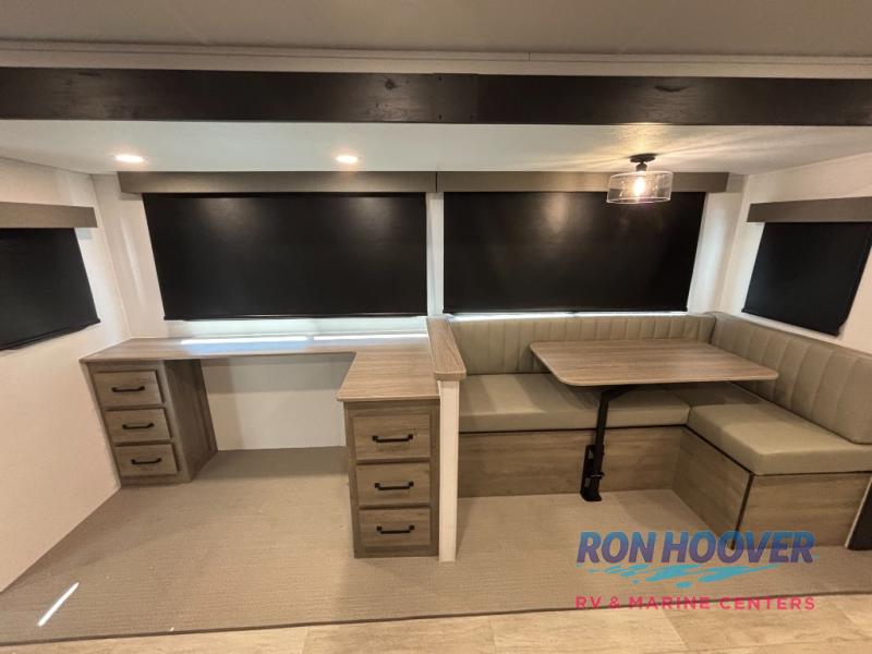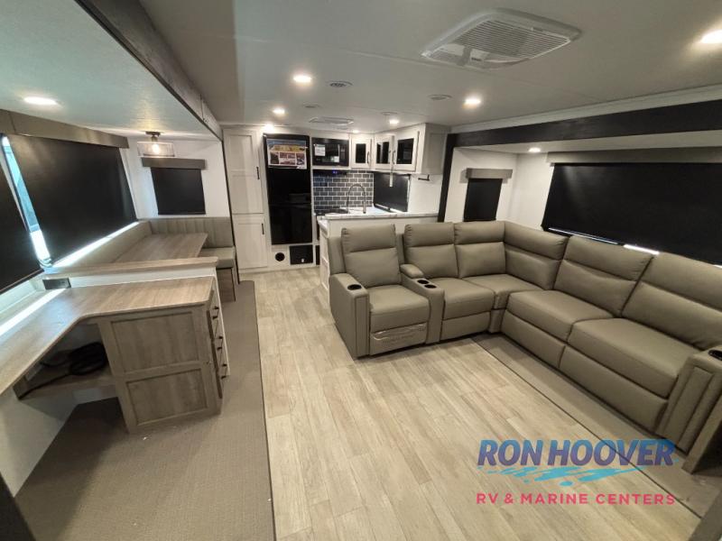 Time spent at the campground in this triple slide out travel trailer will be time well spent! Your crew can unload the pass-thru storage, put out the two power awnings, then head inside to make lunch in the rear kitchen. There is a cooktop and microwave here, along with a pantry and 11 cu. ft. electric refrigerator for food storage. A half dinette will provide a place to dine together, and you'll find more seating spaces on the L-shaped sofa that features a 56" theater seat and a 60" tri-fold sofa. There is also desk with a chair in this area if you need to get some work done at the campground. A spacious shower with a seat in the full bath is sure to bring comfort, and you'll love being able to stretch out at night on the king bed slide out. There is also a dresser and front closet for your things plus washer and dryer prep in the closet if you choose to add those appliances.