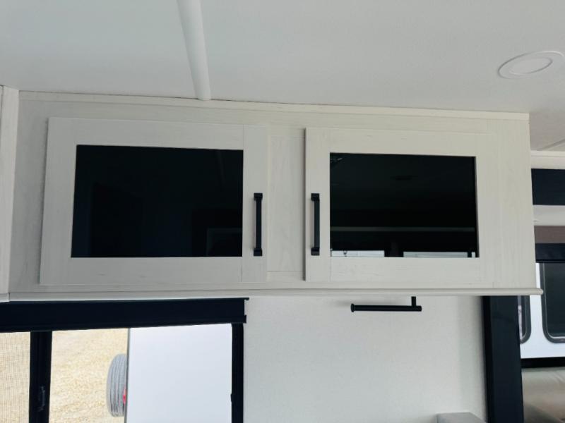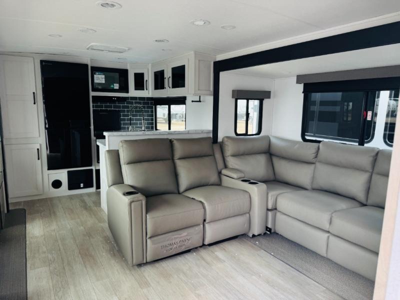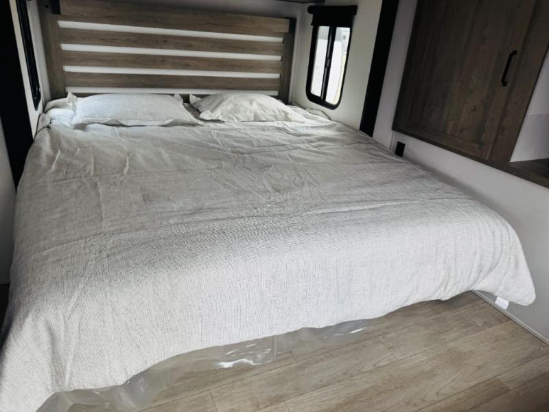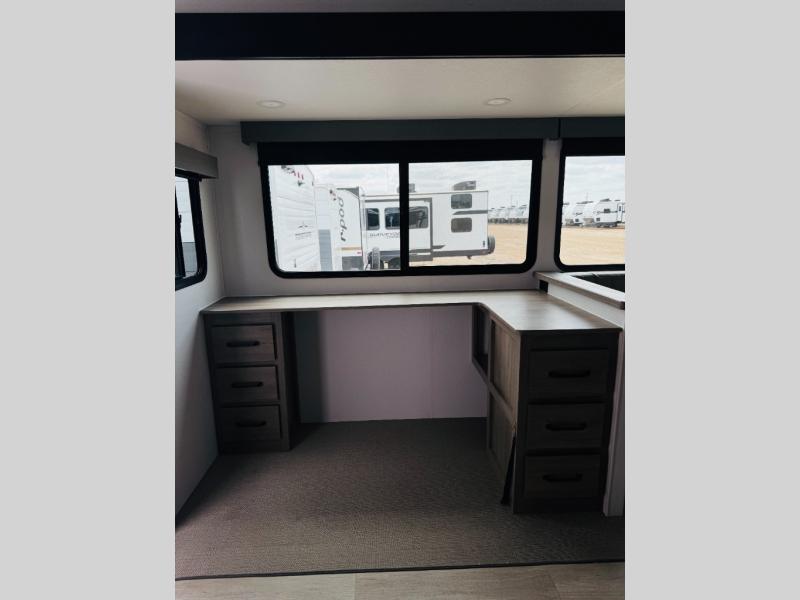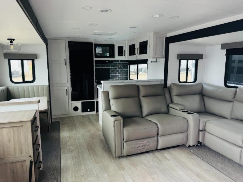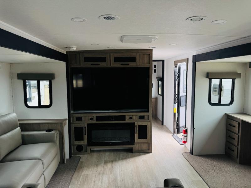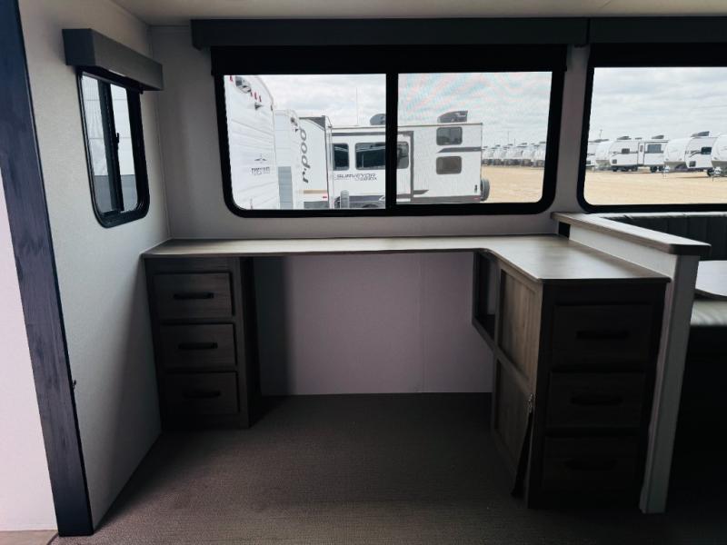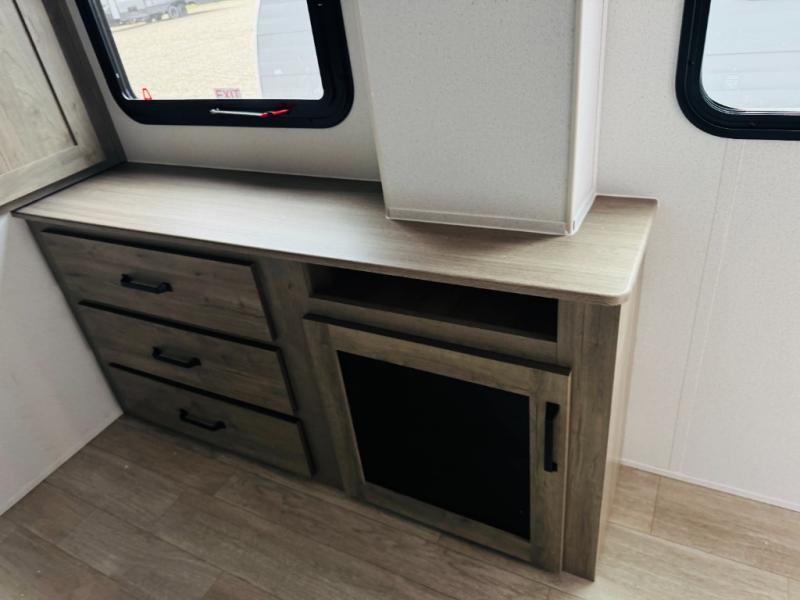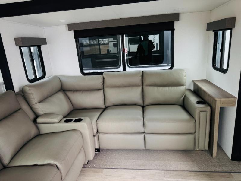 Time spent at the campground in this triple slide out travel trailer will be time well spent! Your crew can unload the pass-thru storage, put out the two power awnings, then head inside to make lunch in the rear kitchen. There is a cooktop and microwave here, along with a pantry and 11 cu. ft. electric refrigerator for food storage. A half dinette will provide a place to dine together, and you'll find more seating spaces on the L-shaped sofa that features a 56" theater seat and a 60" tri-fold sofa. There is also desk with a chair in this area if you need to get some work done at the campground. A spacious shower with a seat in the full bath is sure to bring comfort, and you'll love being able to stretch out at night on the king bed slide out. There is also a dresser and front closet for your things plus washer and dryer prep in the closet if you choose to add those appliances.