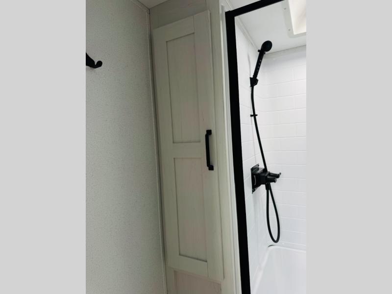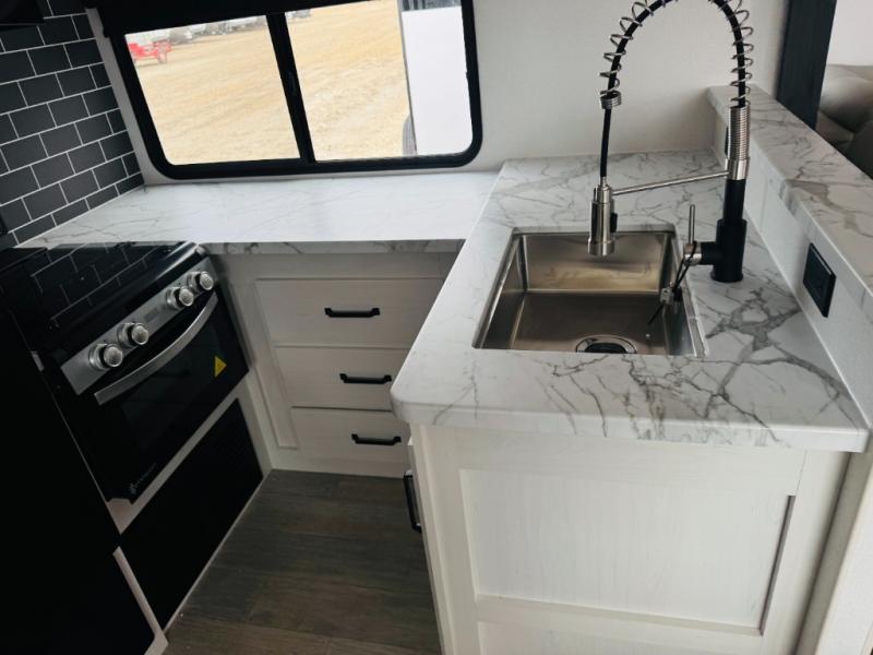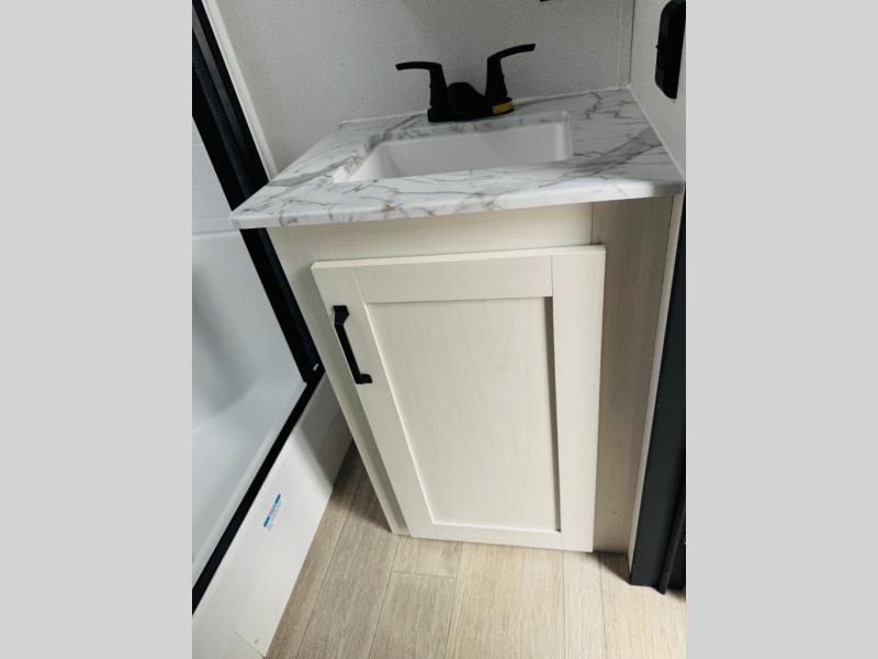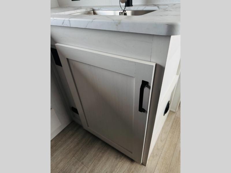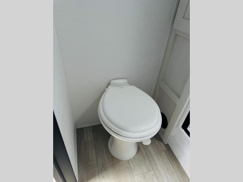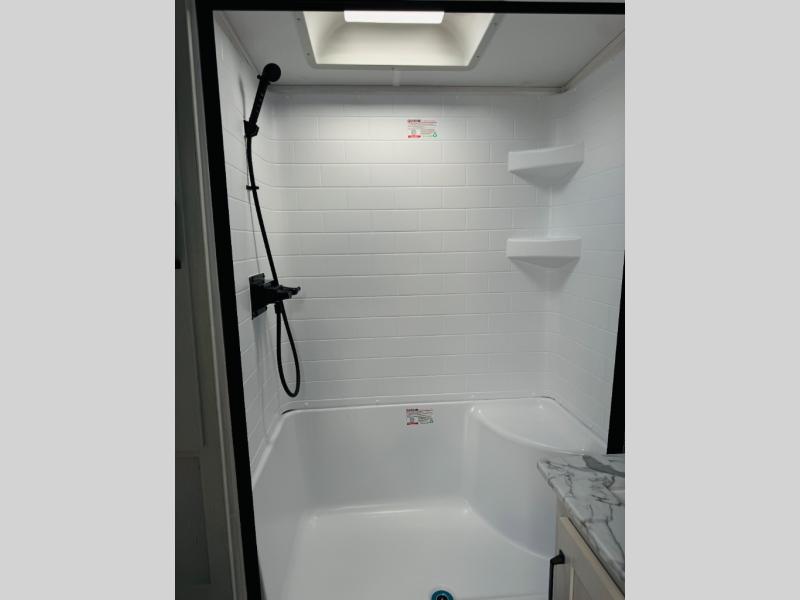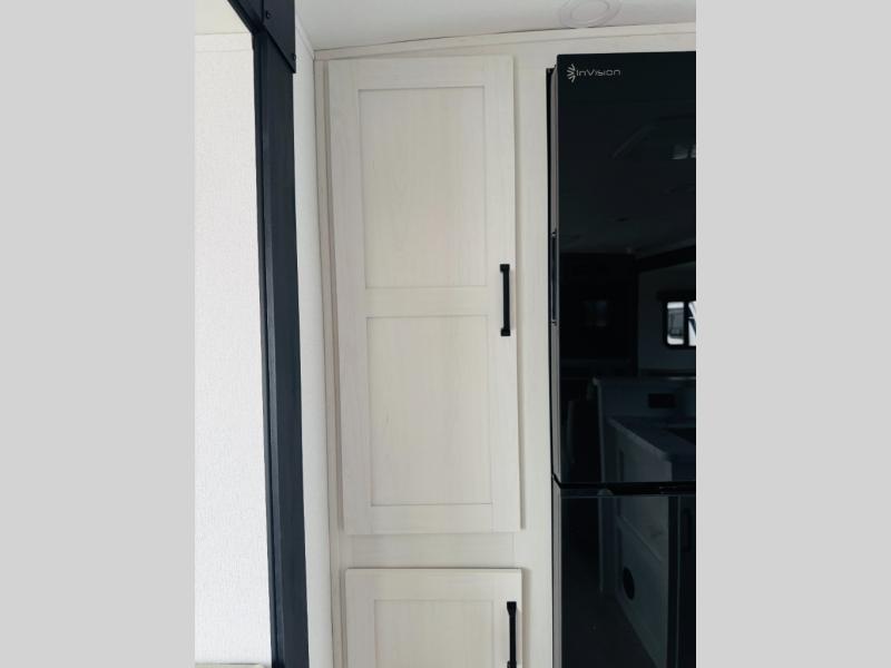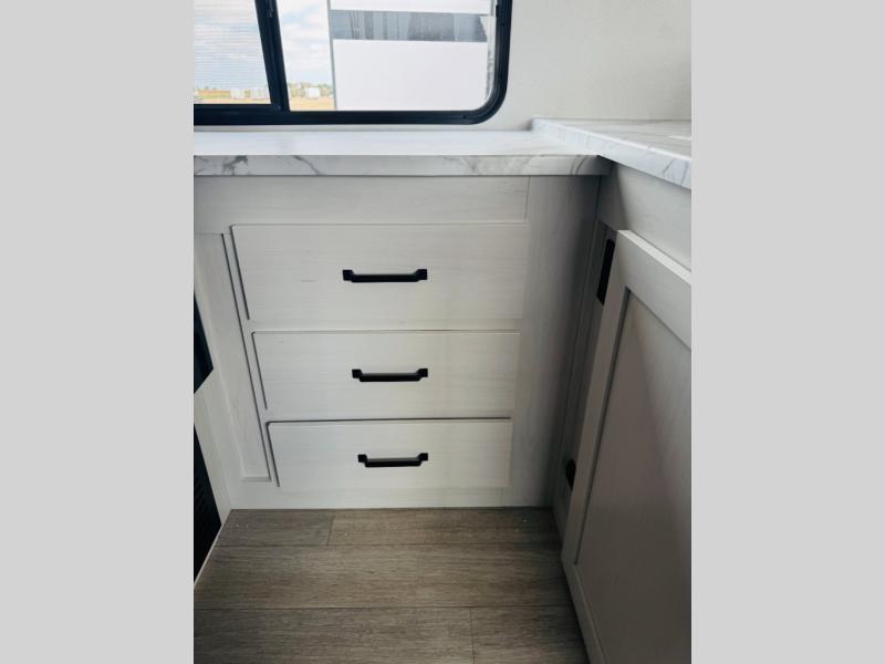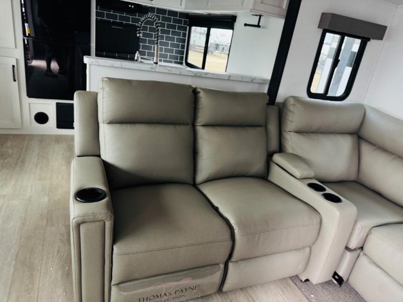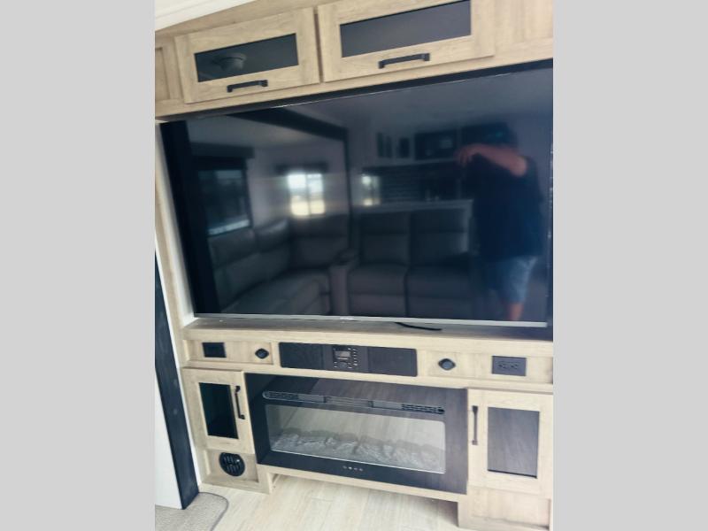 Time spent at the campground in this triple slide out travel trailer will be time well spent! Your crew can unload the pass-thru storage, put out the two power awnings, then head inside to make lunch in the rear kitchen. There is a cooktop and microwave here, along with a pantry and 11 cu. ft. electric refrigerator for food storage. A half dinette will provide a place to dine together, and you'll find more seating spaces on the L-shaped sofa that features a 56" theater seat and a 60" tri-fold sofa. There is also desk with a chair in this area if you need to get some work done at the campground. A spacious shower with a seat in the full bath is sure to bring comfort, and you'll love being able to stretch out at night on the king bed slide out. There is also a dresser and front closet for your things plus washer and dryer prep in the closet if you choose to add those appliances.