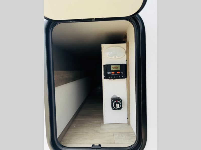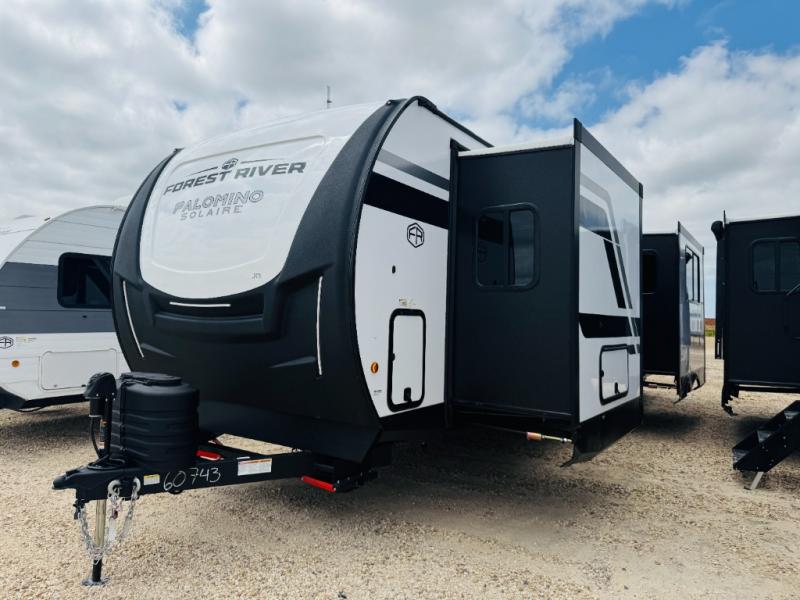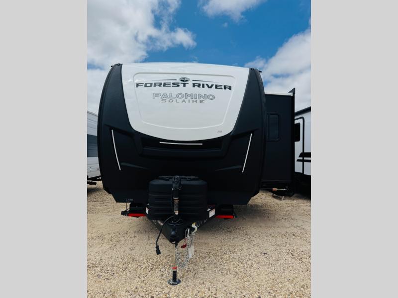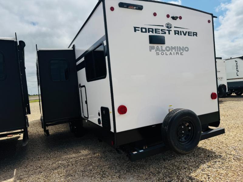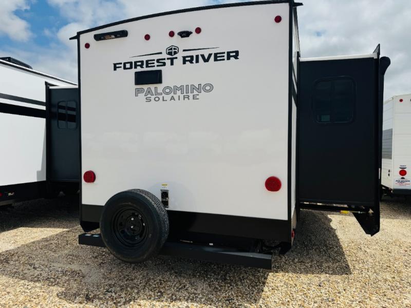 Each SolAire travel trailer by Palomino features a white gel coat exterior and an aluminum superstructure frame for lightweight towing. You will love having a power tongue jack for easy set up, plus slam latch baggage doors with magnets to make unloading easier than ever. There is also a power awning with LED lights and aluminum wheels included on the exterior. Each SolAire is constructed to last with Azdel composite, a fully laminated rear wall and roof, plus a fully enclosed and heated underbelly. The interior includes roller shades and kitchen backsplash, USB ports to keep your electronics charged, a Bluetooth stereo with speakers, and many more stand-out features!