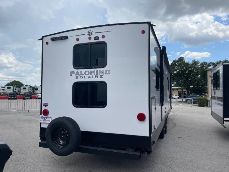 Each SolAire travel trailer by Palomino features a white gel coat exterior and an aluminum superstructure frame for lightweight towing. You will love having a power tongue jack for easy set up, plus slam latch baggage doors with magnets to make unloading easier than ever. There is also a power awning with LED lights and aluminum wheels included on the exterior. Each SolAire is constructed to last with Azdel composite, a fully laminated rear wall and roof, plus a fully enclosed and heated underbelly. The interior includes roller shades and kitchen backsplash, USB ports to keep your electronics charged, a Bluetooth stereo with speakers, and many more stand-out features!