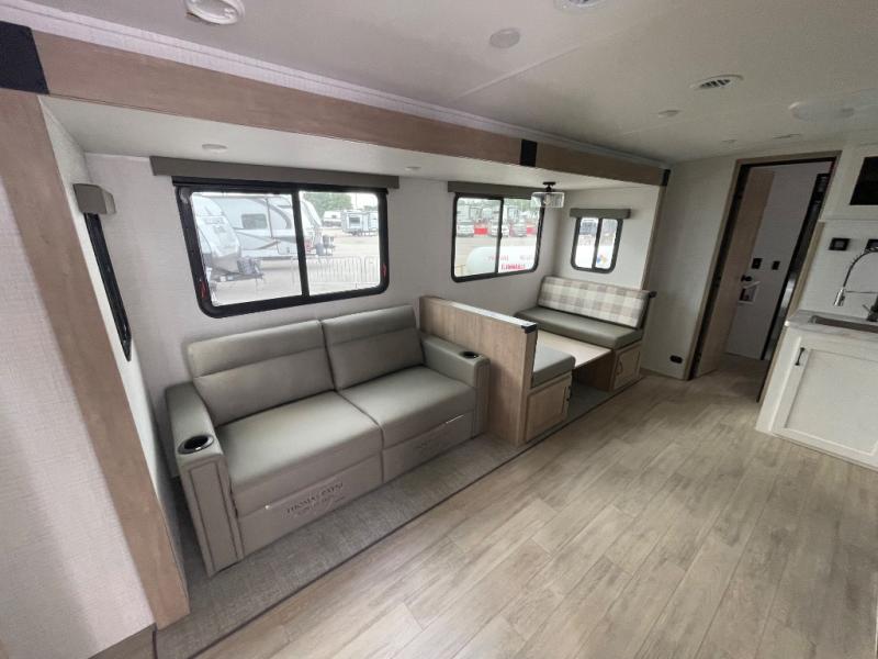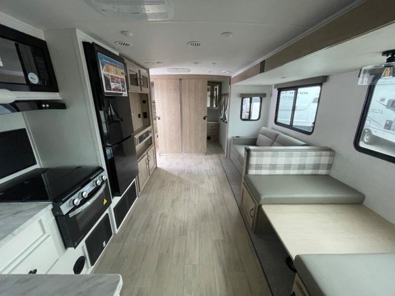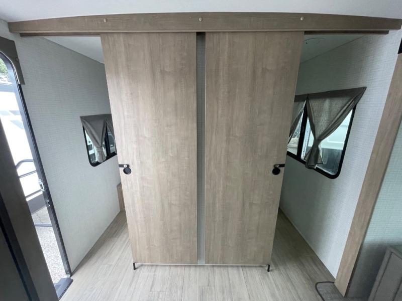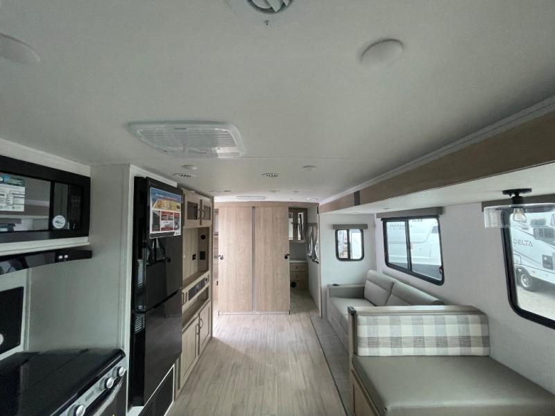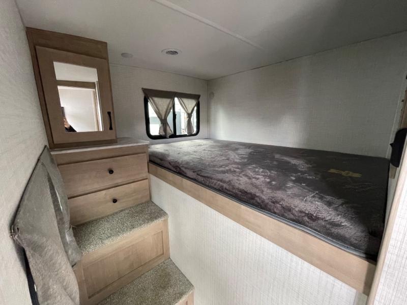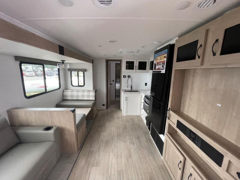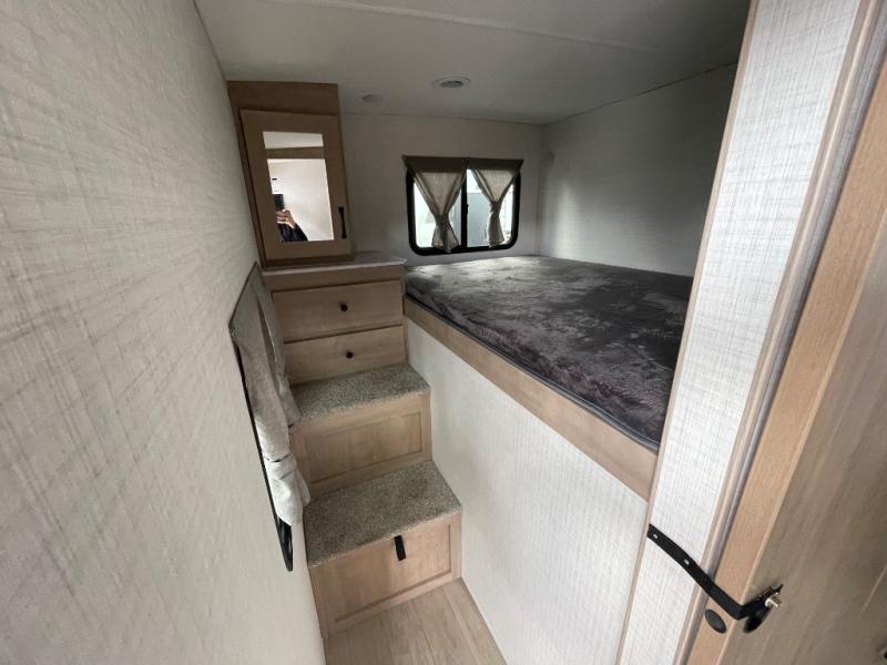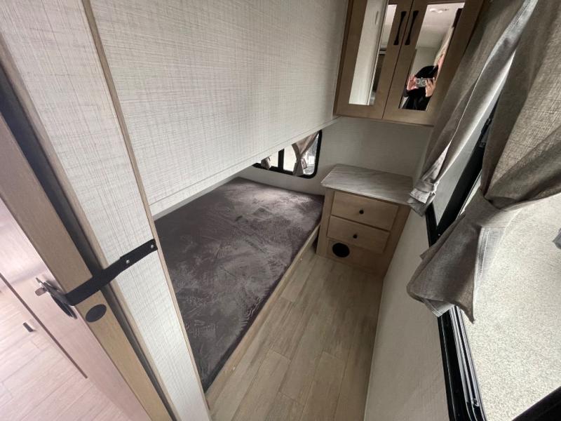 Whether you are looking for a bunkhouse, a private bedroom, or dual entry doors in your next RV, this one might just be the perfect fit with all those features! There are 45" x 72" bunk beds, each with their own wardrobe and their own private entry door, making it perfect for camping with older kids. The galley kitchen offers amenities such as a microwave, cooktop, an 11 cu. ft. refrigerator, and an L-shaped counter for preparing and serving meals. You will also find more storage, an entertainment center and a slide out sofa sleeper and booth dinette that offer more sleeping space when needed.