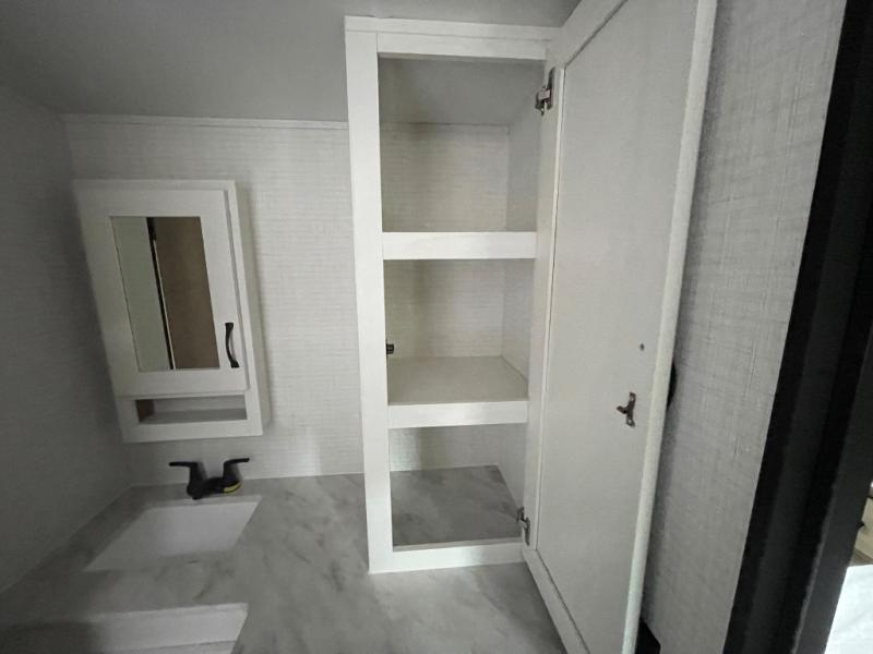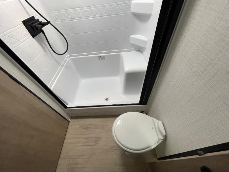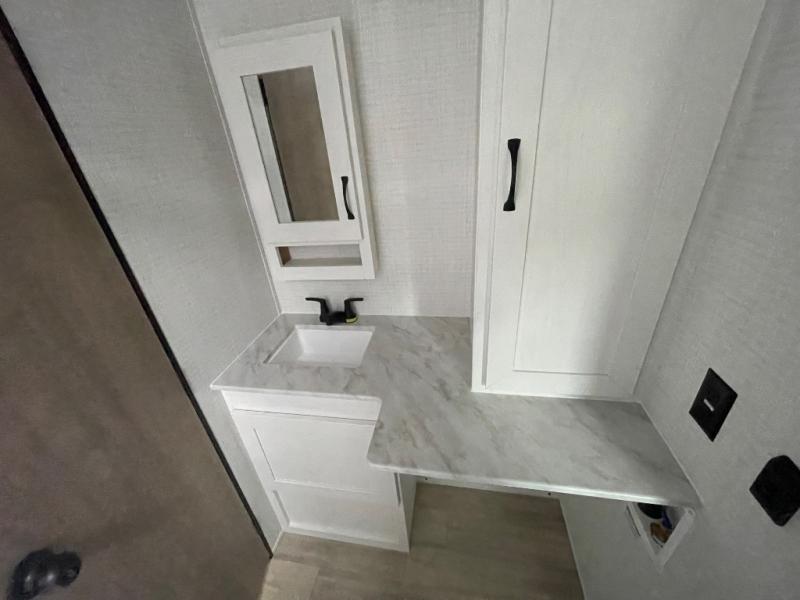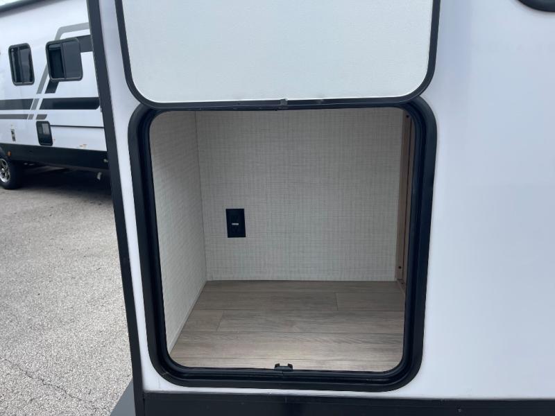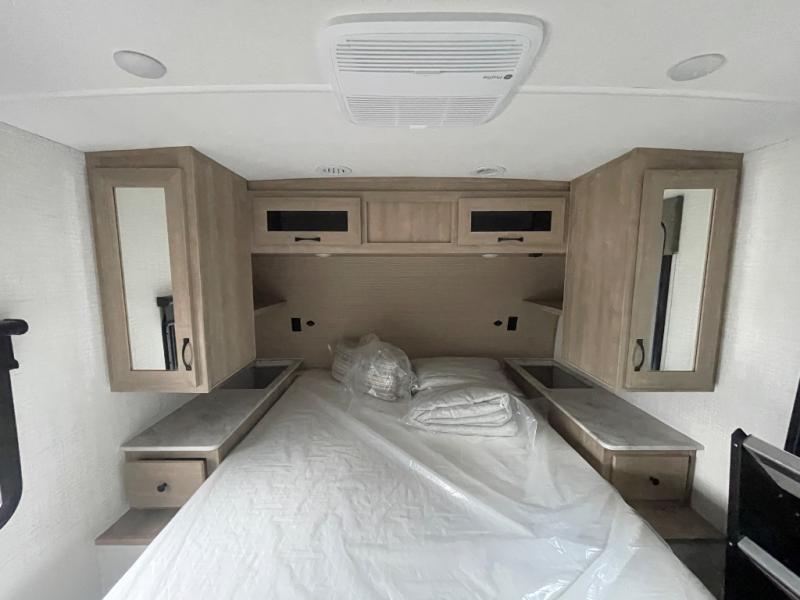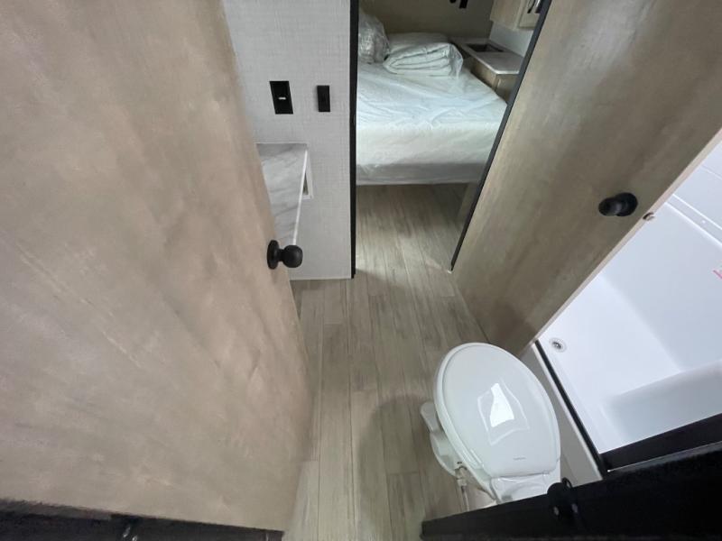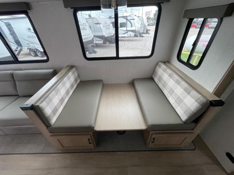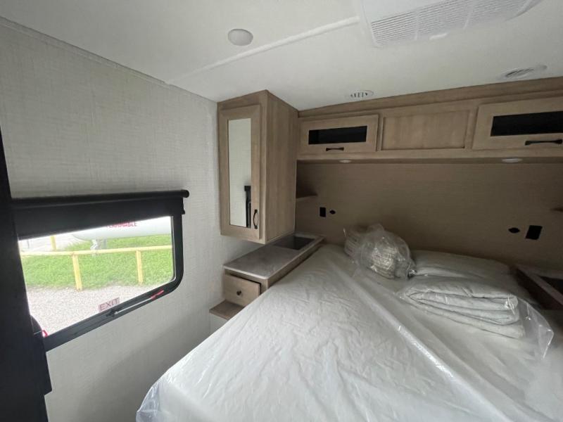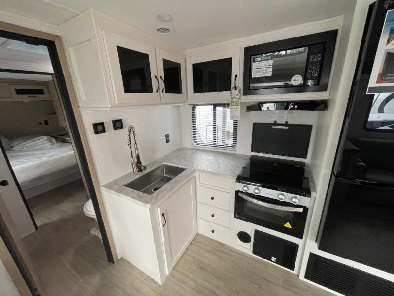 Whether you are looking for a bunkhouse, a private bedroom, or dual entry doors in your next RV, this one might just be the perfect fit with all those features! There are 45" x 72" bunk beds, each with their own wardrobe and their own private entry door, making it perfect for camping with older kids. The galley kitchen offers amenities such as a microwave, cooktop, an 11 cu. ft. refrigerator, and an L-shaped counter for preparing and serving meals. You will also find more storage, an entertainment center and a slide out sofa sleeper and booth dinette that offer more sleeping space when needed.