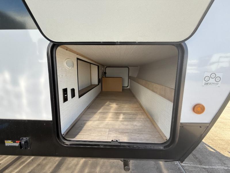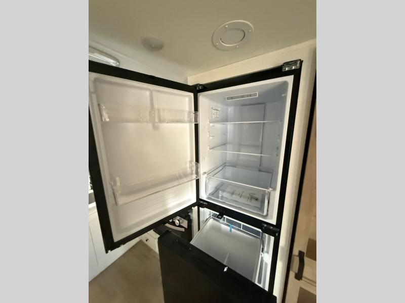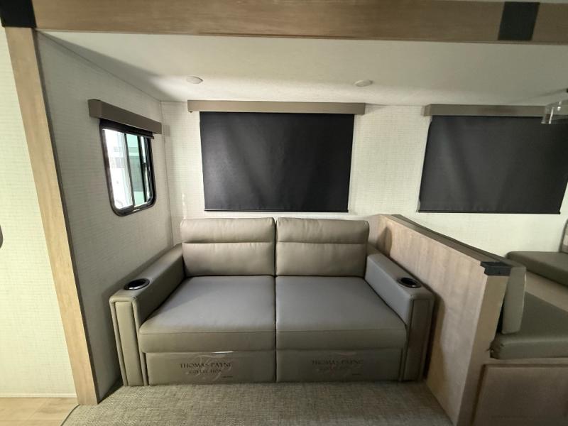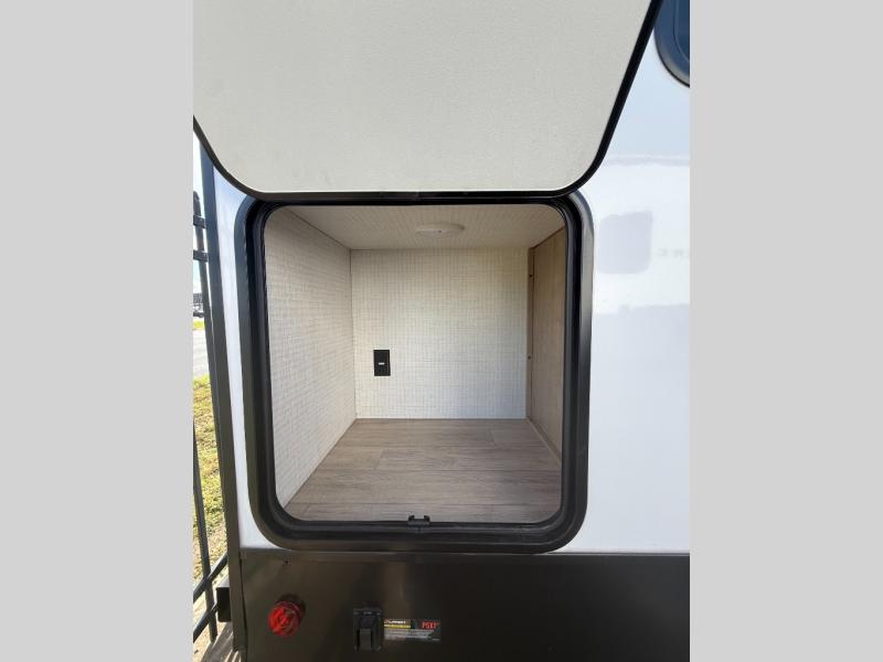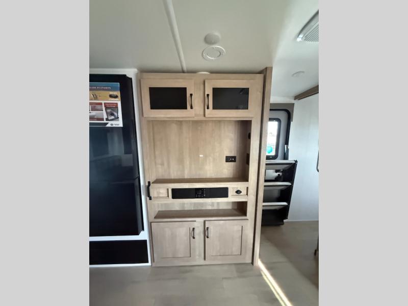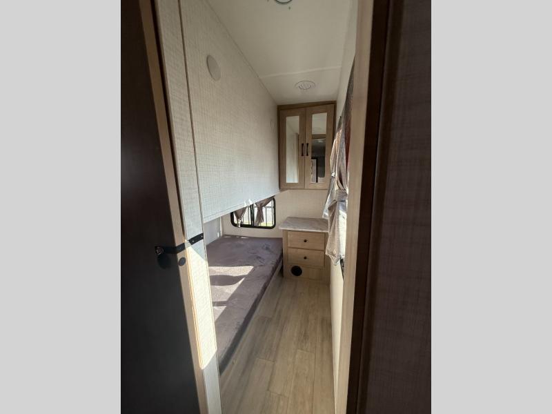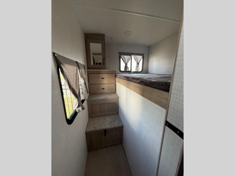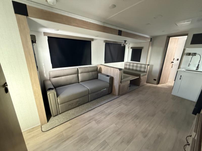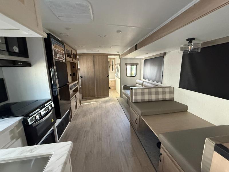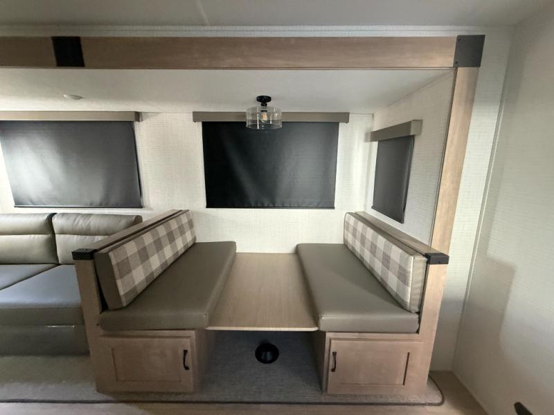 Whether you are looking for a bunkhouse, a private bedroom, or dual entry doors in your next RV, this one might just be the perfect fit with all those features! There are 45" x 72" bunk beds, each with their own wardrobe and their own private entry door, making it perfect for camping with older kids. The galley kitchen offers amenities such as a microwave, cooktop, an 11 cu. ft. refrigerator, and an L-shaped counter for preparing and serving meals. You will also find more storage, an entertainment center and a slide out sofa sleeper and booth dinette that offer more sleeping space when needed.