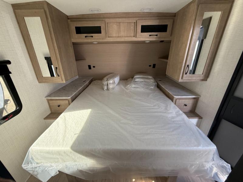 Each Solaire travel trailer by Forest River is constructed with a fully enclosed/heated underbelly for added protection against the elements, plus a fully laminated roof and rear wall for durability. The slam latch baggage doors with magnets will make it easier than ever to pack up your camp gear, and the power awning with LED lights will provide shade during the day and inviting ambiance at night. Head inside to enjoy the roller shades, smoked glass kitchen cabinet doors, stainless-steel sink, and LED lights to keep your space well lit. Some of the available options include a bedroom A/C, a Wi-Fi booster, heated holding tanks, and more!