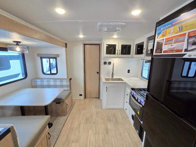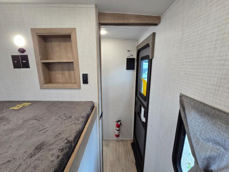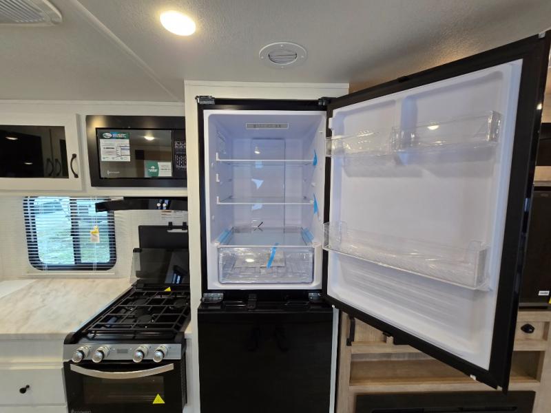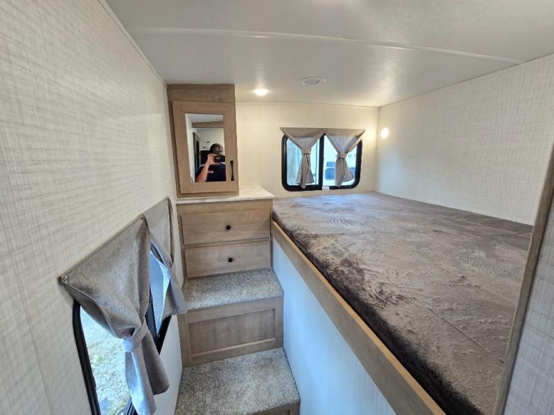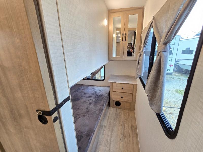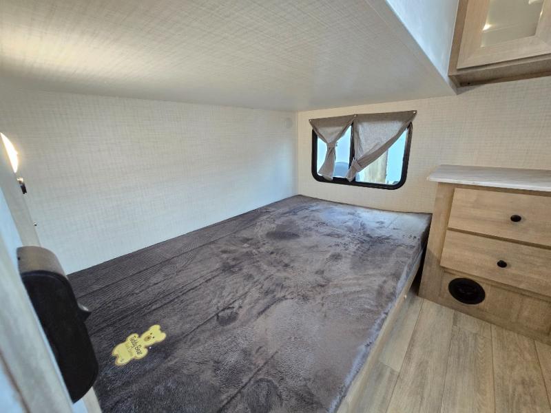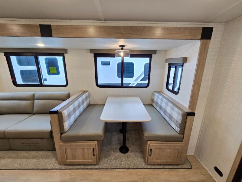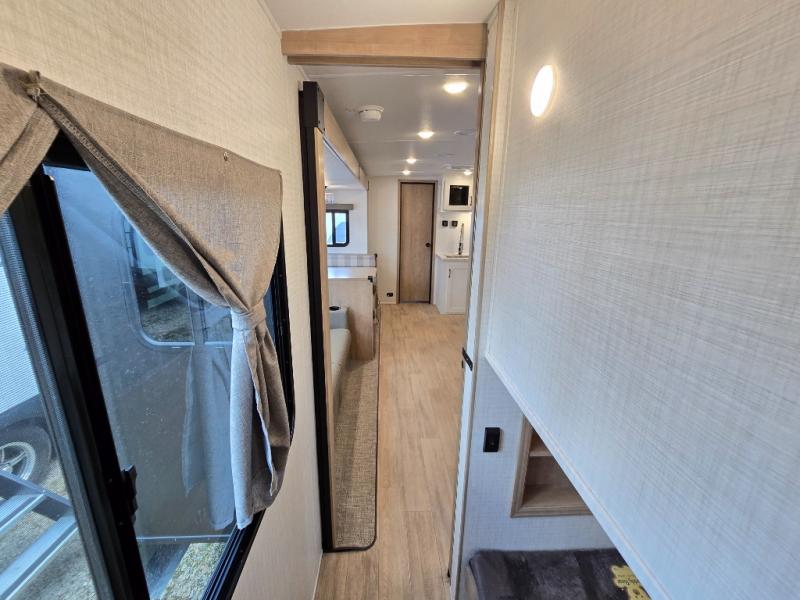 Whether you are looking for a bunkhouse, a private bedroom, or dual entry doors in your next RV, this one might just be the perfect fit with all those features! There are 45" x 72" bunk beds, each with their own wardrobe and their own private entry door, making it perfect for camping with older kids. The galley kitchen offers amenities such as a microwave, cooktop, an 11 cu. ft. refrigerator, and an L-shaped counter for preparing and serving meals. You will also find more storage, an entertainment center and a slide out sofa sleeper and booth dinette that offer more sleeping space when needed.