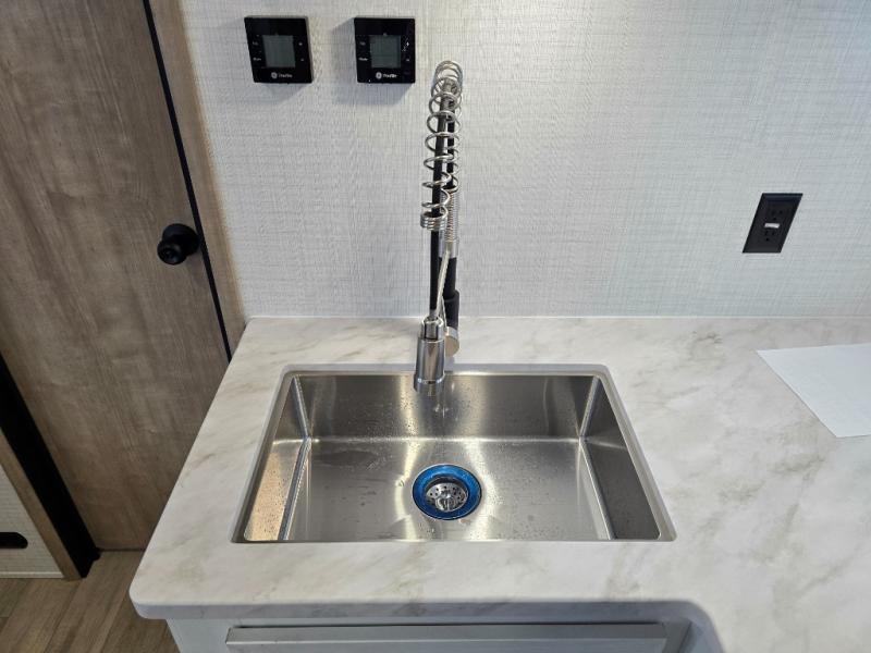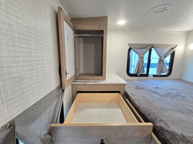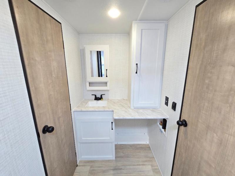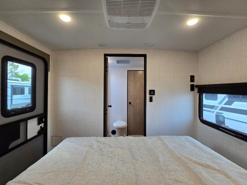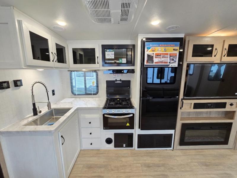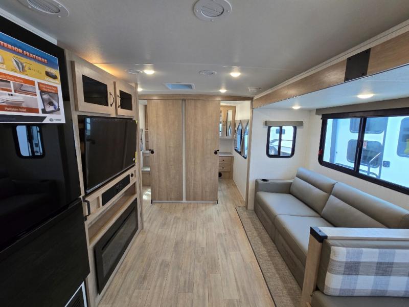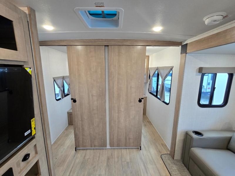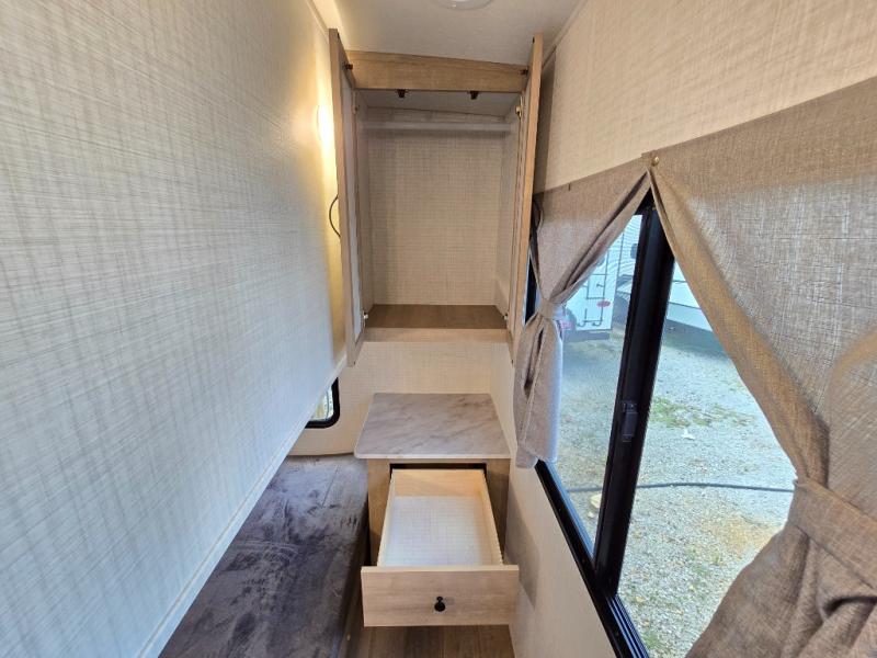 Whether you are looking for a bunkhouse, a private bedroom, or dual entry doors in your next RV, this one might just be the perfect fit with all those features! There are 45" x 72" bunk beds, each with their own wardrobe and their own private entry door, making it perfect for camping with older kids. The galley kitchen offers amenities such as a microwave, cooktop, an 11 cu. ft. refrigerator, and an L-shaped counter for preparing and serving meals. You will also find more storage, an entertainment center and a slide out sofa sleeper and booth dinette that offer more sleeping space when needed.
