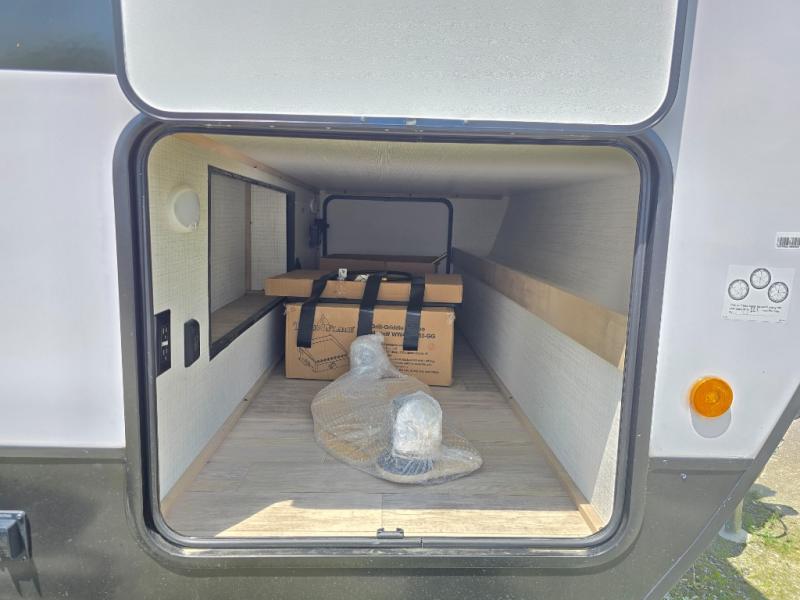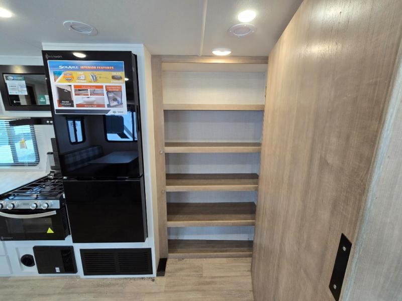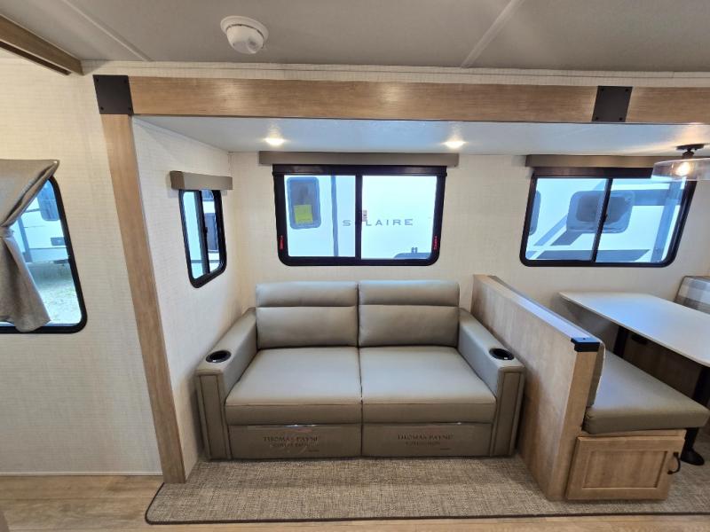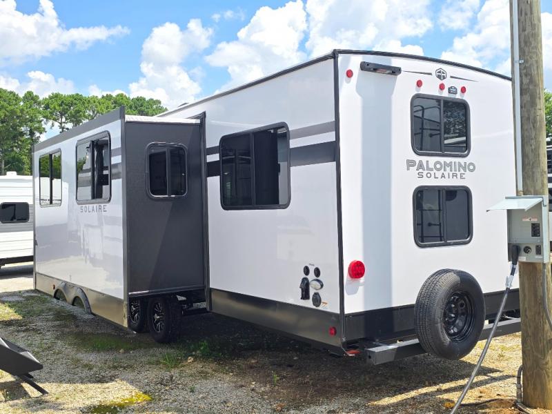 Each SolAire travel trailer by Palomino features a white gel coat exterior and an aluminum superstructure frame for lightweight towing. You will love having a power tongue jack for easy set up, plus slam latch baggage doors with magnets to make unloading easier than ever. There is also a power awning with LED lights and aluminum wheels included on the exterior. Each SolAire is constructed to last with Azdel composite, a fully laminated rear wall and roof, plus a fully enclosed and heated underbelly. The interior includes roller shades and kitchen backsplash, USB ports to keep your electronics charged, a Bluetooth stereo with speakers, and many more stand-out features!