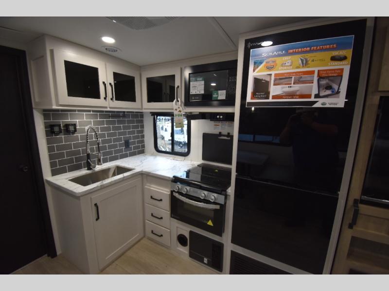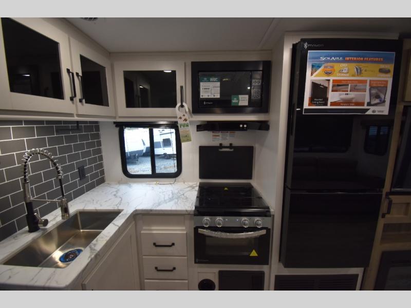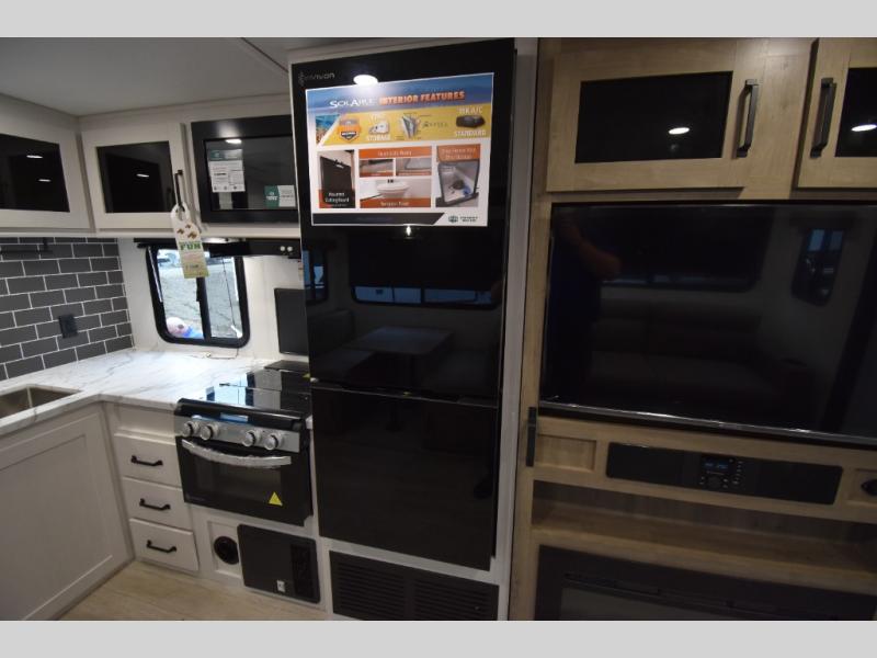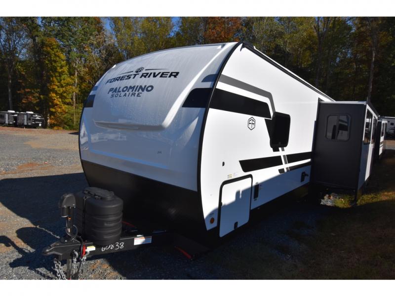Each SolAire travel trailer by Palomino features a white gel coat exterior and an aluminum superstructure frame for lightweight towing. You will love having a power tongue jack for easy set up, plus slam latch baggage doors with magnets to make unloading easier than ever. There is also a power awning with LED lights and aluminum wheels included on the exterior. Each SolAire is constructed to last with Azdel composite, a fully laminated rear wall and roof, plus a fully enclosed and heated underbelly. The interior includes roller shades and kitchen backsplash, USB ports to keep your electronics charged, a Bluetooth stereo with speakers, and many more stand-out features!