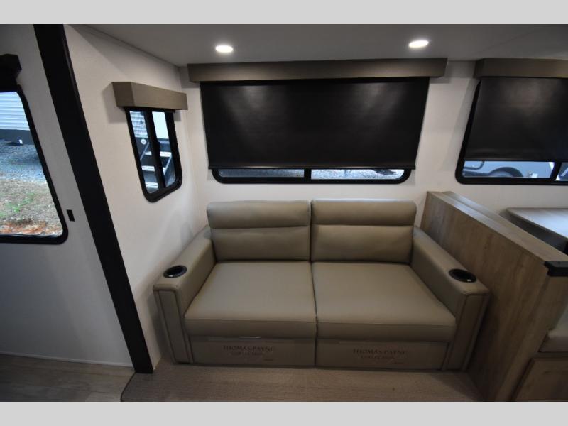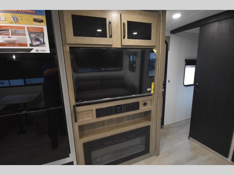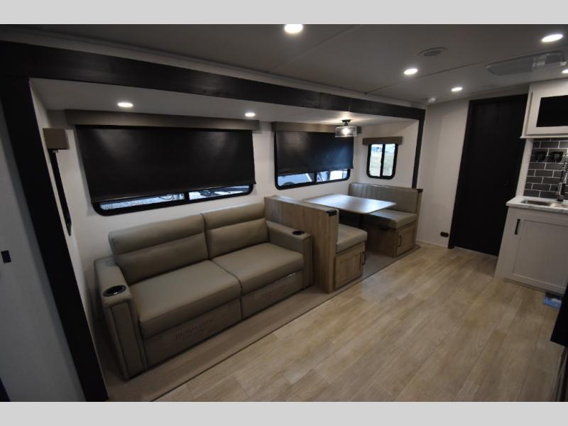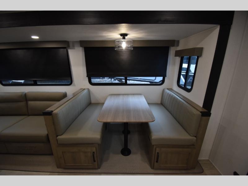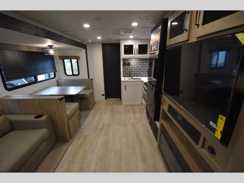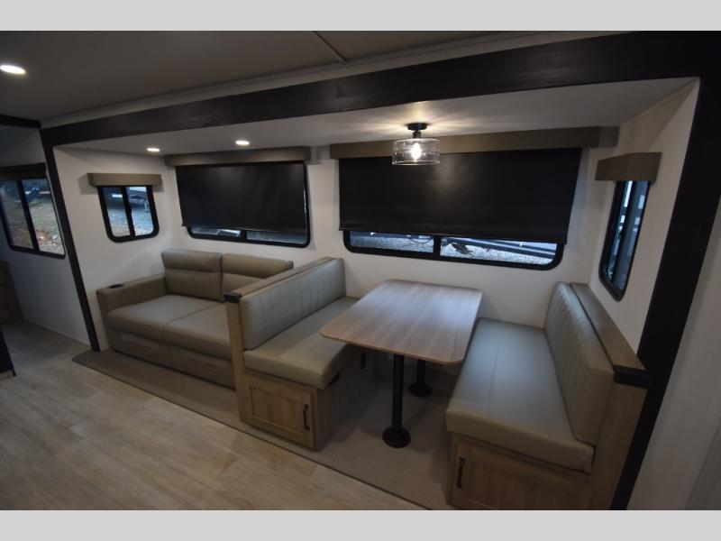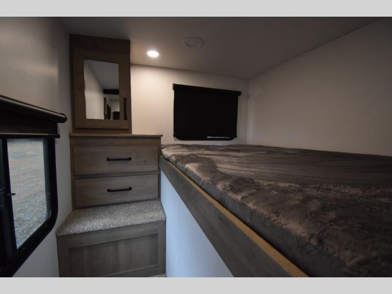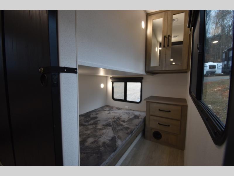 Whether you are looking for a bunkhouse, a private bedroom, or dual entry doors in your next RV, this one might just be the perfect fit with all those features! There are 45" x 72" bunk beds, each with their own wardrobe and their own private entry door, making it perfect for camping with older kids. The galley kitchen offers amenities such as a microwave, cooktop, an 11 cu. ft. refrigerator, and an L-shaped counter for preparing and serving meals. You will also find more storage, an entertainment center and a slide out sofa sleeper and booth dinette that offer more sleeping space when needed.