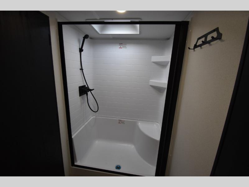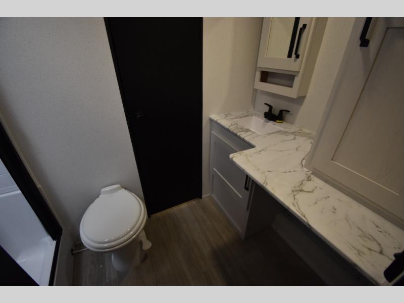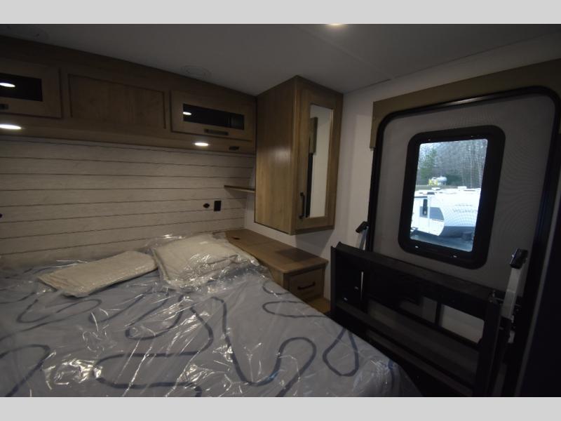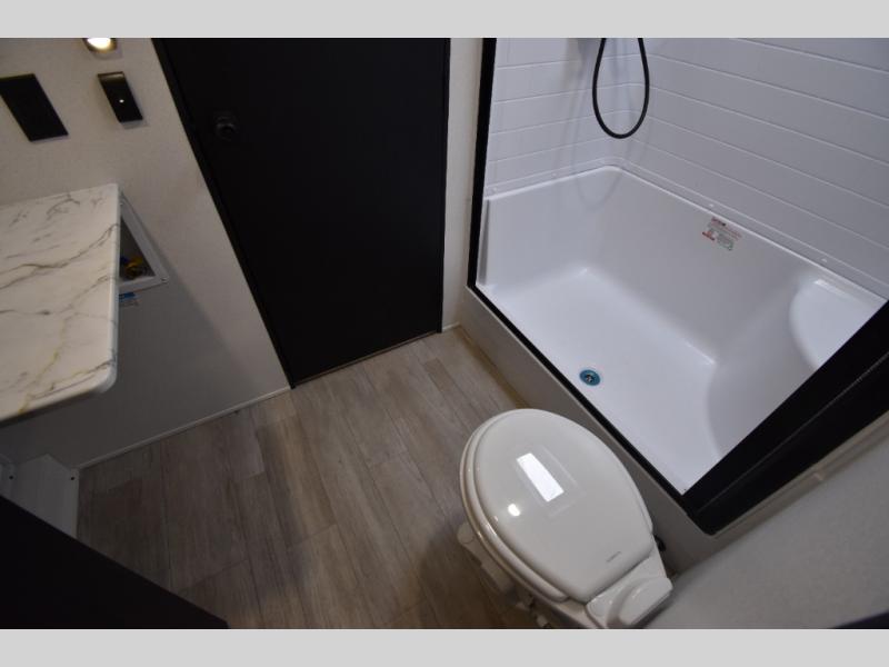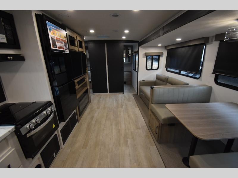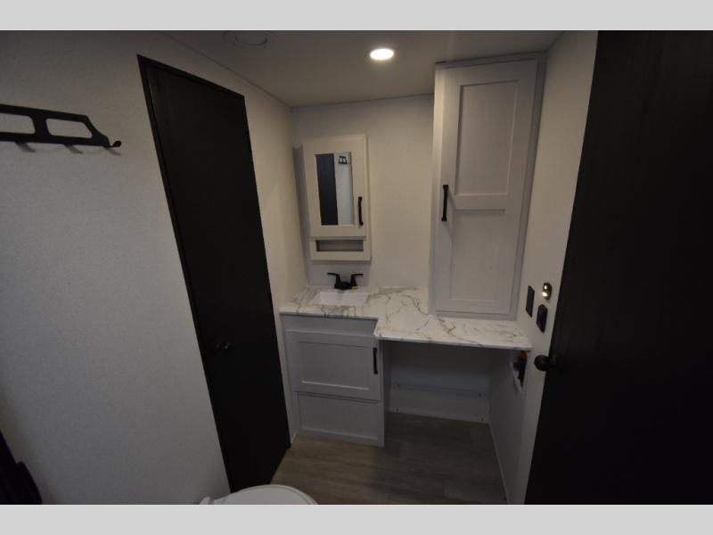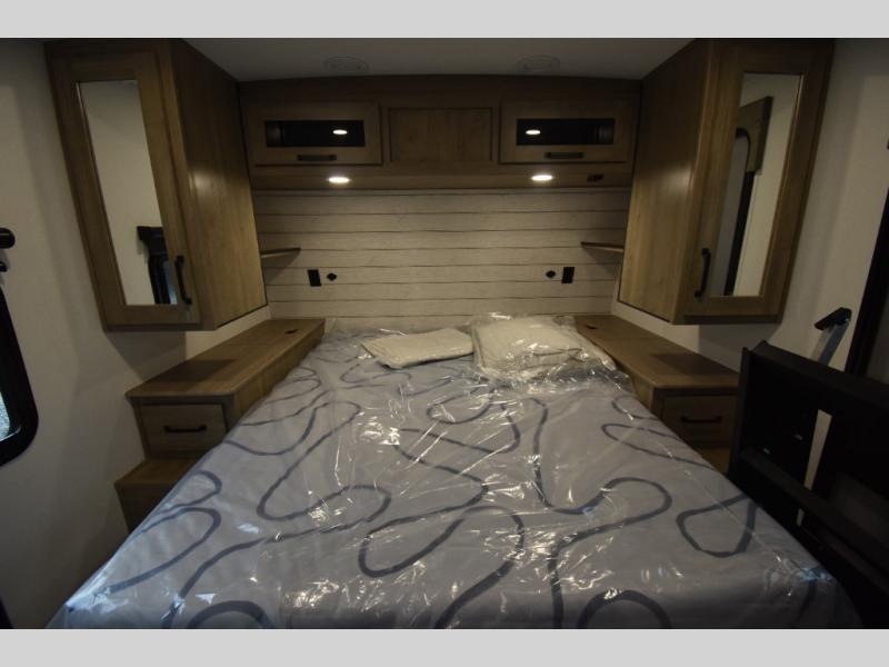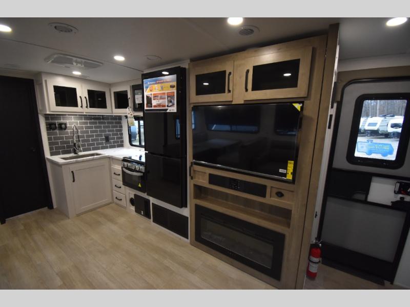 Whether you are looking for a bunkhouse, a private bedroom, or dual entry doors in your next RV, this one might just be the perfect fit with all those features! There are 45" x 72" bunk beds, each with their own wardrobe and their own private entry door, making it perfect for camping with older kids. The galley kitchen offers amenities such as a microwave, cooktop, an 11 cu. ft. refrigerator, and an L-shaped counter for preparing and serving meals. You will also find more storage, an entertainment center and a slide out sofa sleeper and booth dinette that offer more sleeping space when needed.