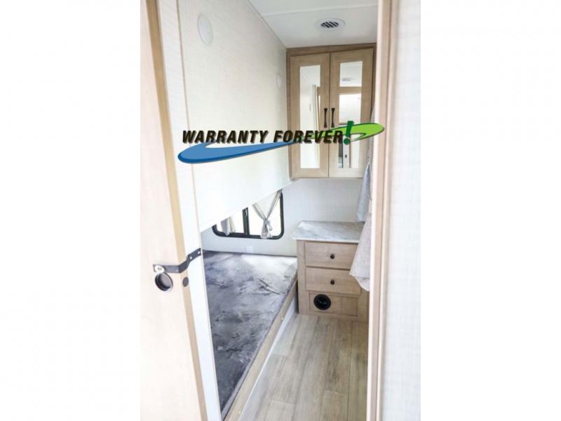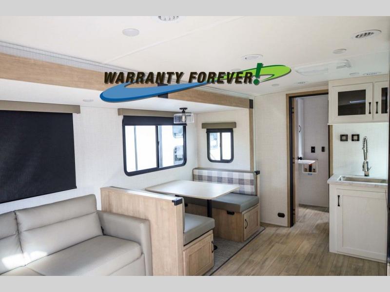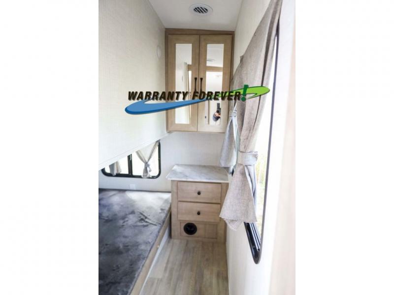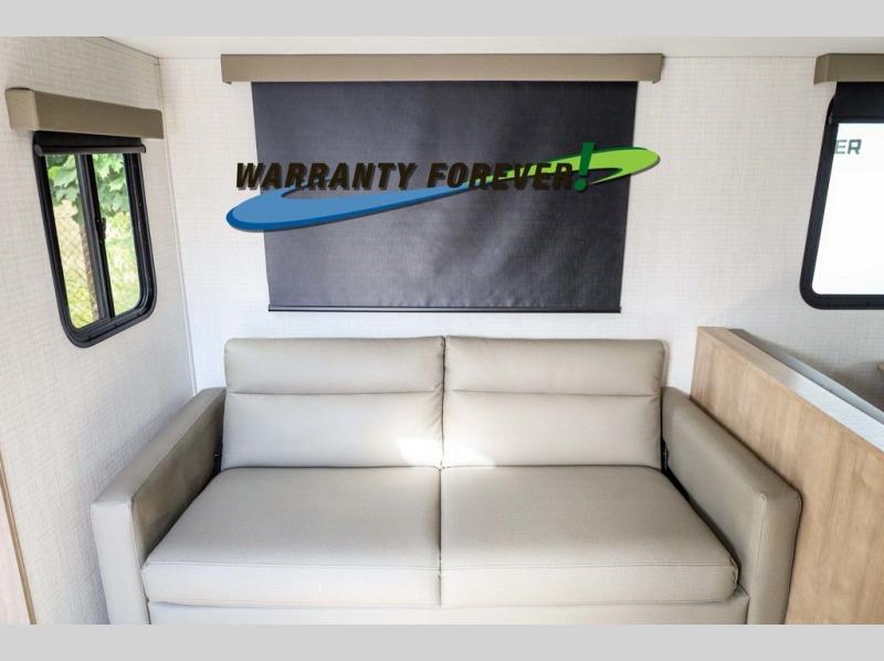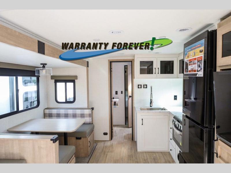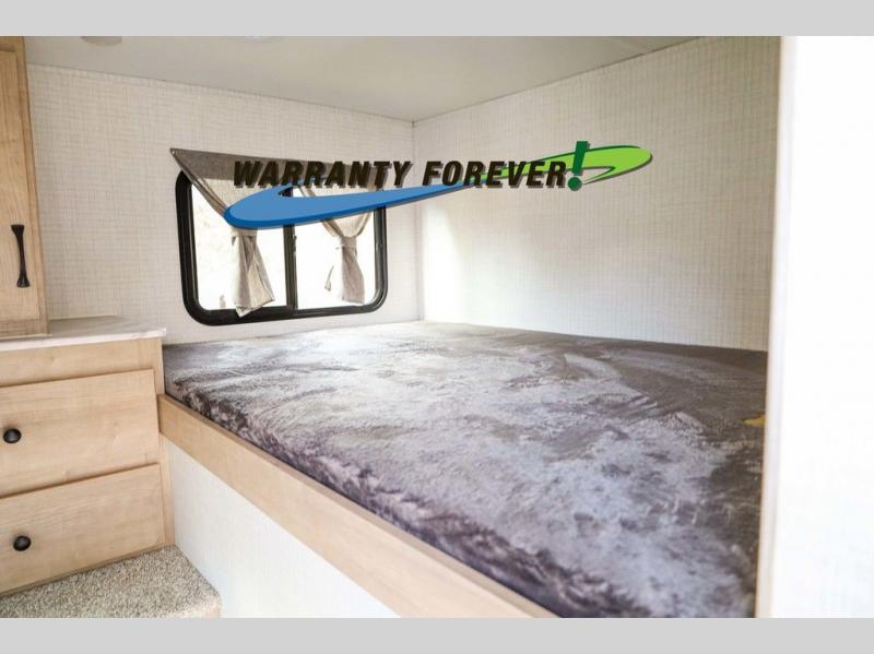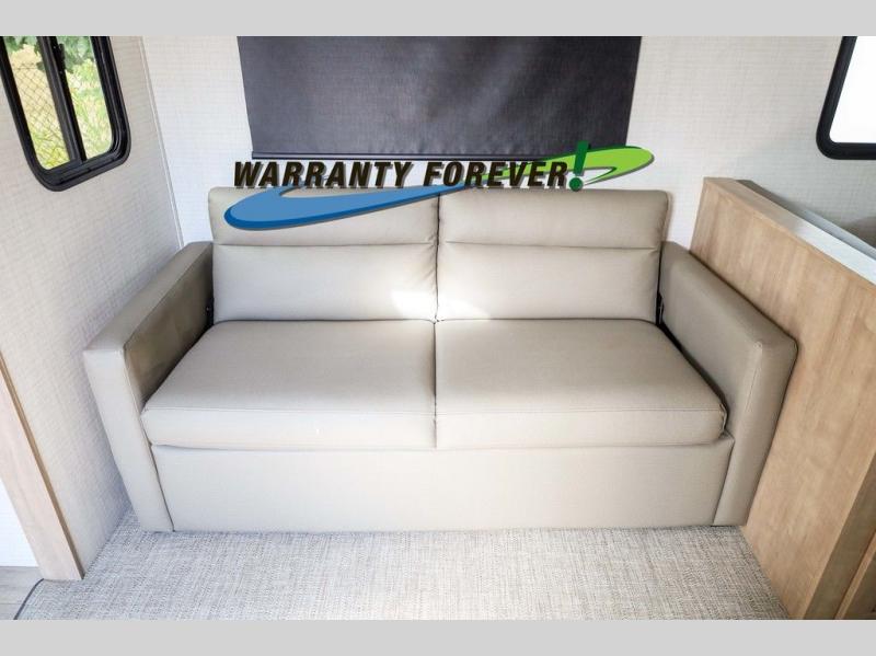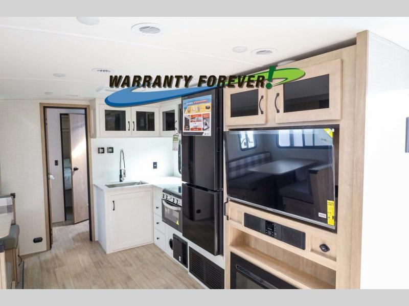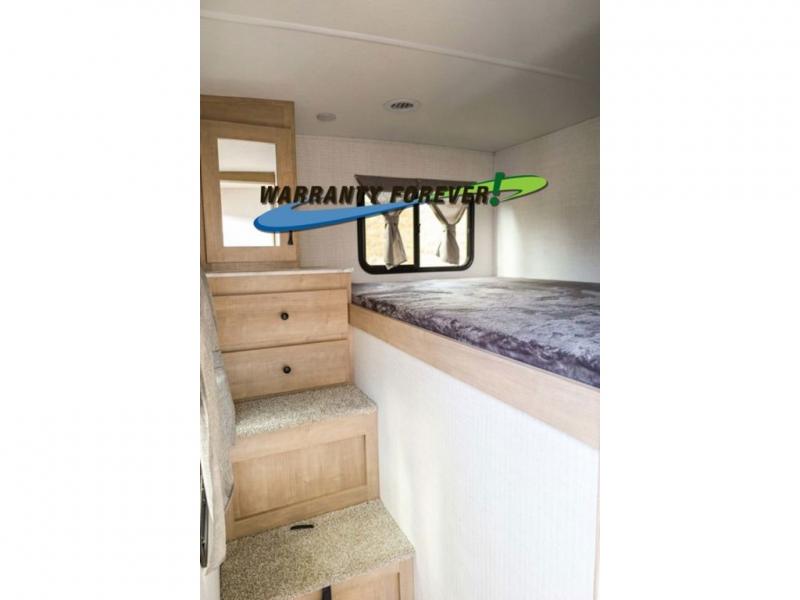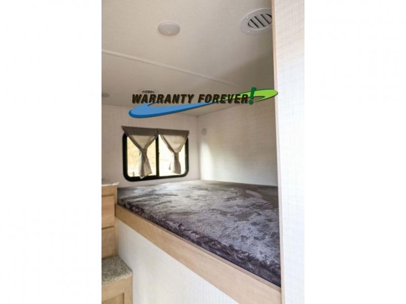 Whether you are looking for a bunkhouse, a private bedroom, or dual entry doors in your next RV, this one might just be the perfect fit with all those features! There are 45" x 72" bunk beds, each with their own wardrobe and their own private entry door, making it perfect for camping with older kids. The galley kitchen offers amenities such as a microwave, cooktop, an 11 cu. ft. refrigerator, and an L-shaped counter for preparing and serving meals. You will also find more storage, an entertainment center and a slide out sofa sleeper and booth dinette that offer more sleeping space when needed.
