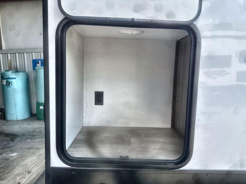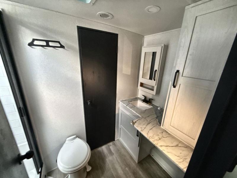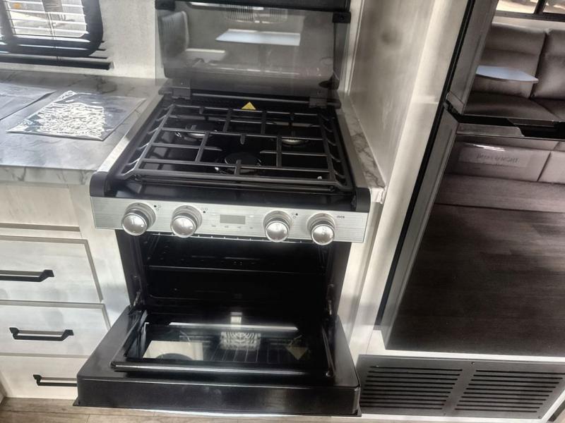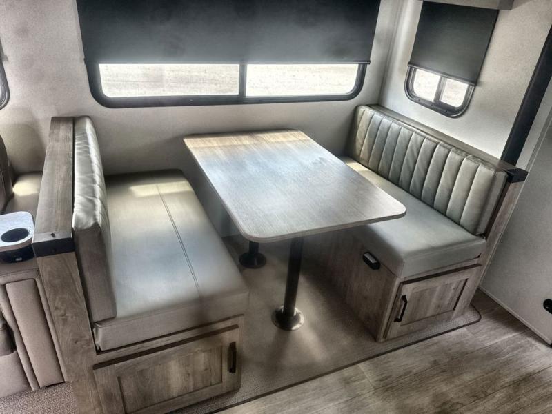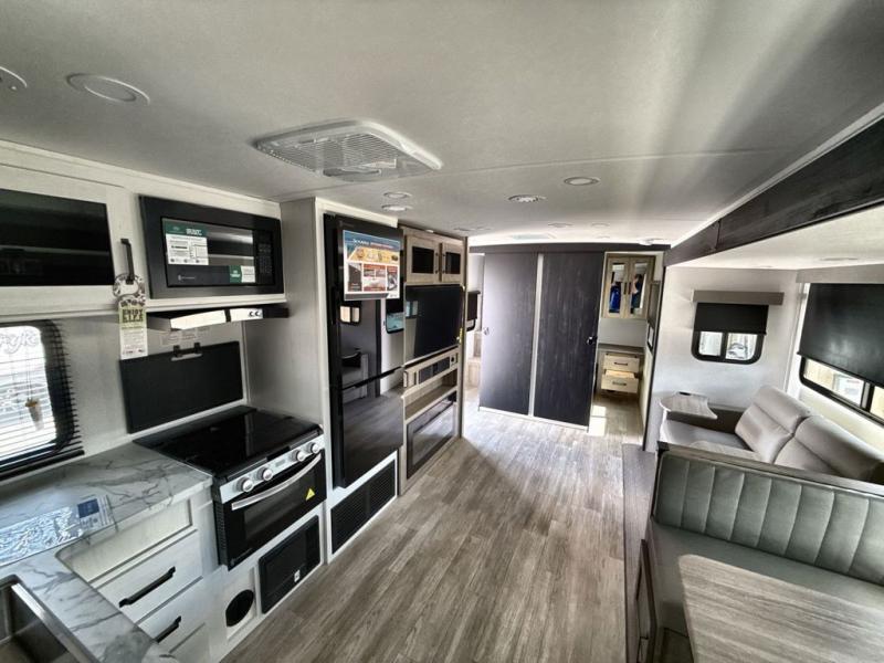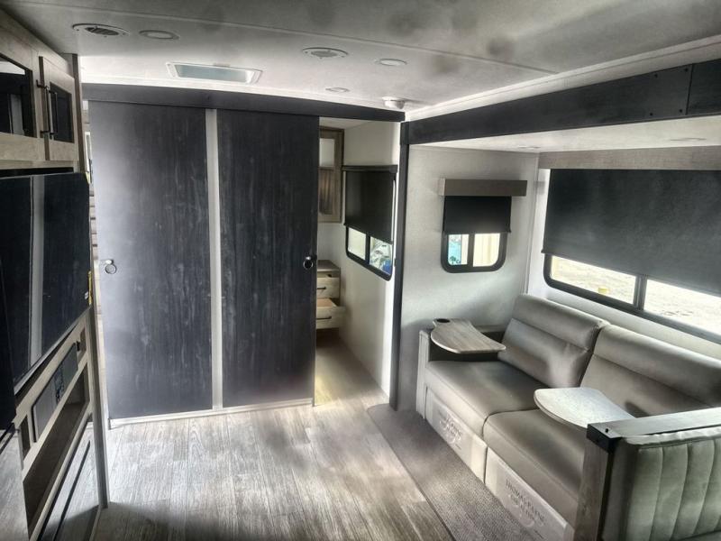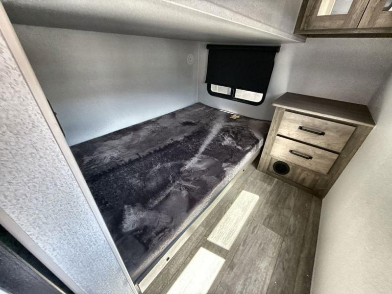 Whether you are looking for a bunkhouse, a private bedroom, or dual entry doors in your next RV, this one might just be the perfect fit with all those features! There are 45" x 72" bunk beds, each with their own wardrobe and their own private entry door, making it perfect for camping with older kids. The galley kitchen offers amenities such as a microwave, cooktop, an 11 cu. ft. refrigerator, and an L-shaped counter for preparing and serving meals. You will also find more storage, an entertainment center and a slide out sofa sleeper and booth dinette that offer more sleeping space when needed.
