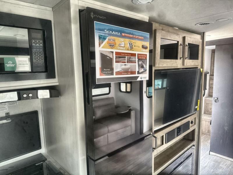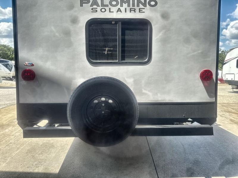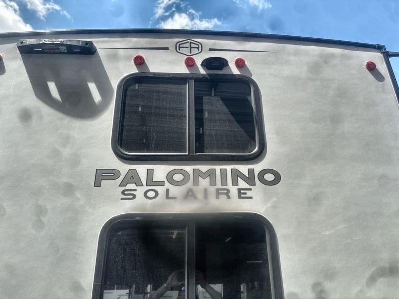 Each SolAire travel trailer by Palomino features a white gel coat exterior and an aluminum superstructure frame for lightweight towing. You will love having a power tongue jack for easy set up, plus slam latch baggage doors with magnets to make unloading easier than ever. There is also a power awning with LED lights and aluminum wheels included on the exterior. Each SolAire is constructed to last with Azdel composite, a fully laminated rear wall and roof, plus a fully enclosed and heated underbelly. The interior includes roller shades and kitchen backsplash, USB ports to keep your electronics charged, a Bluetooth stereo with speakers, and many more stand-out features!