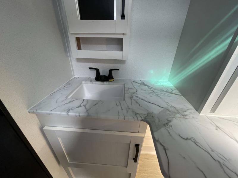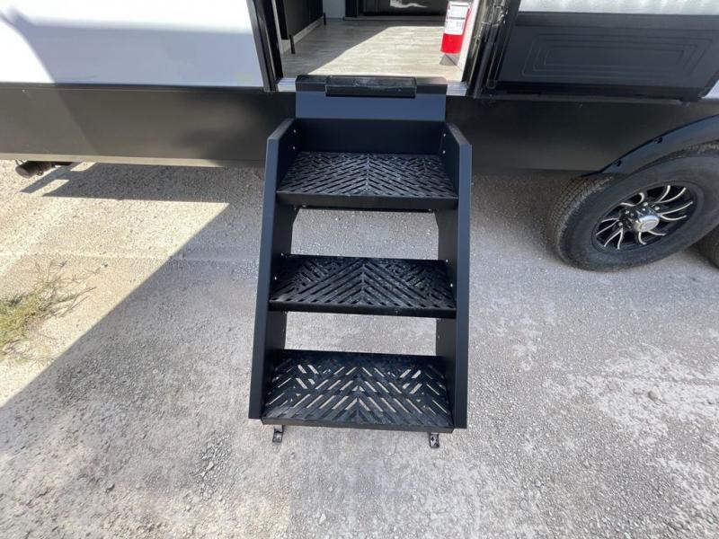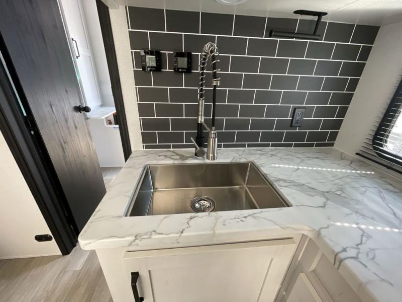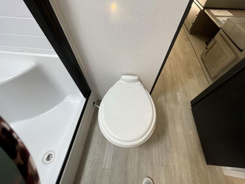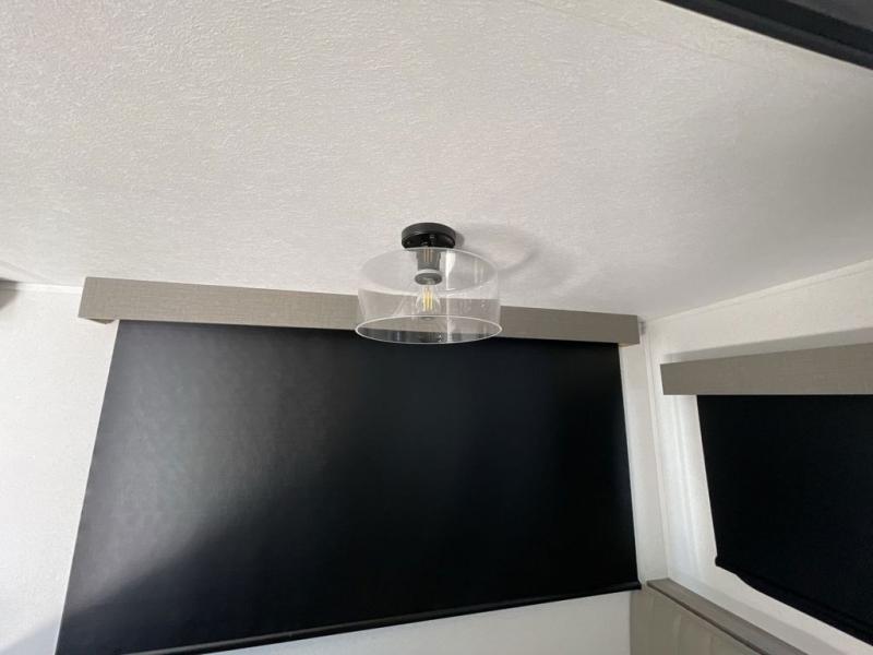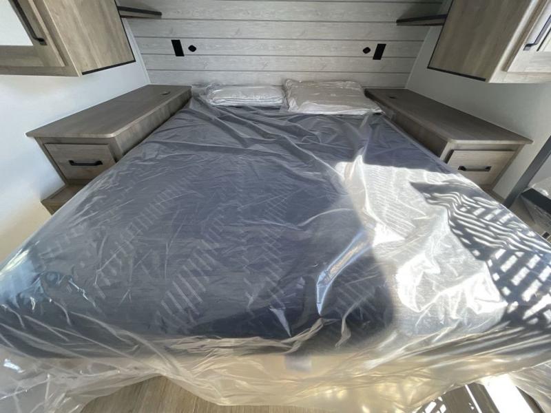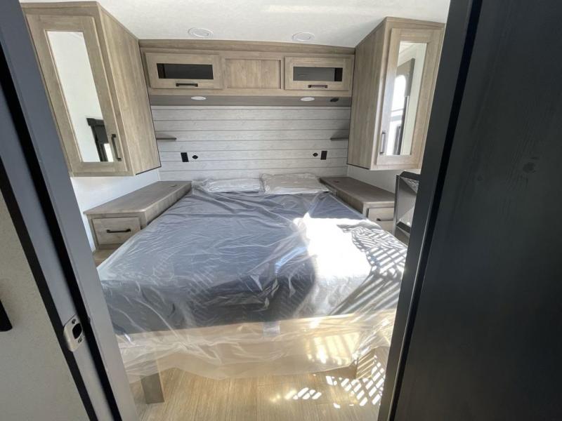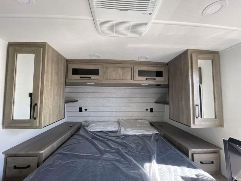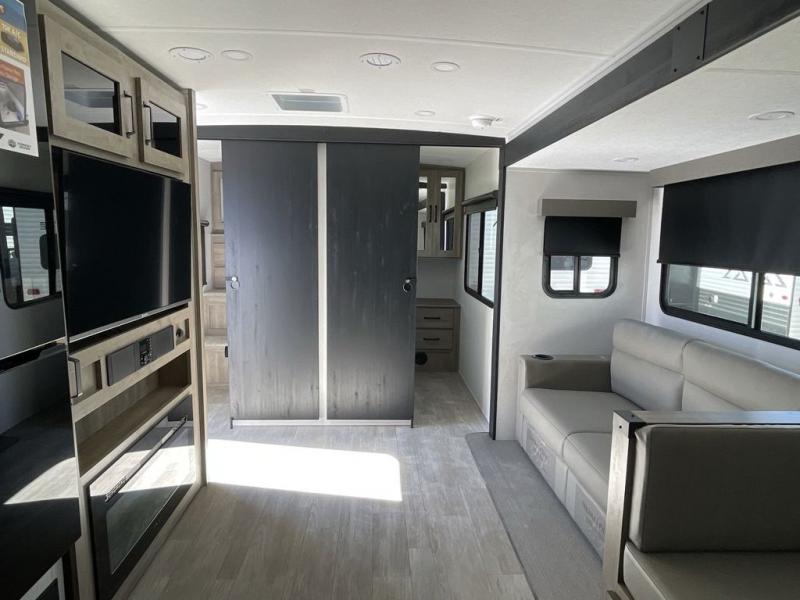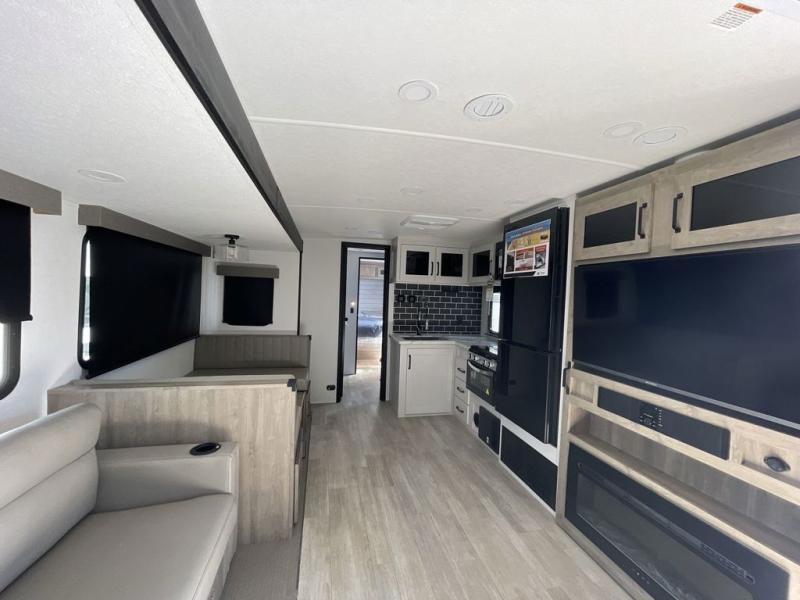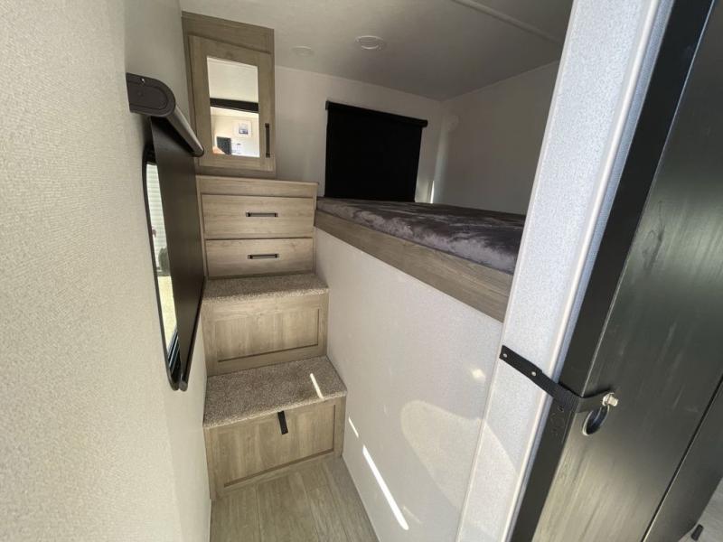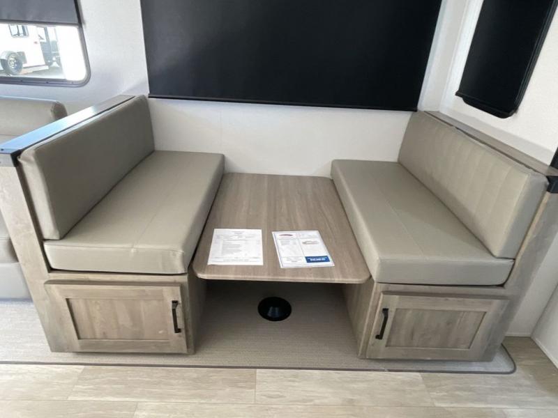 Whether you are looking for a bunkhouse, a private bedroom, or dual entry doors in your next RV, this one might just be the perfect fit with all those features! There are 45" x 72" bunk beds, each with their own wardrobe and their own private entry door, making it perfect for camping with older kids. The galley kitchen offers amenities such as a microwave, cooktop, an 11 cu. ft. refrigerator, and an L-shaped counter for preparing and serving meals. You will also find more storage, an entertainment center and a slide out sofa sleeper and booth dinette that offer more sleeping space when needed.