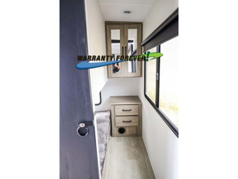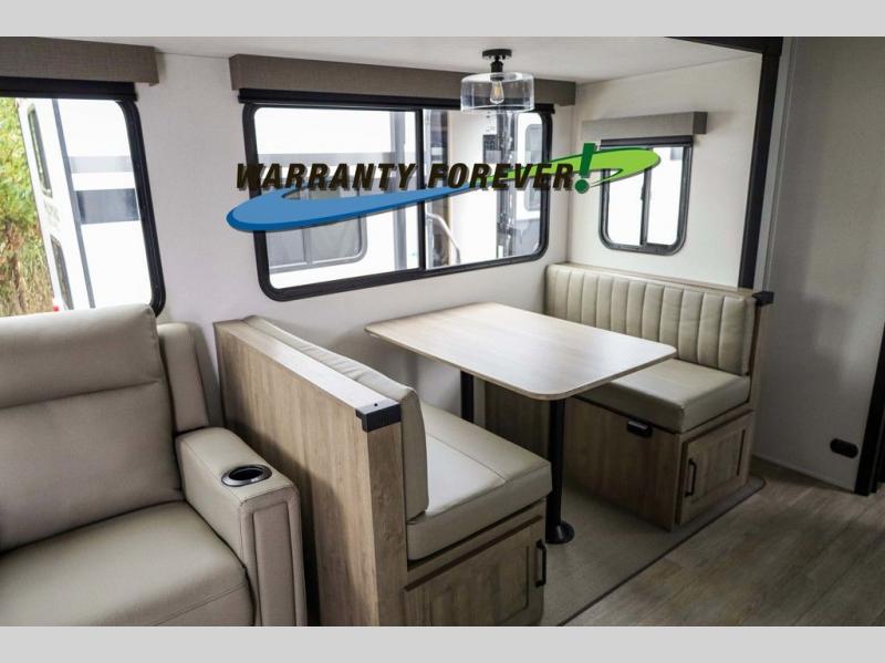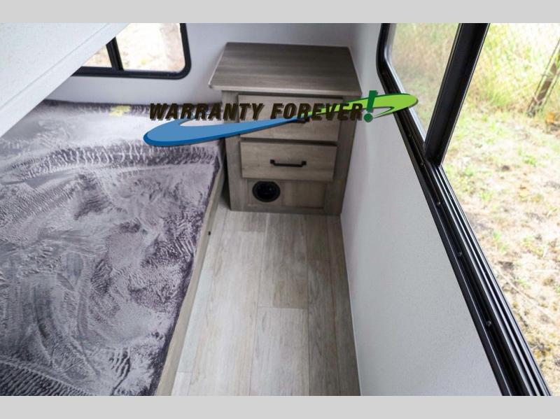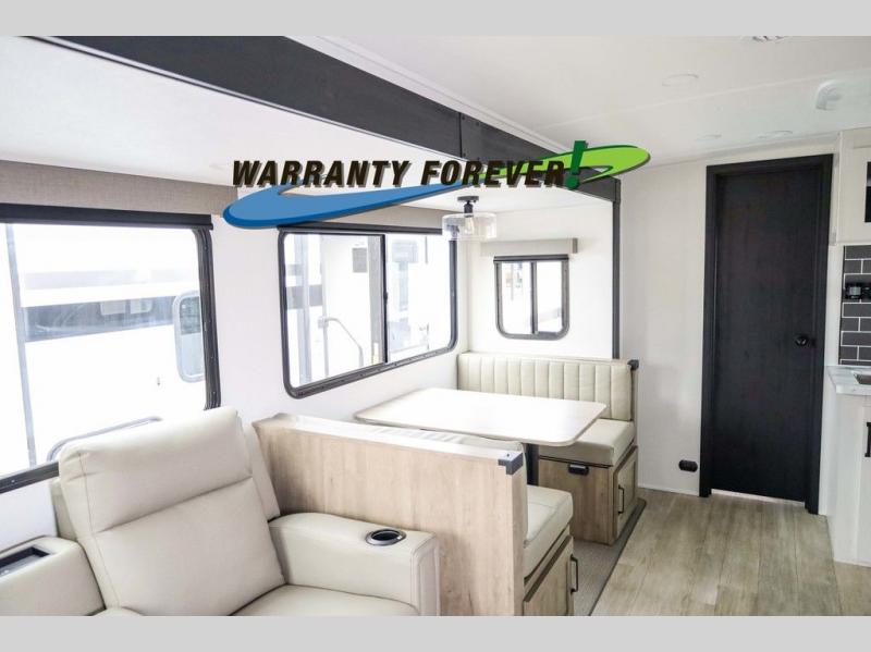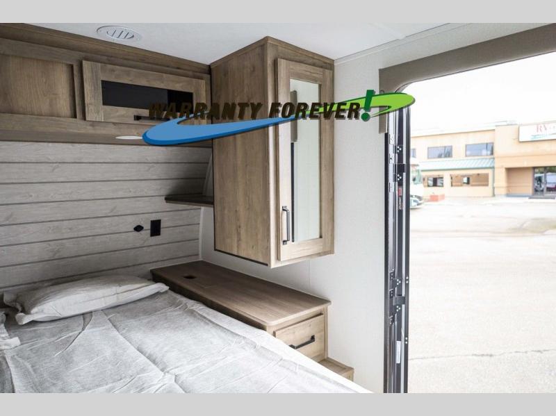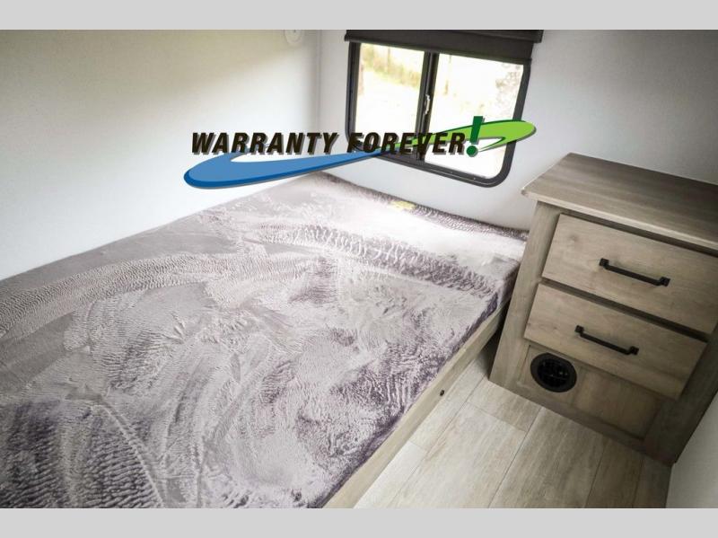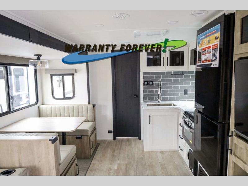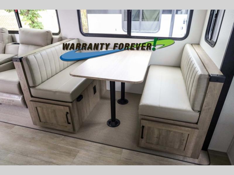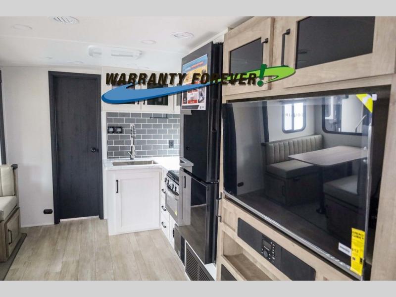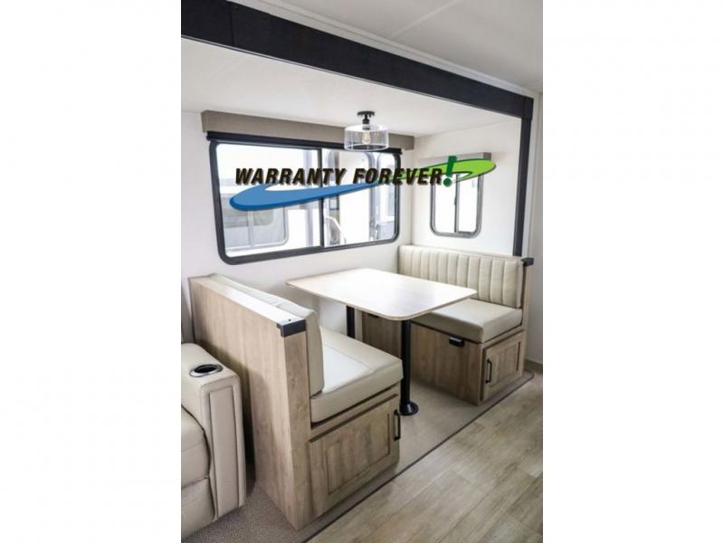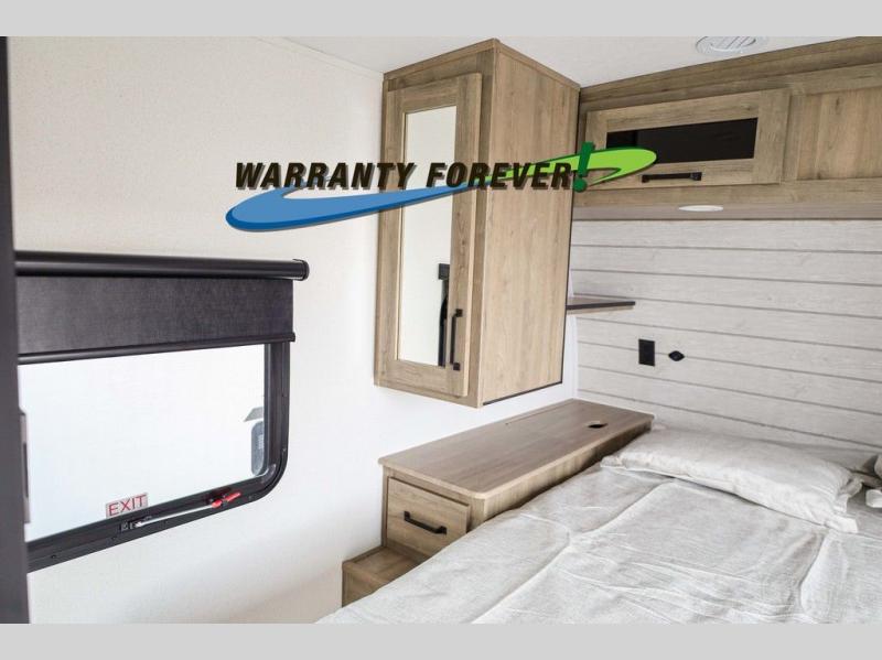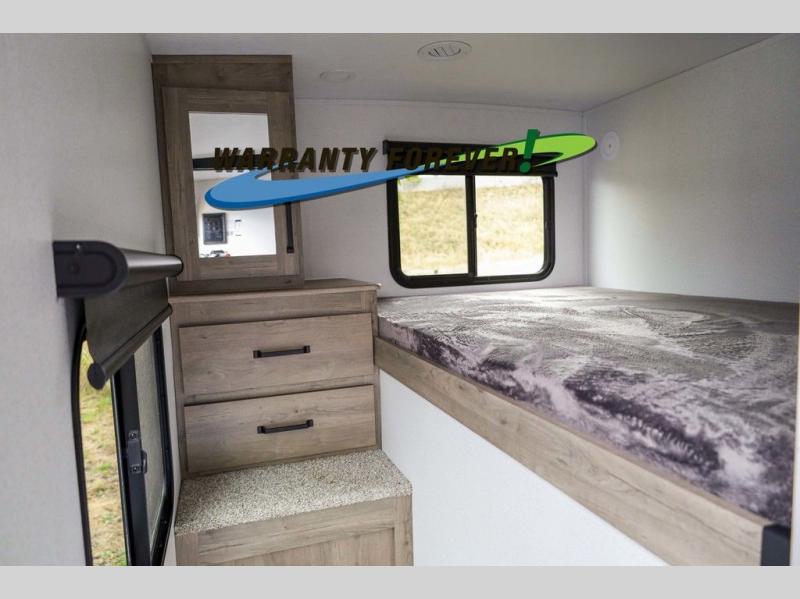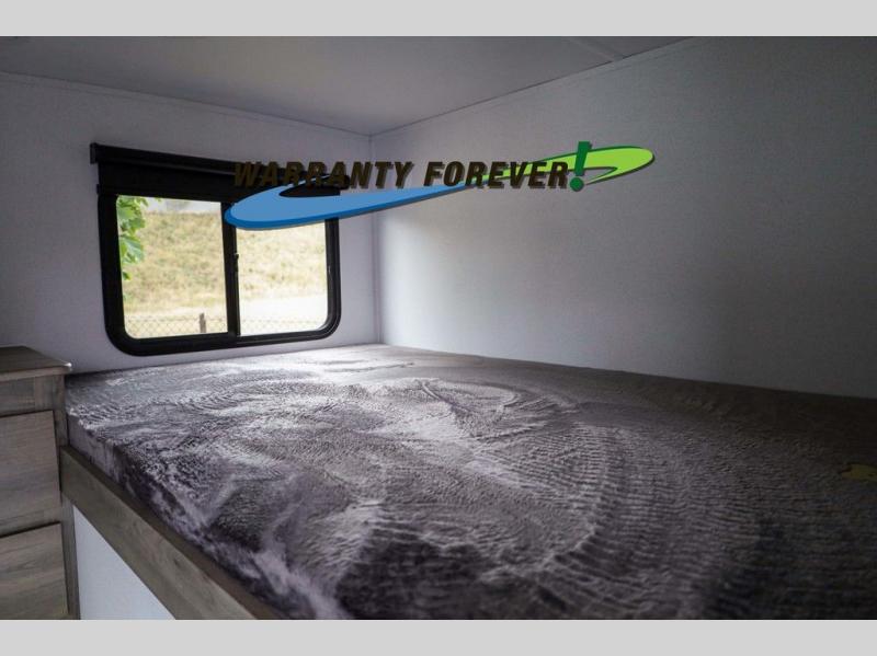 Whether you are looking for a bunkhouse, a private bedroom, or dual entry doors in your next RV, this one might just be the perfect fit with all those features! There are 45" x 72" bunk beds, each with their own wardrobe and their own private entry door, making it perfect for camping with older kids. The galley kitchen offers amenities such as a microwave, cooktop, an 11 cu. ft. refrigerator, and an L-shaped counter for preparing and serving meals. You will also find more storage, an entertainment center and a slide out sofa sleeper and booth dinette that offer more sleeping space when needed.