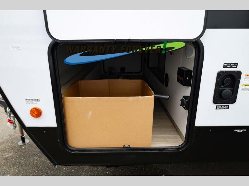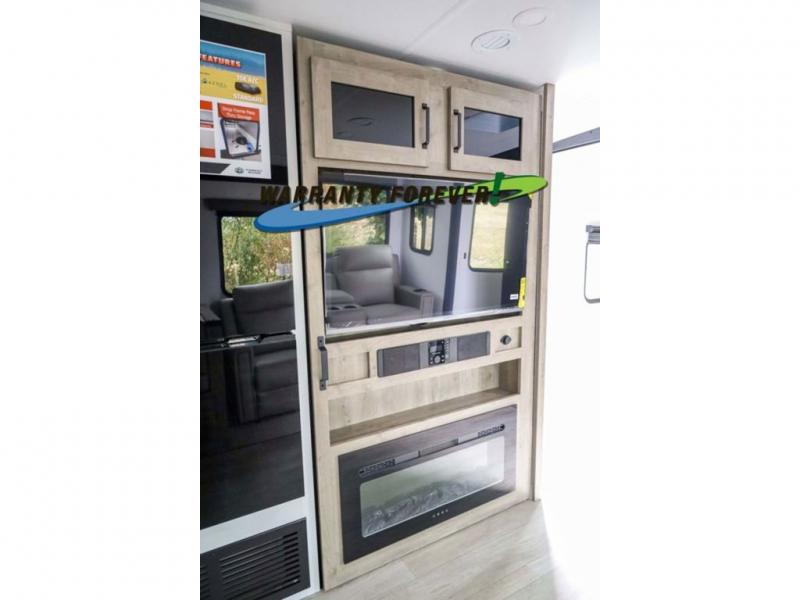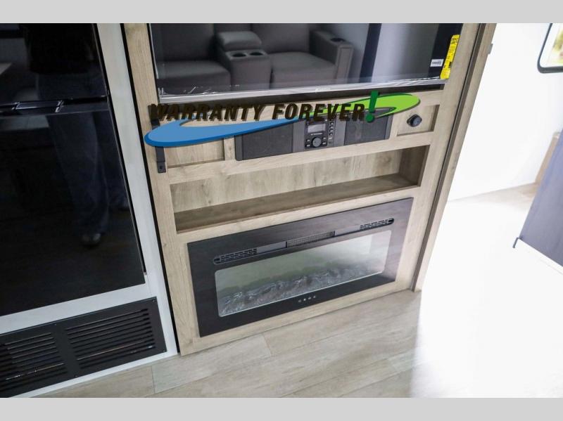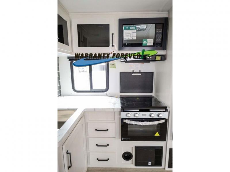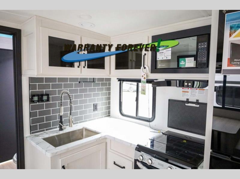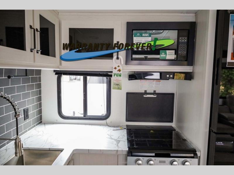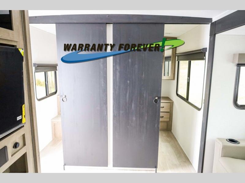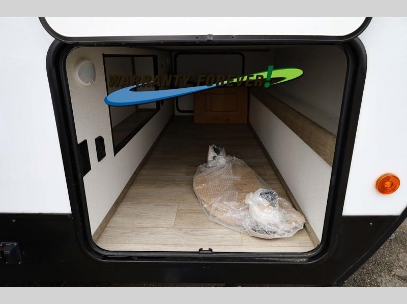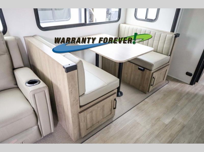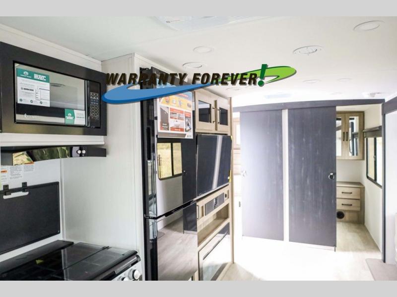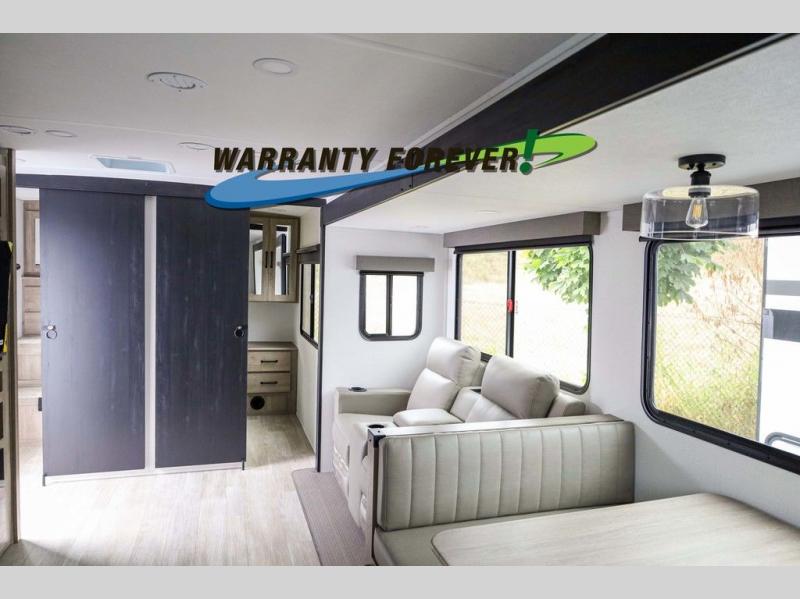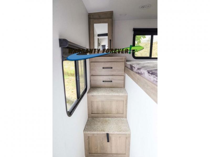 Whether you are looking for a bunkhouse, a private bedroom, or dual entry doors in your next RV, this one might just be the perfect fit with all those features! There are 45" x 72" bunk beds, each with their own wardrobe and their own private entry door, making it perfect for camping with older kids. The galley kitchen offers amenities such as a microwave, cooktop, an 11 cu. ft. refrigerator, and an L-shaped counter for preparing and serving meals. You will also find more storage, an entertainment center and a slide out sofa sleeper and booth dinette that offer more sleeping space when needed.