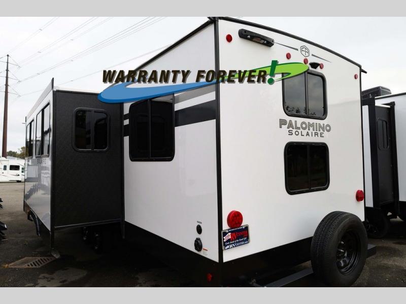 Each SolAire travel trailer by Palomino features a white gel coat exterior and an aluminum superstructure frame for lightweight towing. You will love having a power tongue jack for easy set up, plus slam latch baggage doors with magnets to make unloading easier than ever. There is also a power awning with LED lights and aluminum wheels included on the exterior. Each SolAire is constructed to last with Azdel composite, a fully laminated rear wall and roof, plus a fully enclosed and heated underbelly. The interior includes roller shades and kitchen backsplash, USB ports to keep your electronics charged, a Bluetooth stereo with speakers, and many more stand-out features!