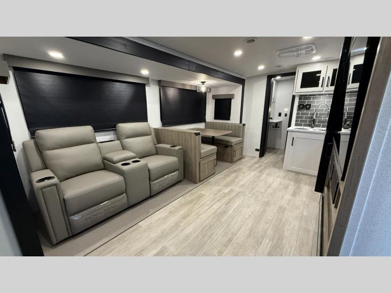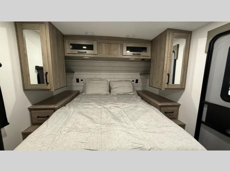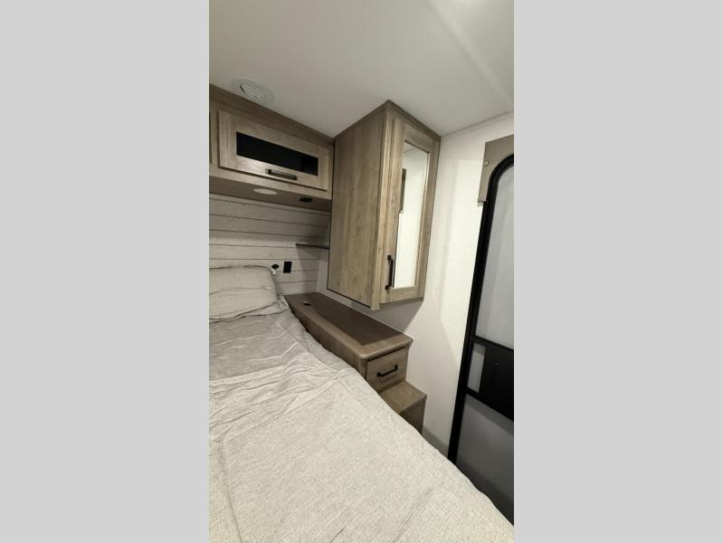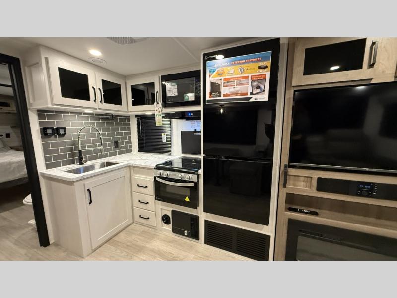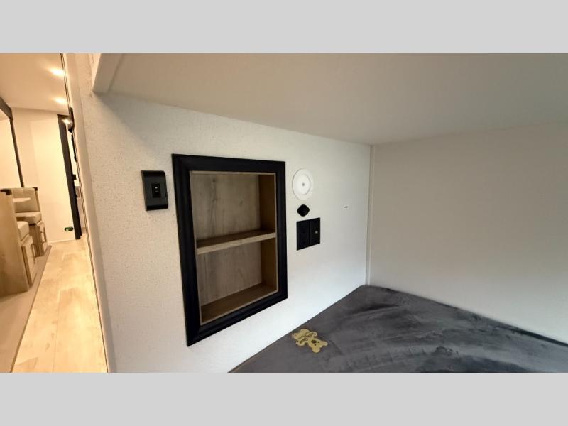 Whether you are looking for a bunkhouse, a private bedroom, or dual entry doors in your next RV, this one might just be the perfect fit with all those features! There are 45" x 72" bunk beds, each with their own wardrobe and their own private entry door, making it perfect for camping with older kids. The galley kitchen offers amenities such as a microwave, cooktop, an 11 cu. ft. refrigerator, and an L-shaped counter for preparing and serving meals. You will also find more storage, an entertainment center and a slide out sofa sleeper and booth dinette that offer more sleeping space when needed.