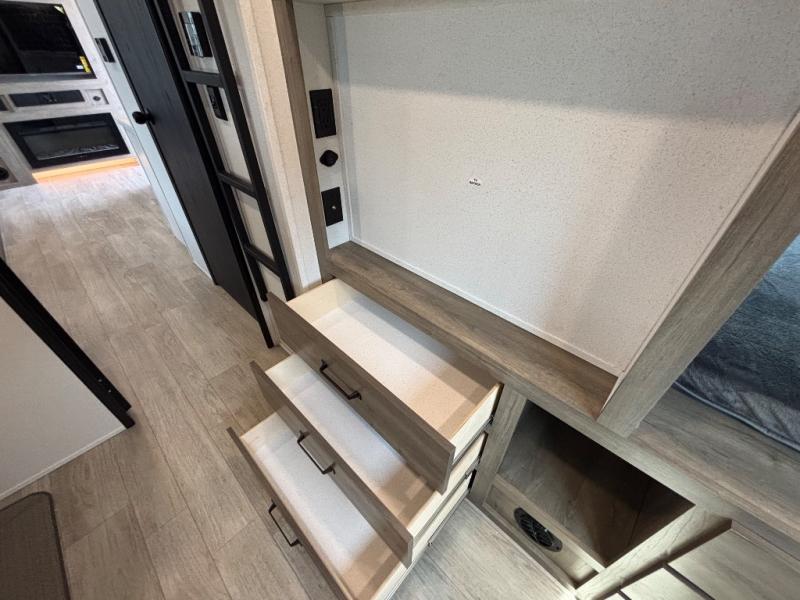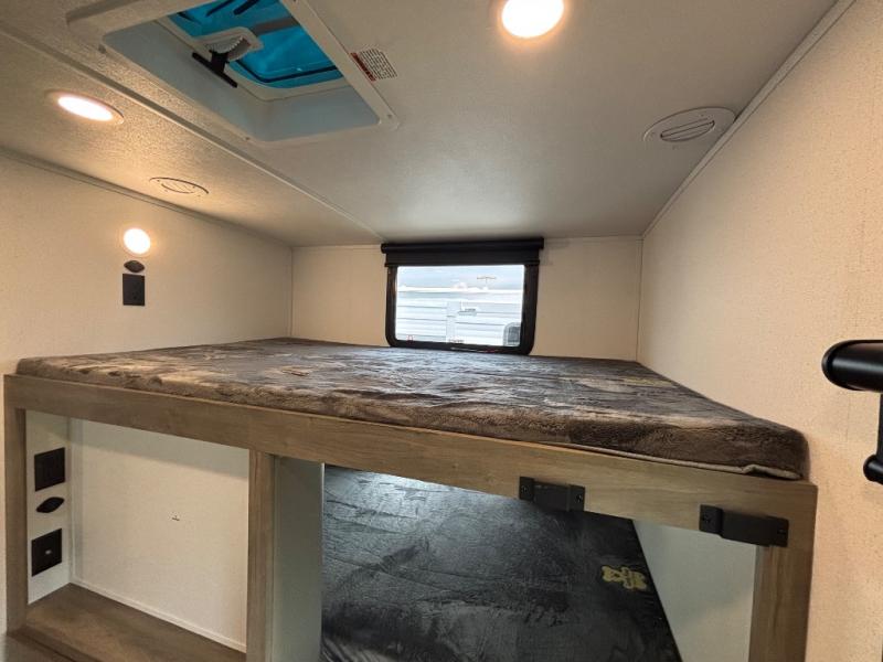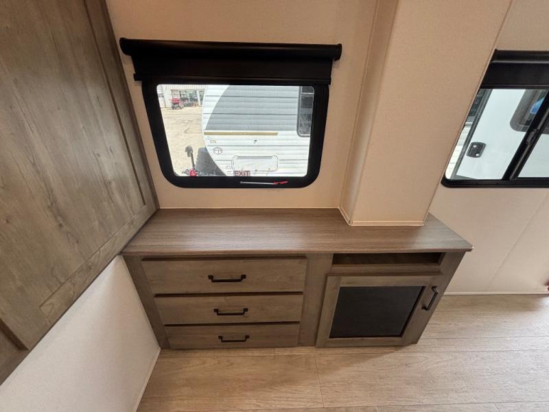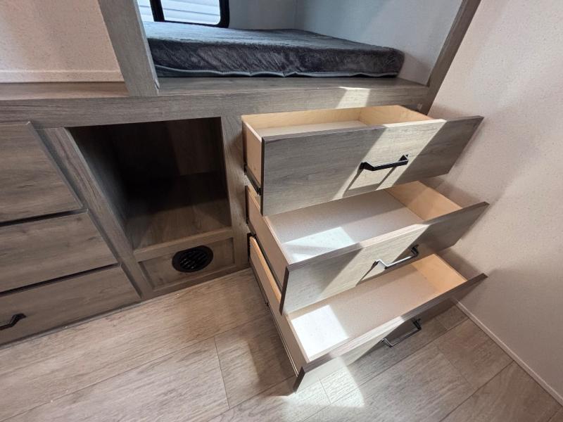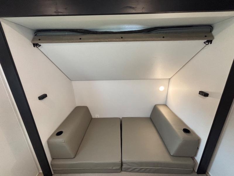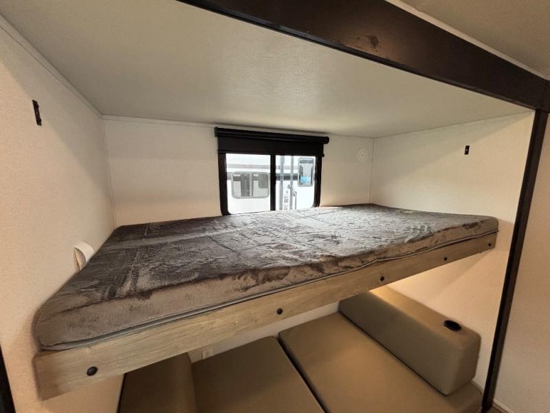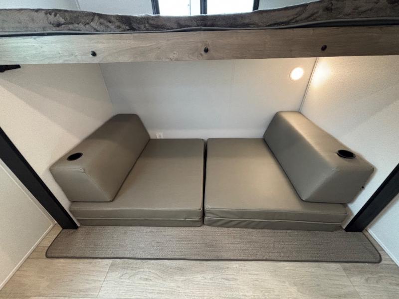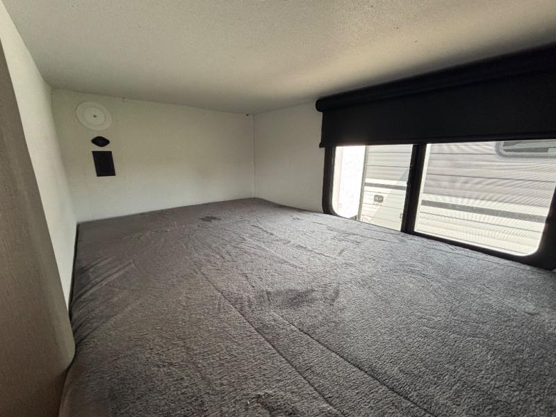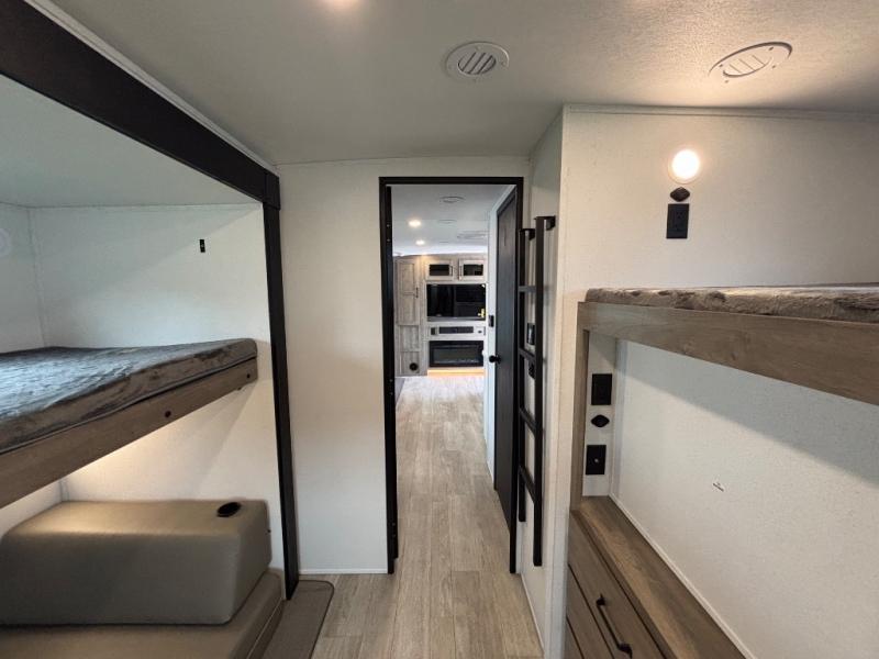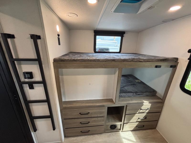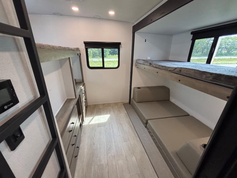 This travel trailer offers so many features that you will love, from a private bunkhouse for overnight guests to having three slide outs giving you a spacious interior throughout! The bunkhouse includes triple bunks, a double-size day bed, and storage space for your guests' things. The full bathroom is centrally located for all to access from the main living and kitchen area where you will find a slide out that includes a booth dinette and a sofa sleeper. The cook will love the kitchen amenities such as the microwave, cooktop, 11 cu. ft. refrigerator, and the L-shaped counter for preparing and serving meals. And don't overlook the front private bedroom with its king bed slide out, dresser, closet, plus a second bedroom closet with washer and dryer prep!